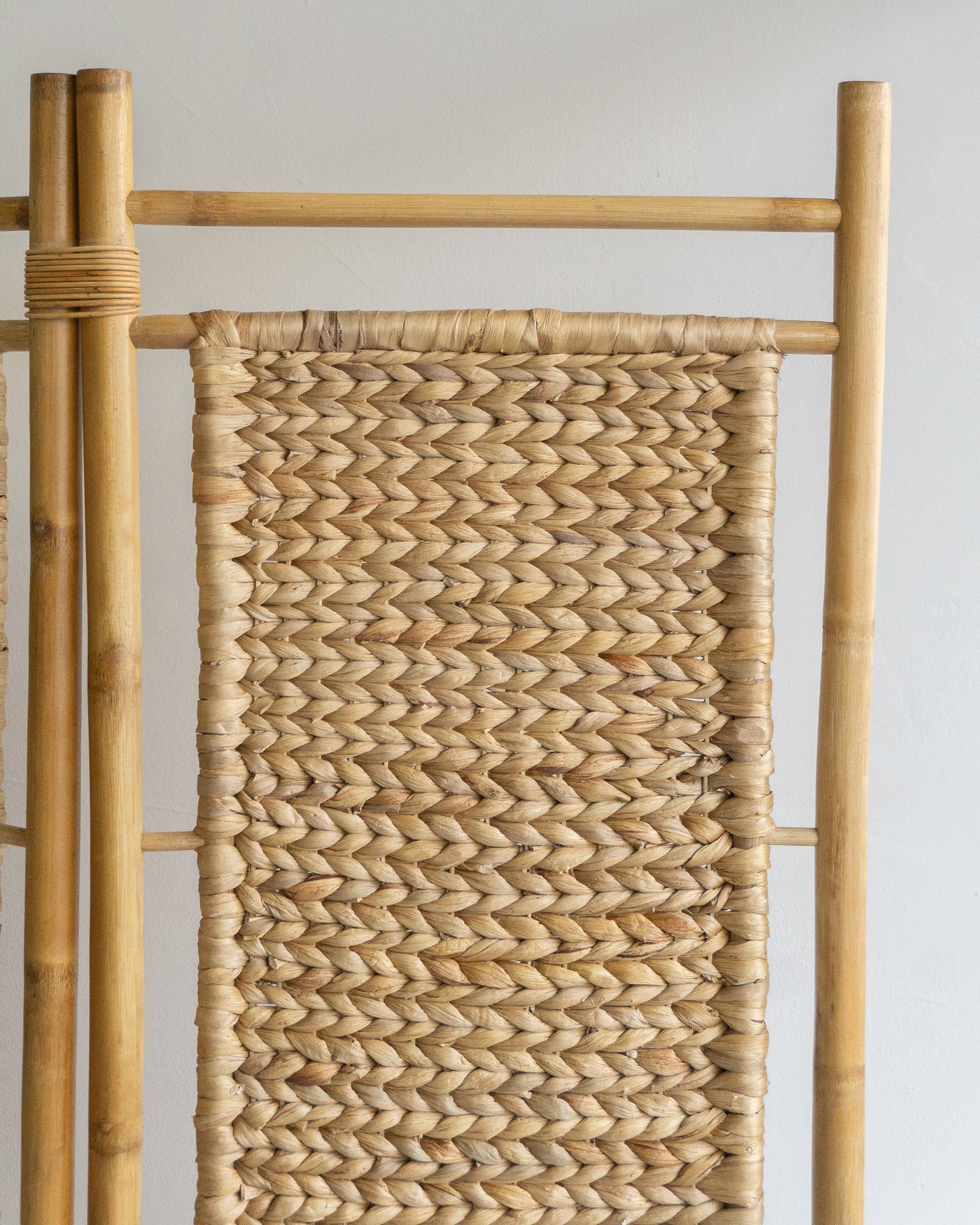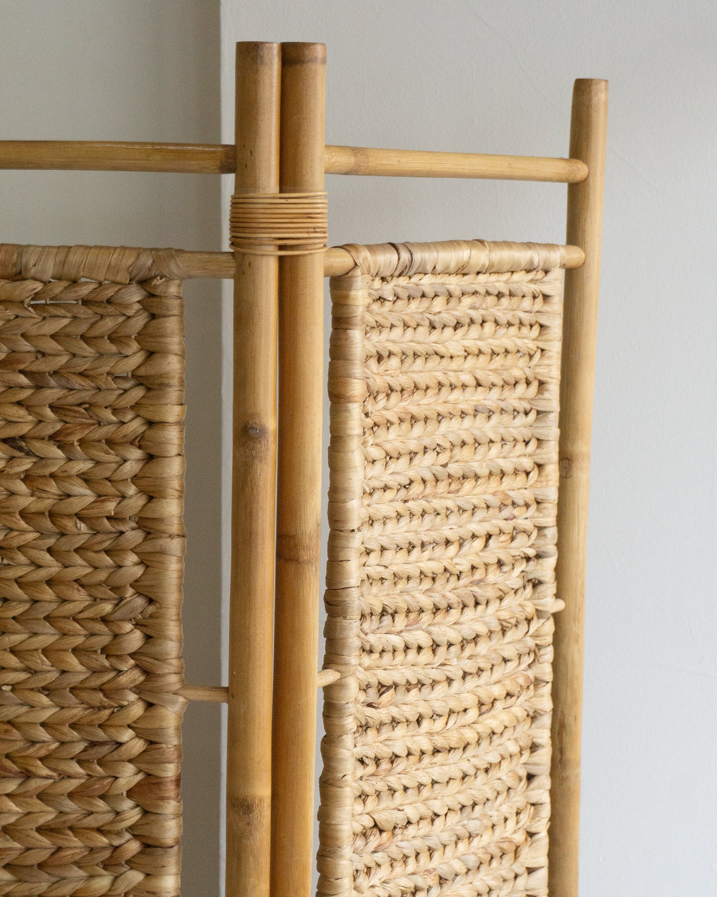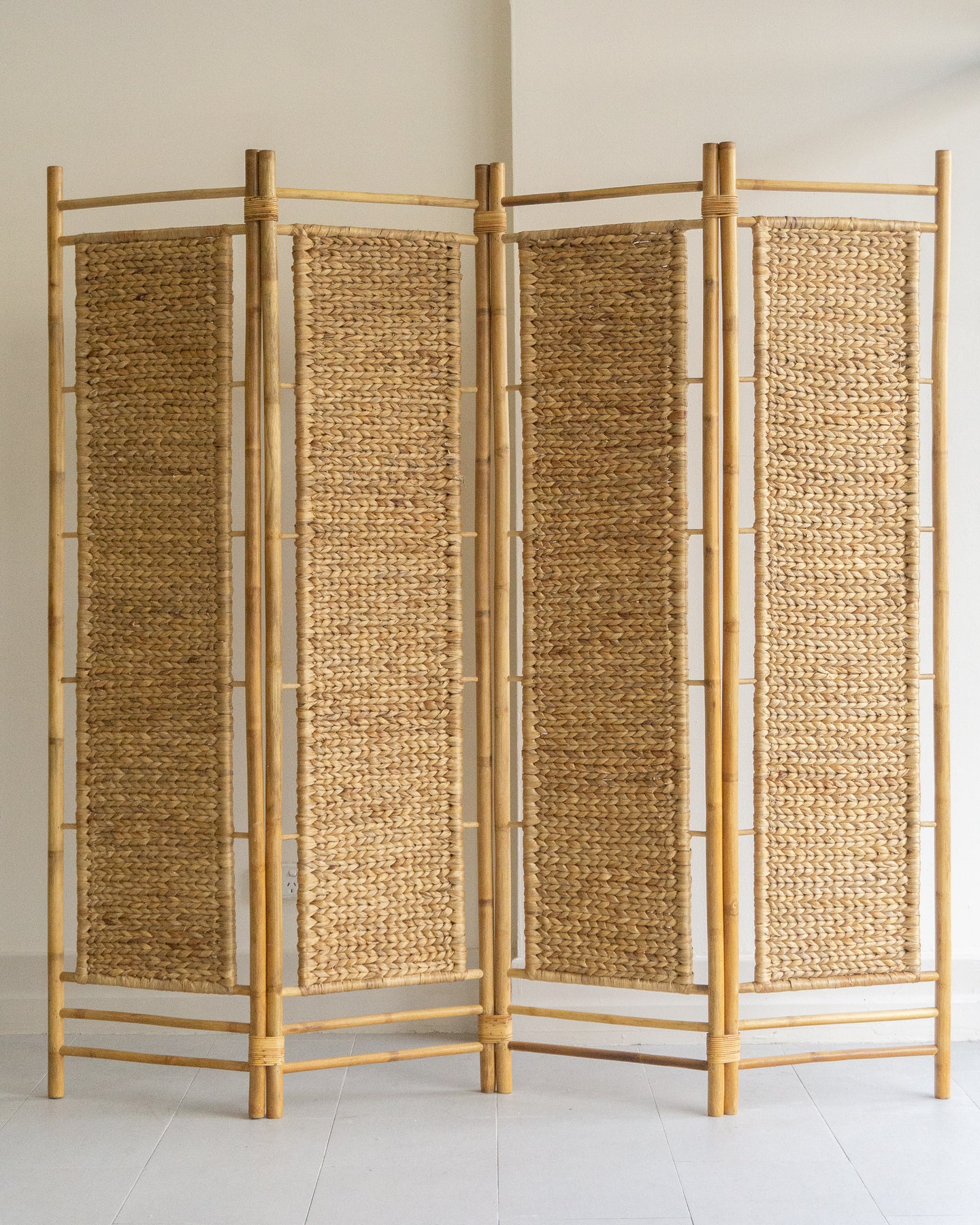 Vintage cane room divider with four patterned weave panels and cane bindings