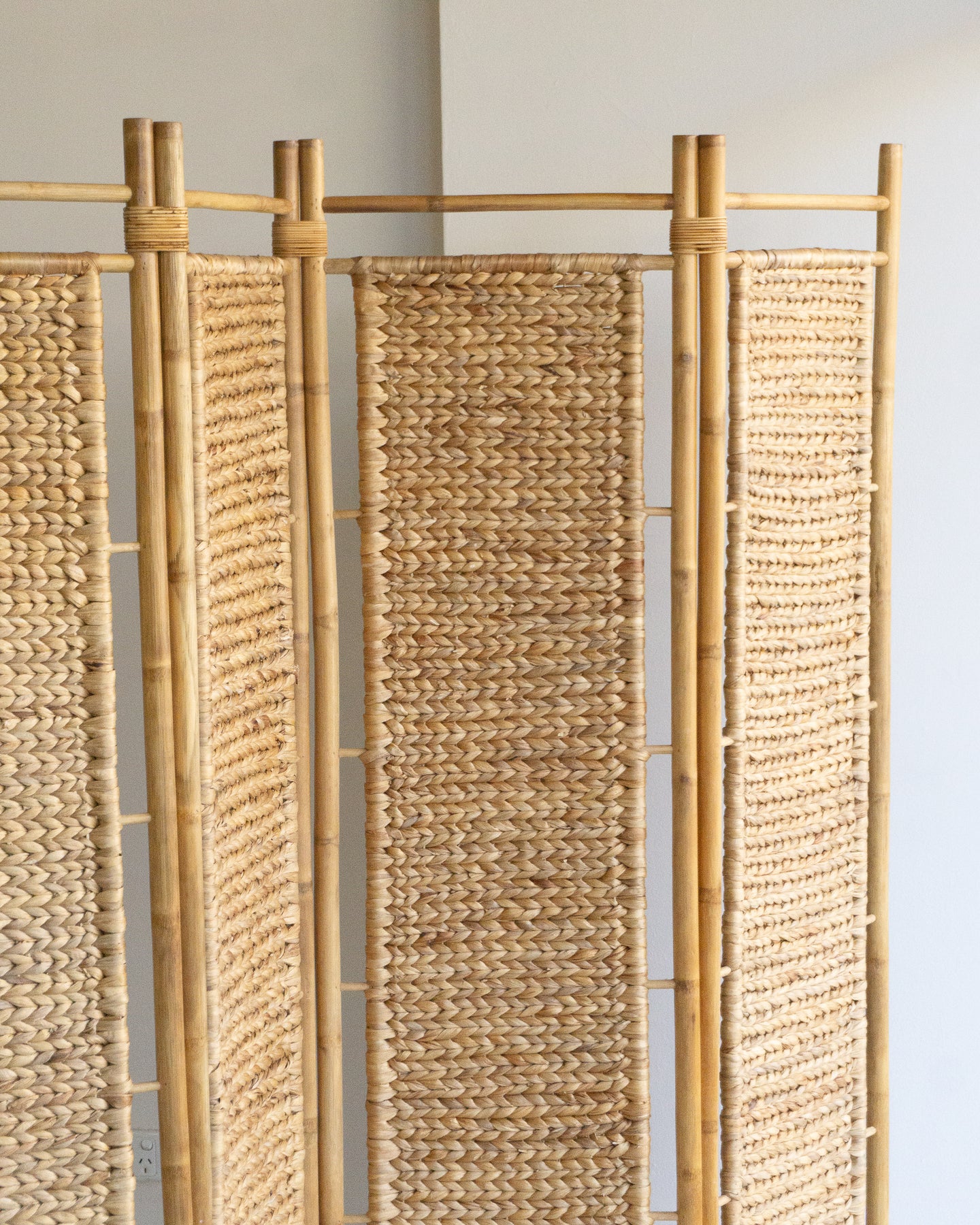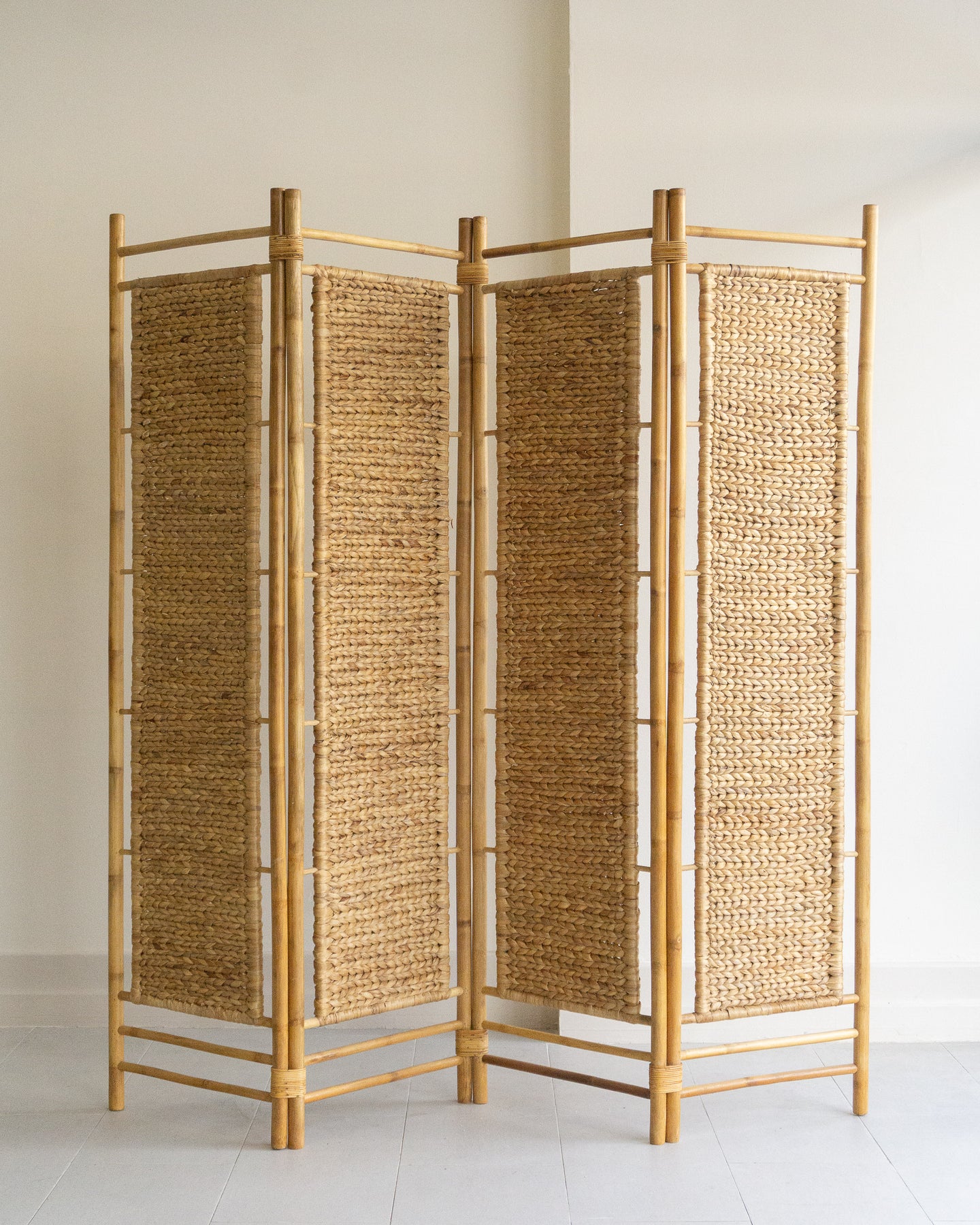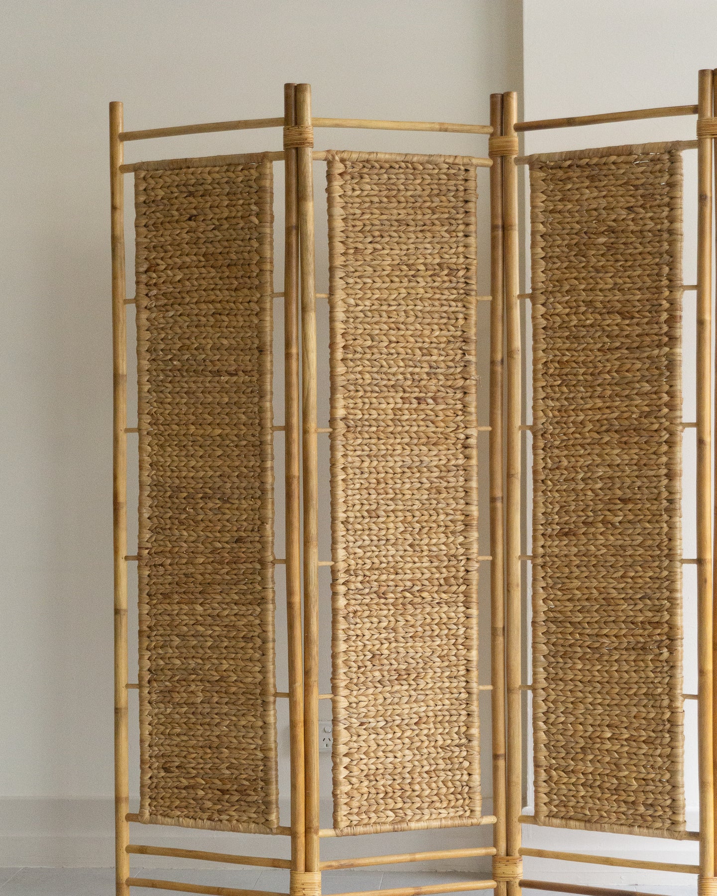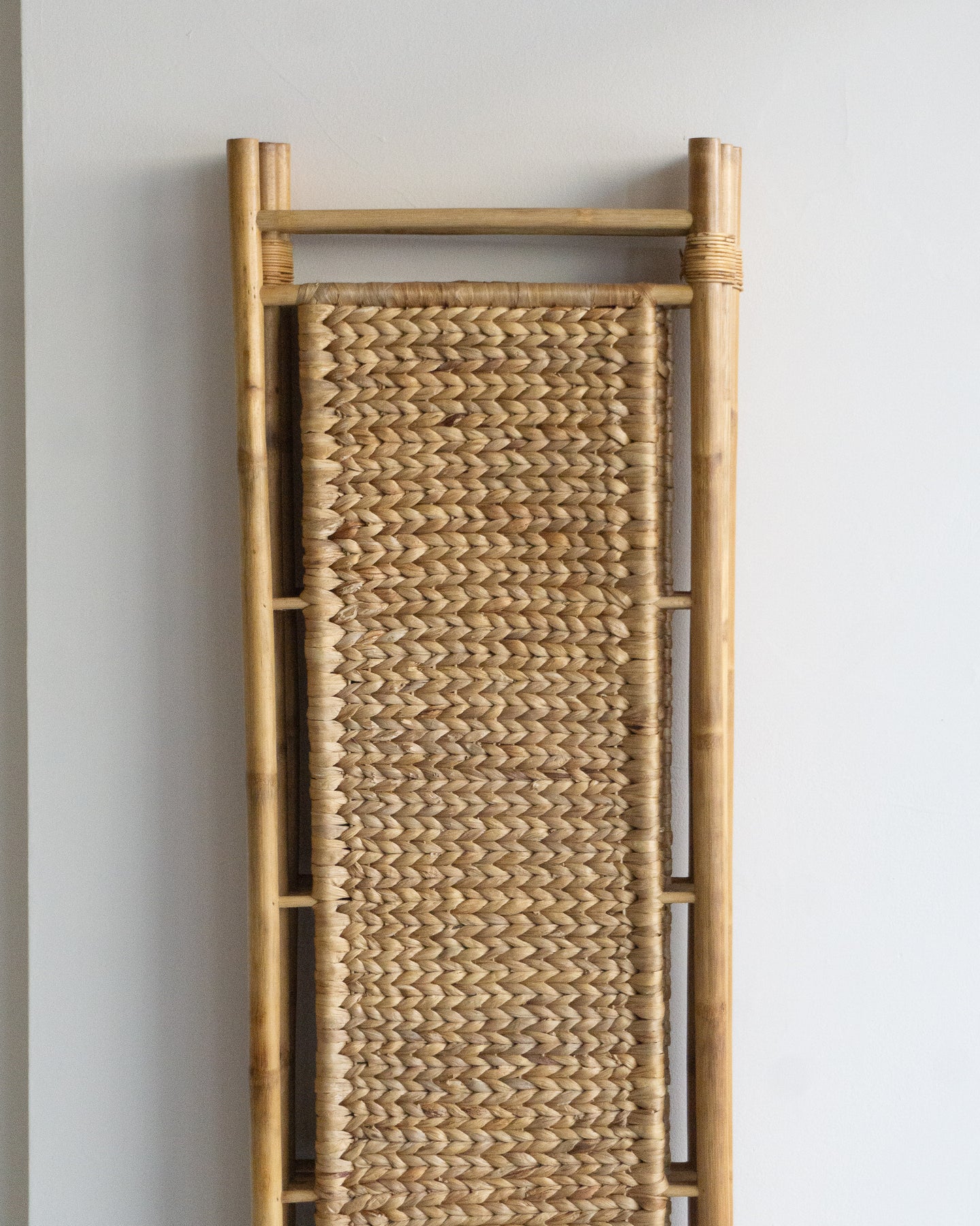 Vintage cane room divider with four patterned weave panels and cane bindings