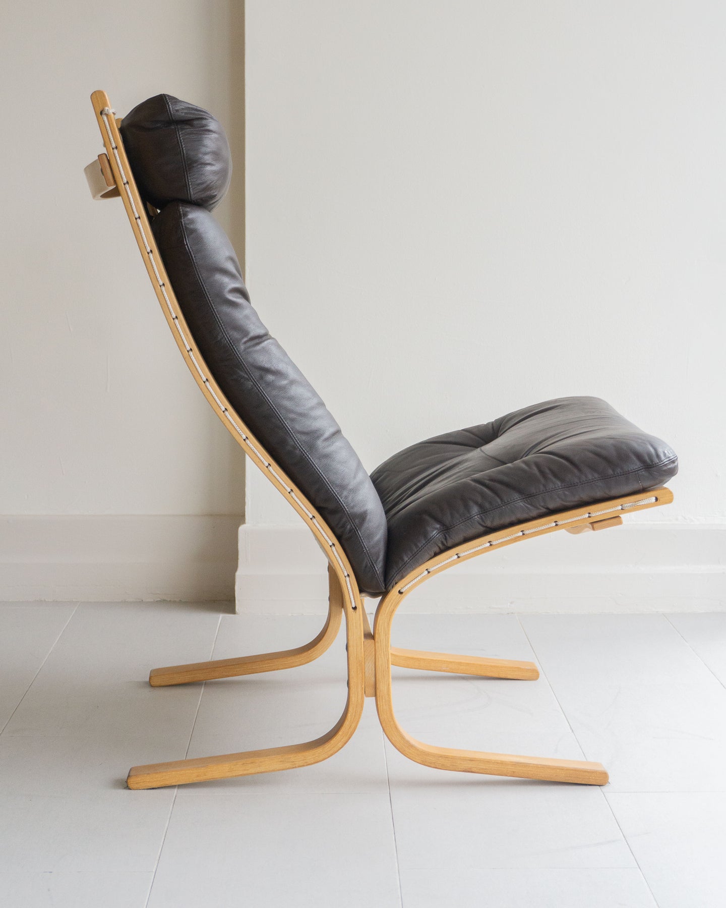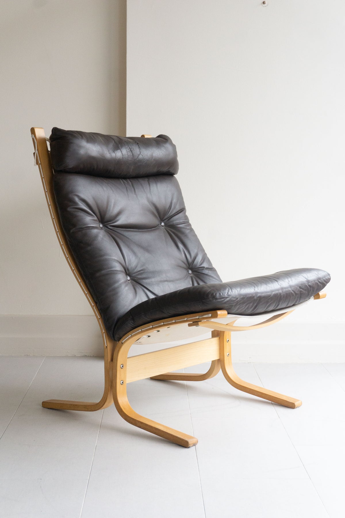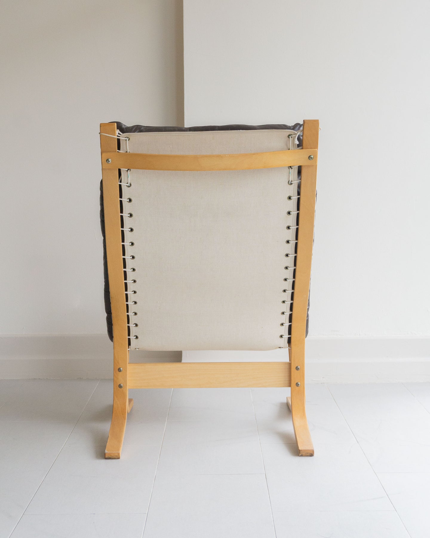 High-back lounge chair by Ingmar Relling for Westnofa. Features a canvas sling with leather cushion on a beech bentwood frame. Made in Norway