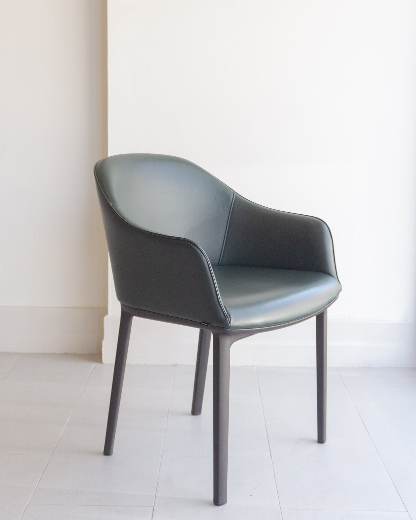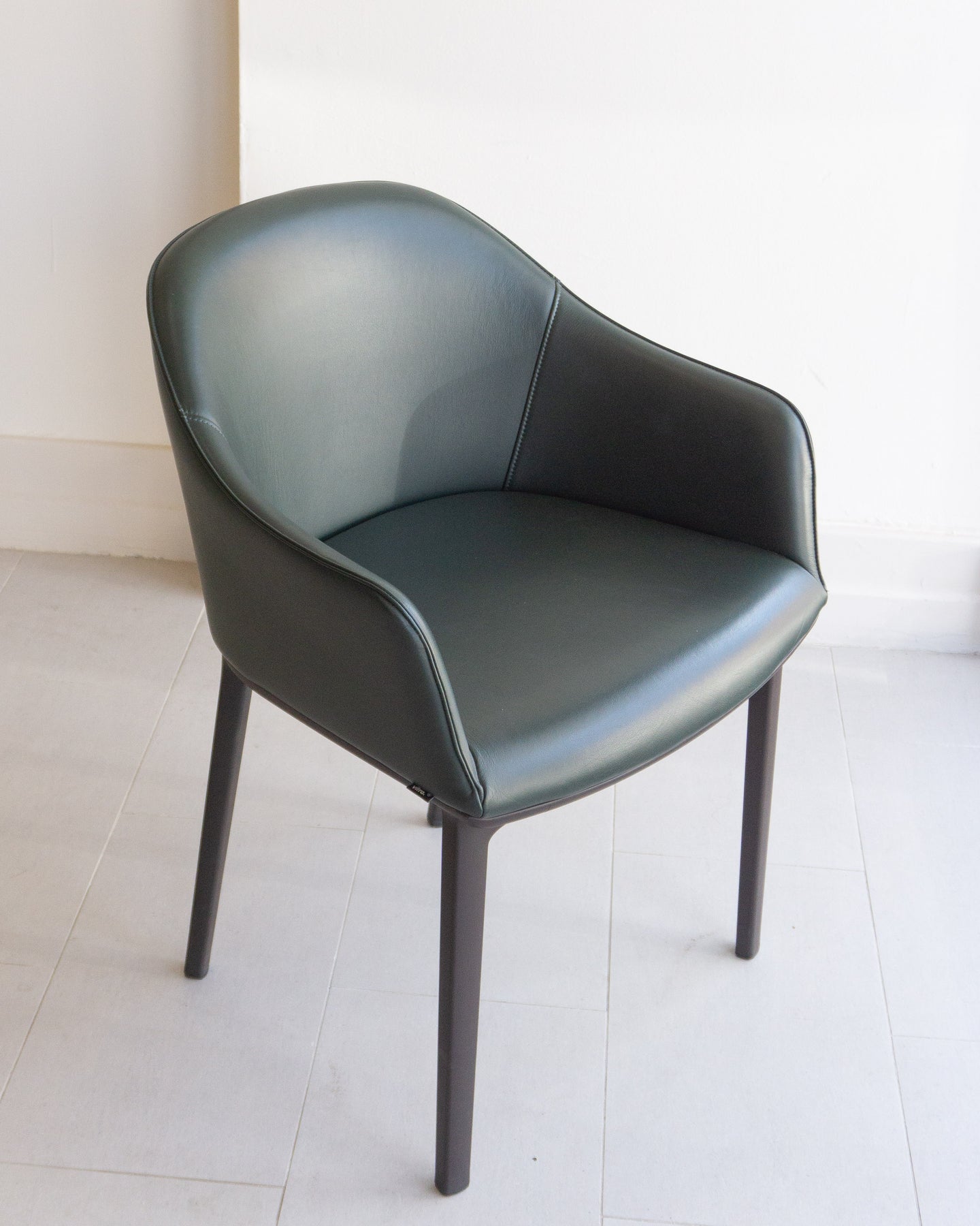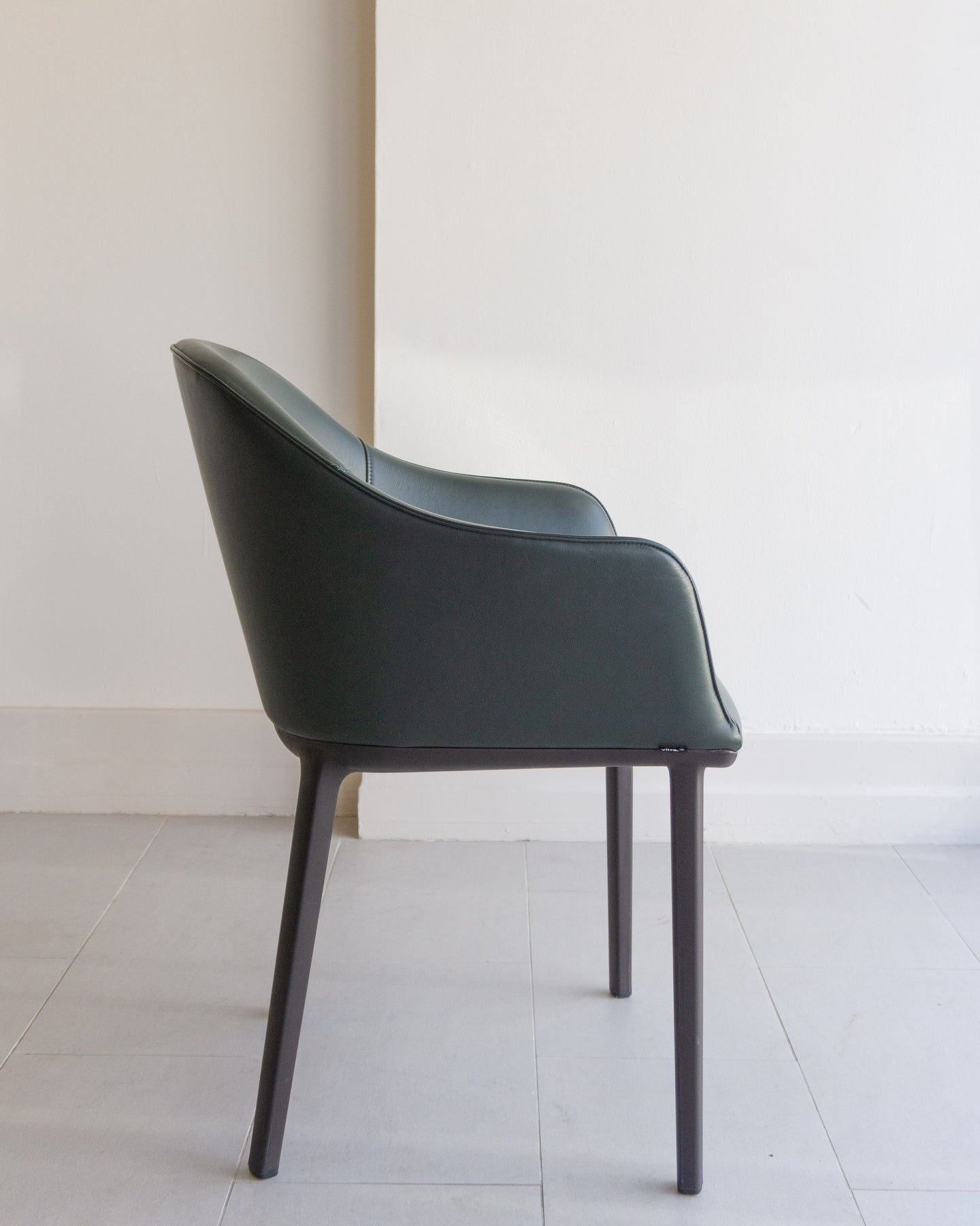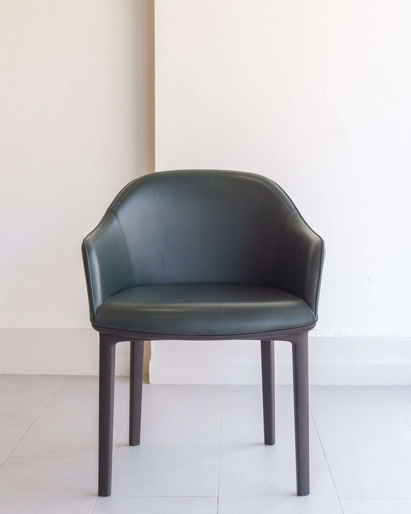 The Softshell Chair designed by Ronan and Erwan Bouroullec in 2008 for Vitra, featuring a flexible upper backrest with internal vertical ribs that accommodate to the user, providing a great level of comfort, the shell and foam cushion is upholstered in premium Jade coloured leather.