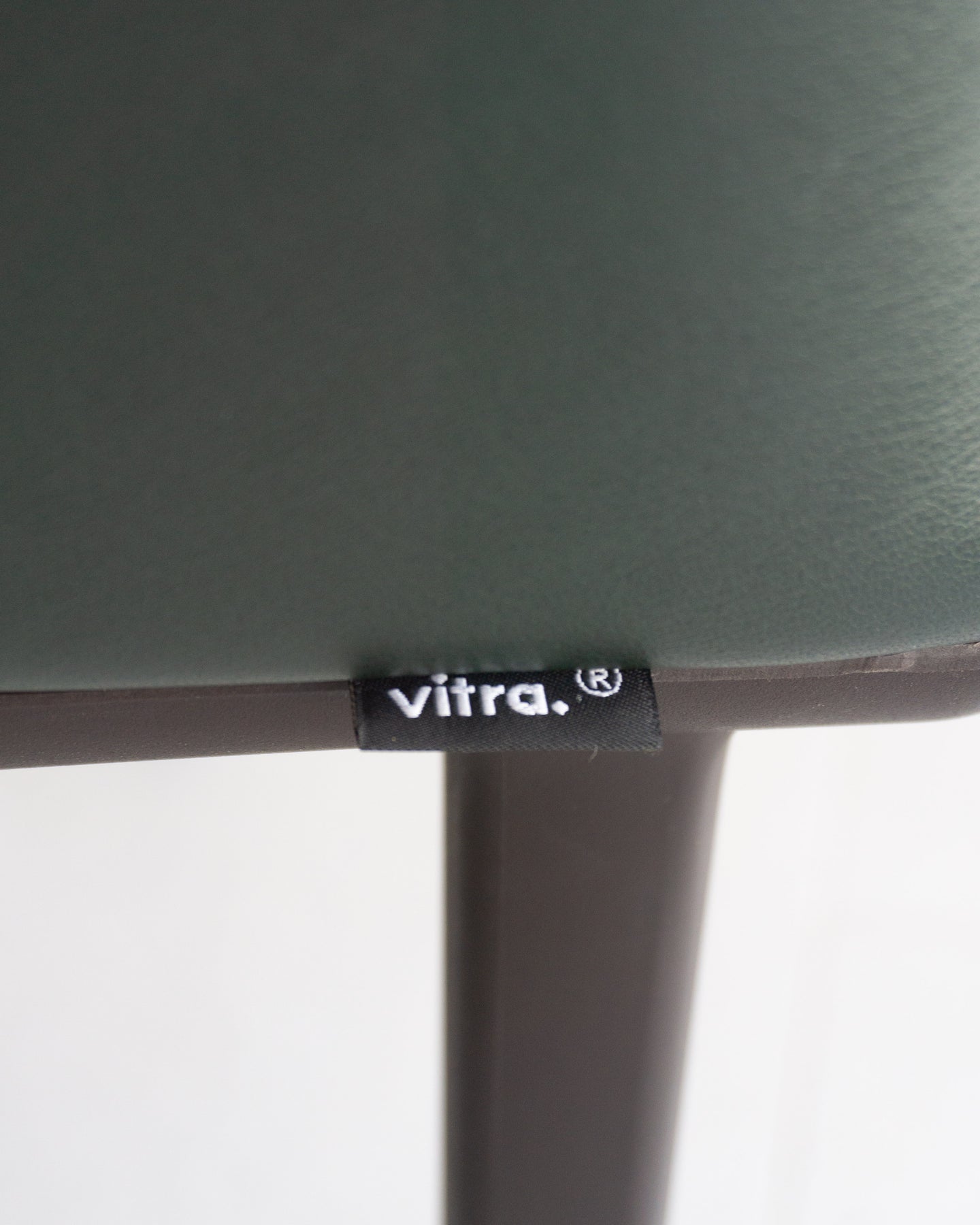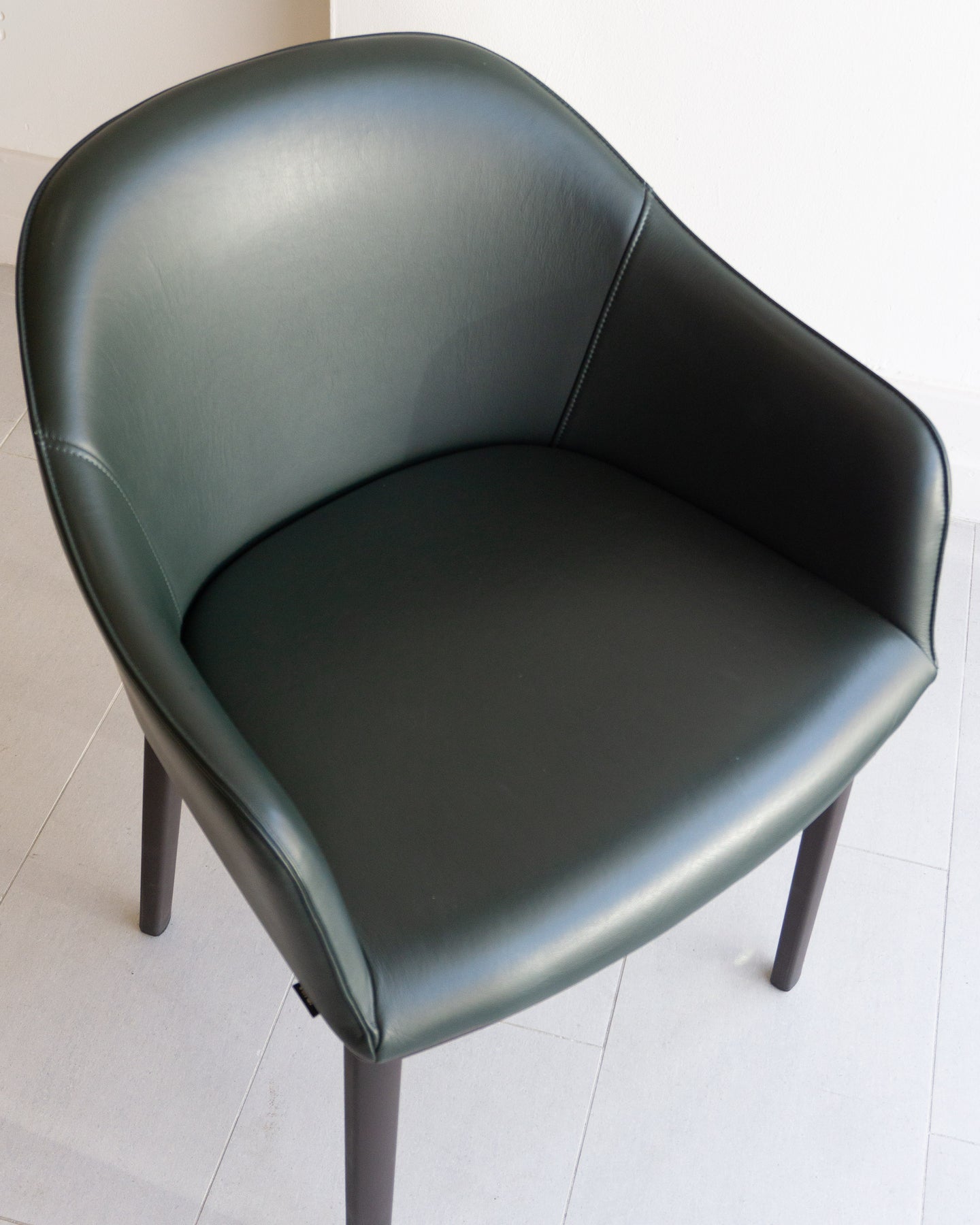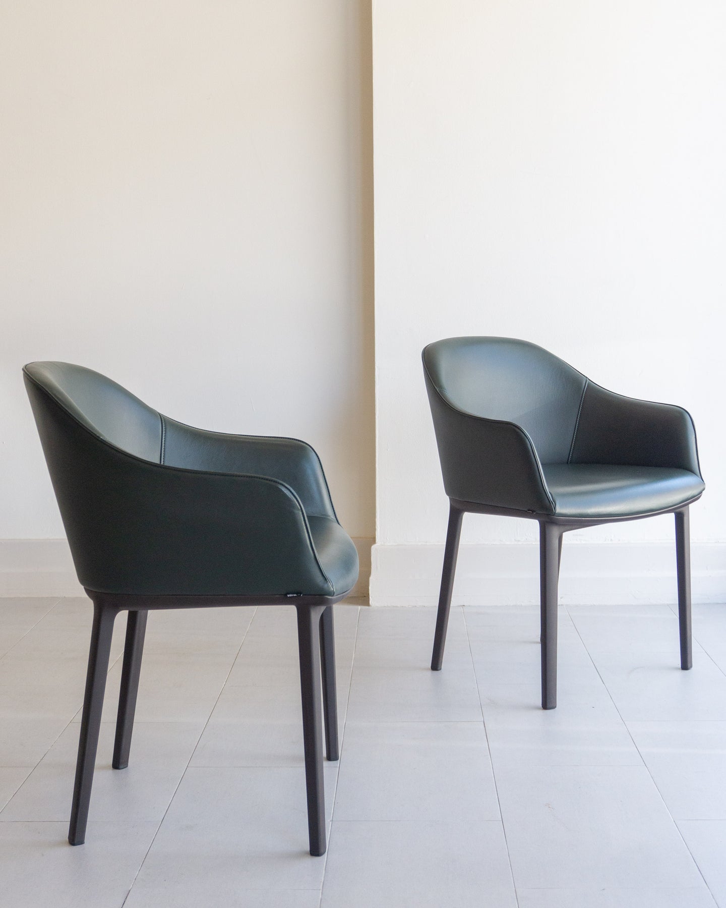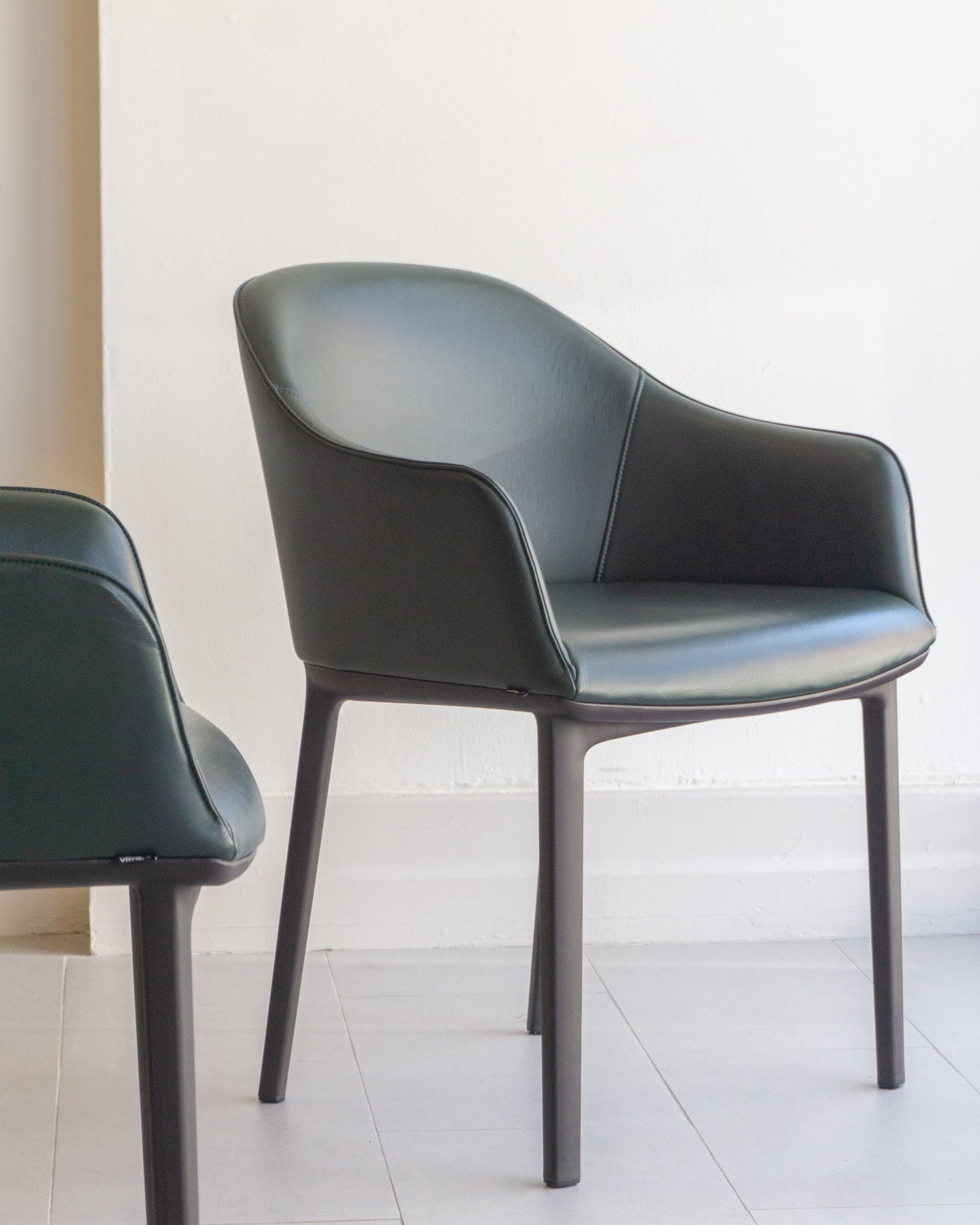 The Softshell Chair designed by Ronan and Erwan Bouroullec in 2008 for Vitra, featuring a flexible upper backrest with internal vertical ribs that accommodate to the user, providing a great level of comfort, the shell and foam cushion is upholstered in premium Jade coloured leather.