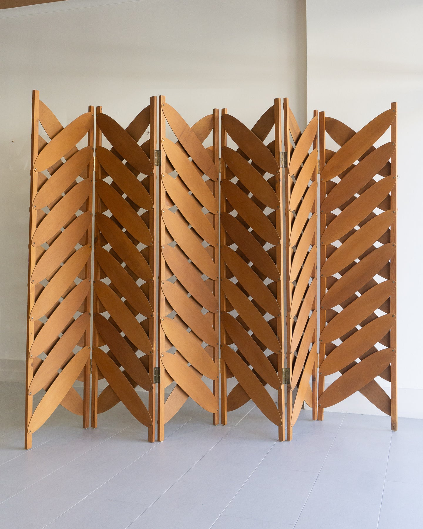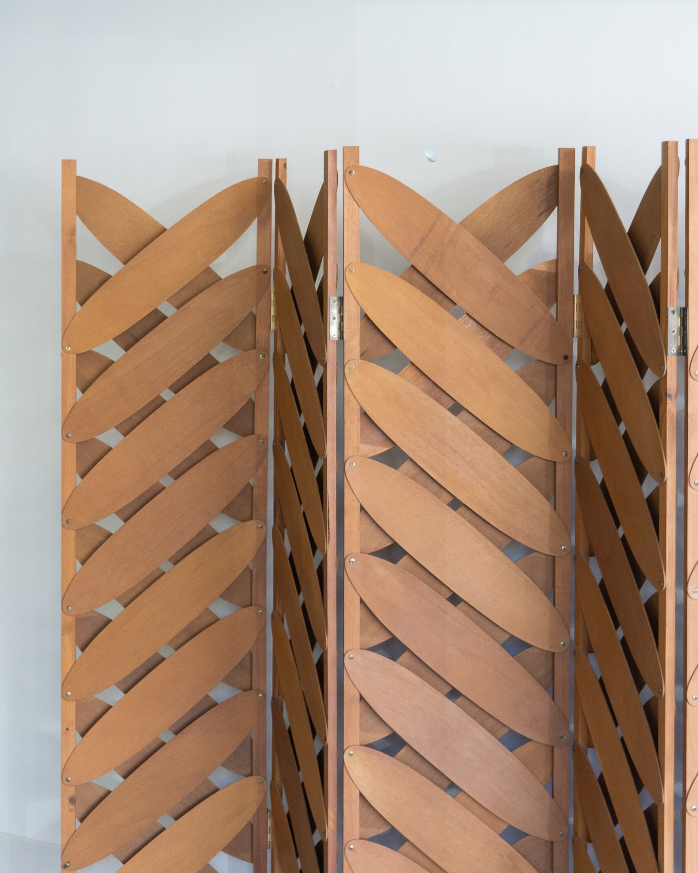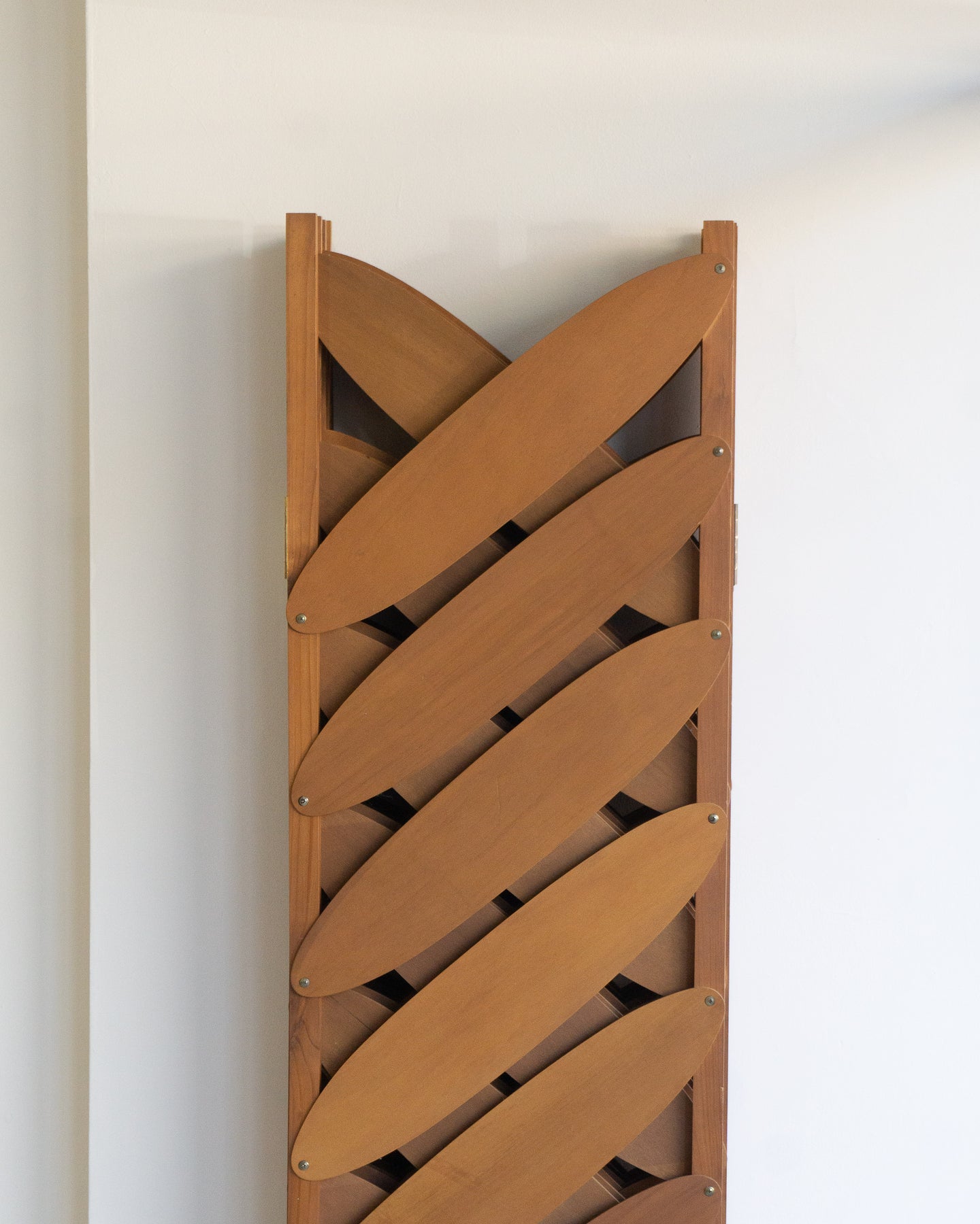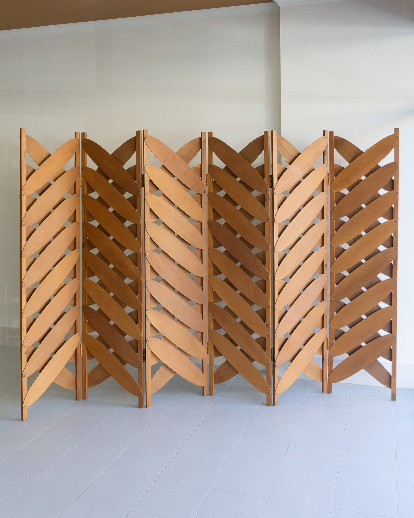 Large six-panel screen with ovals of maple plywood, in the style of Caroline Casey's Elliptical Folding Screen.