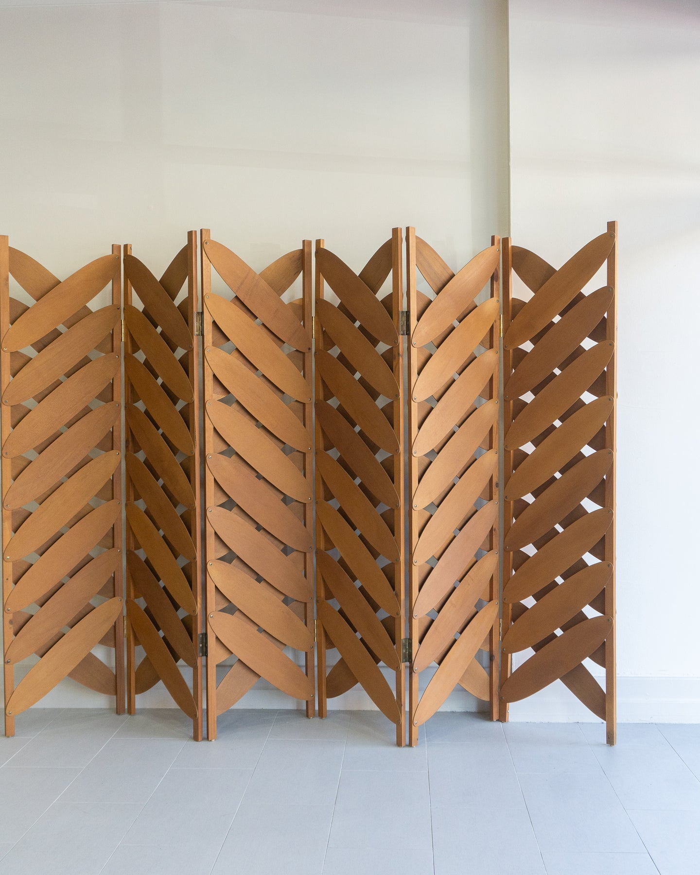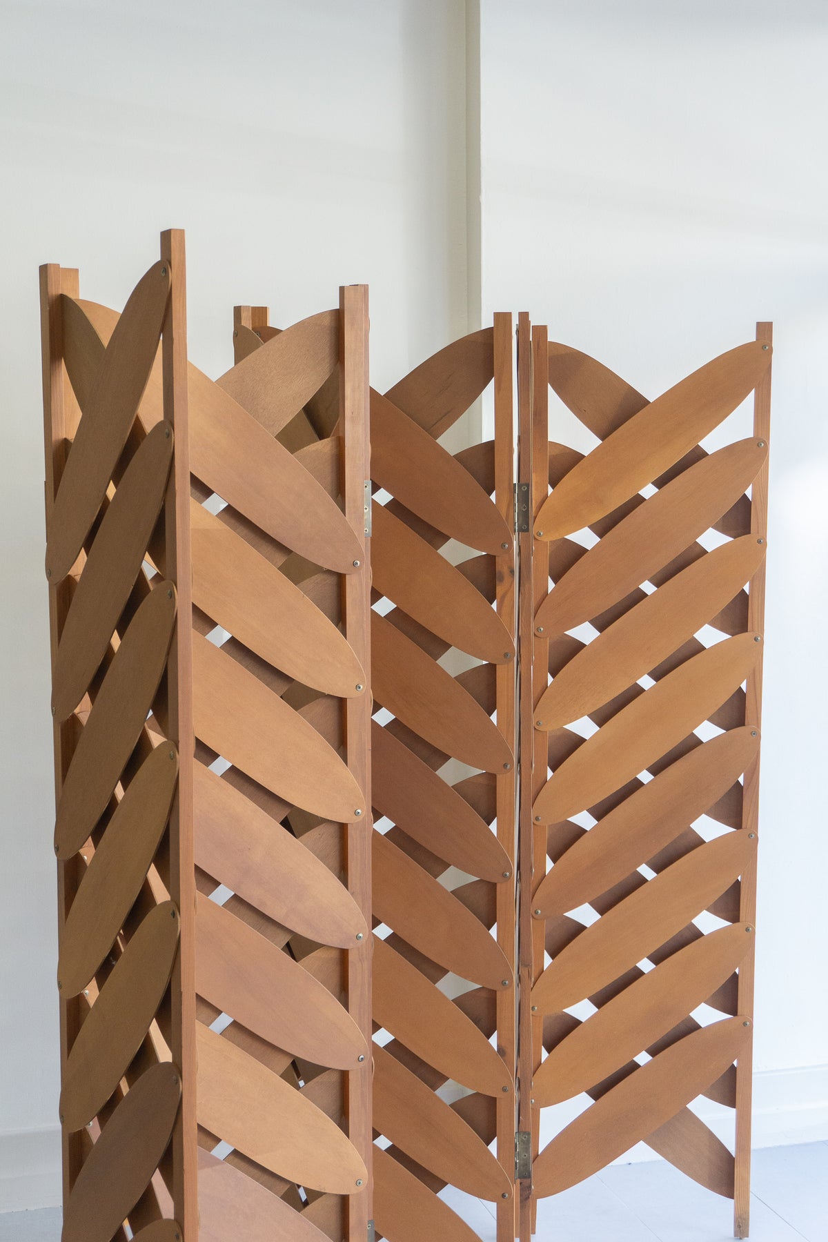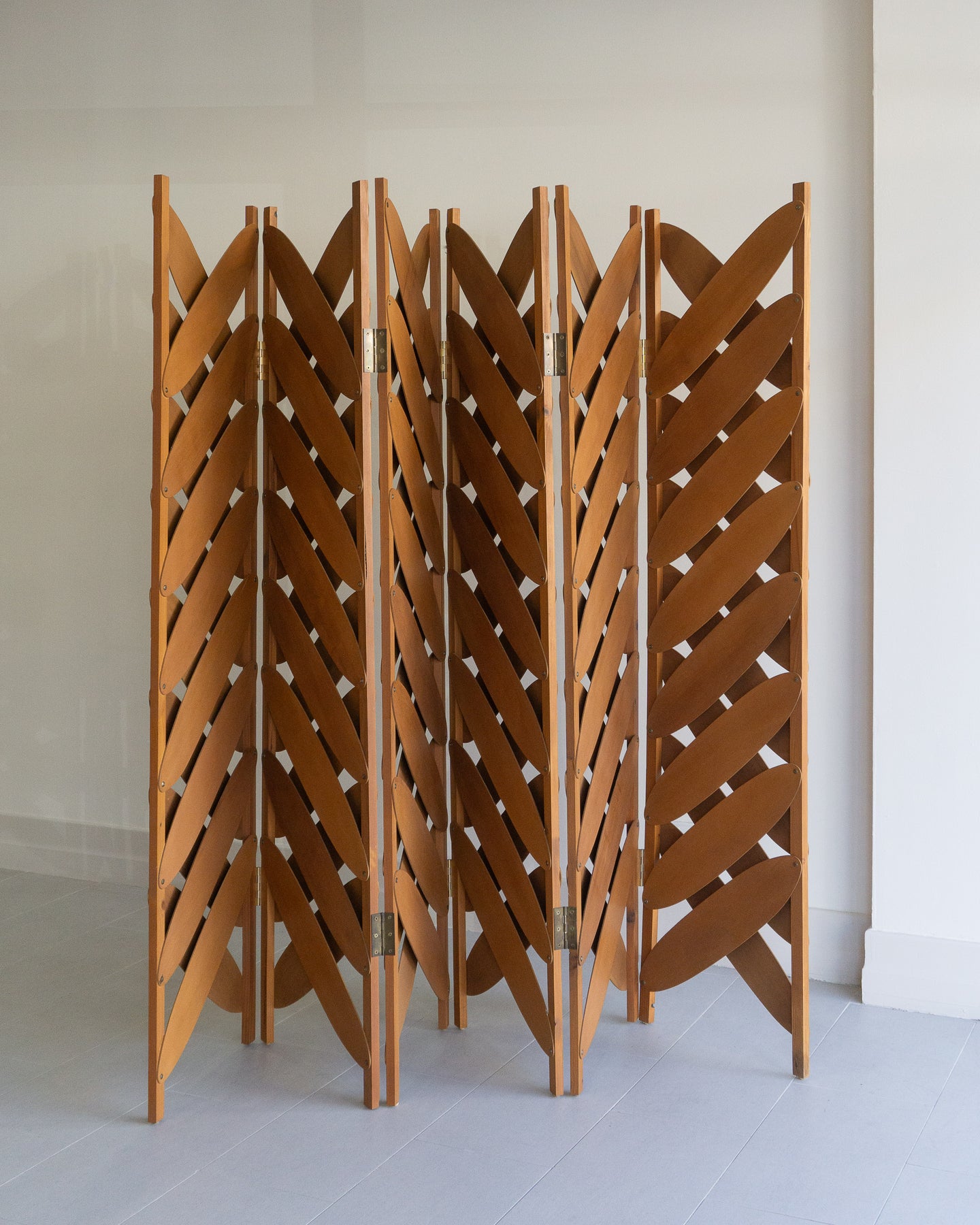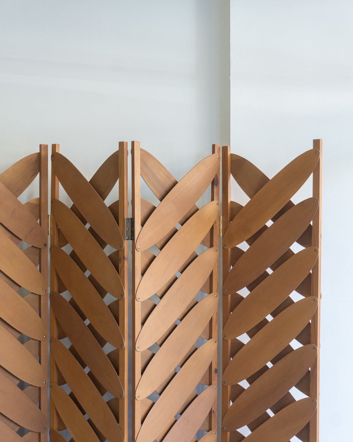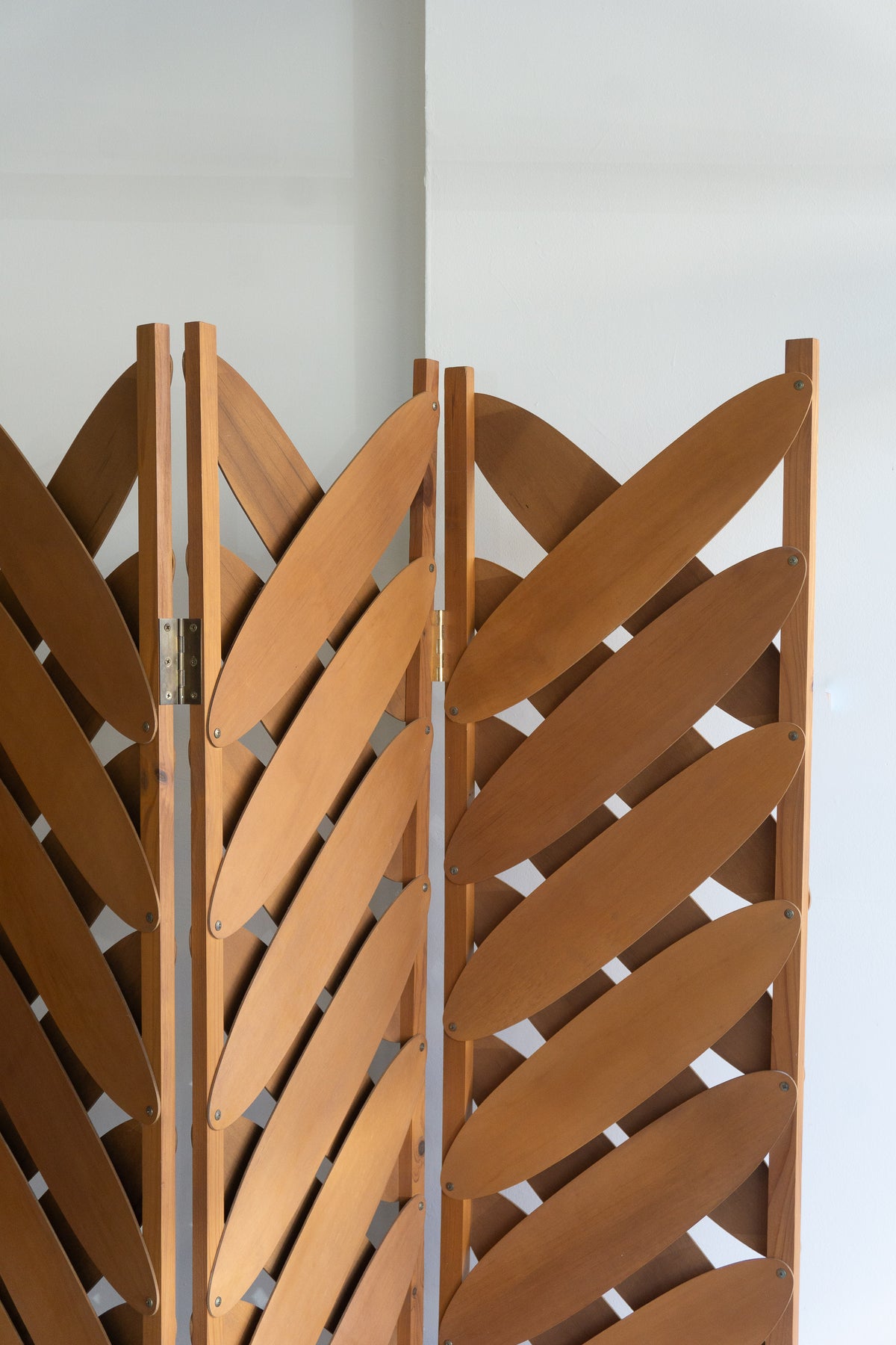 Large six-panel screen with ovals of maple plywood, in the style of Caroline Casey's Elliptical Folding Screen.