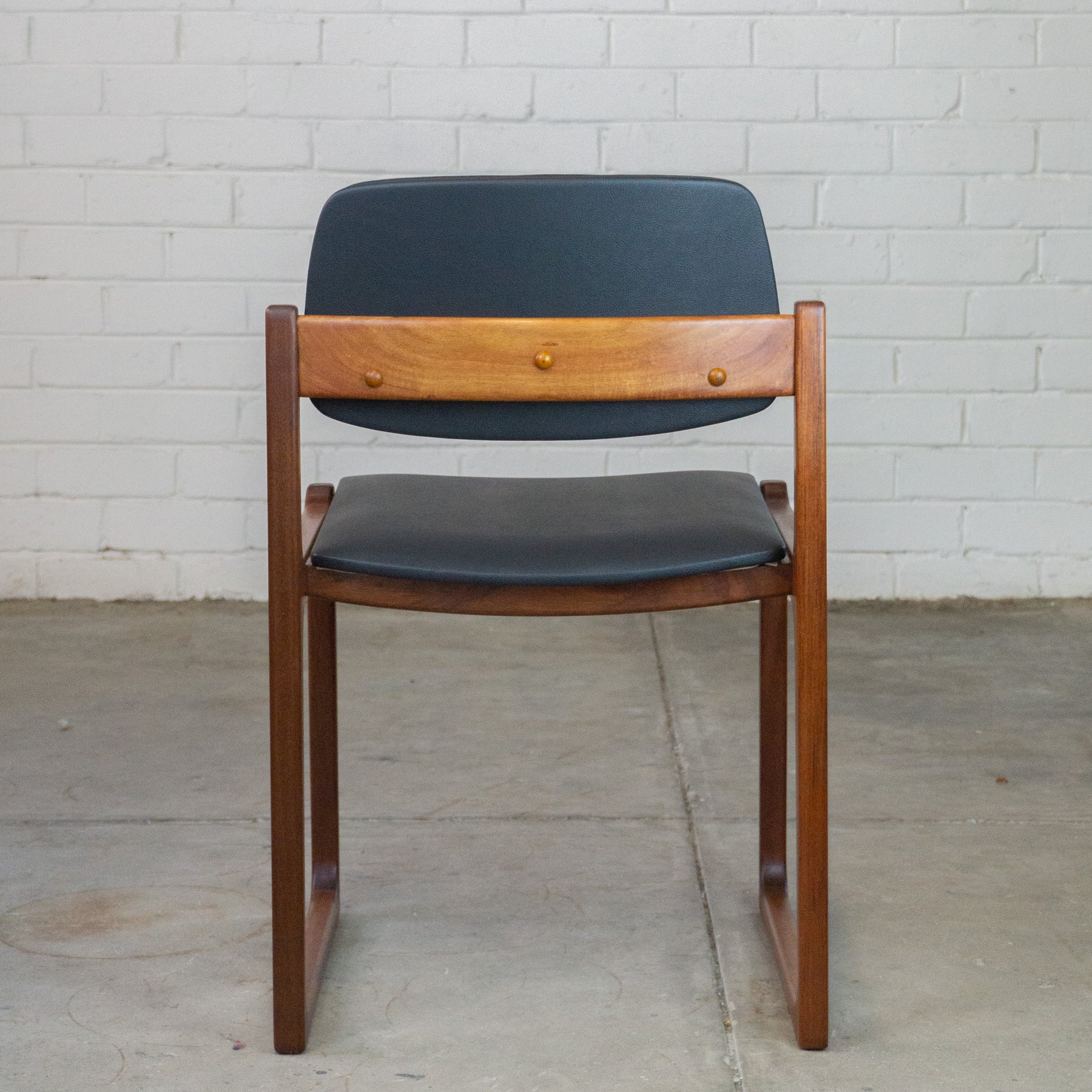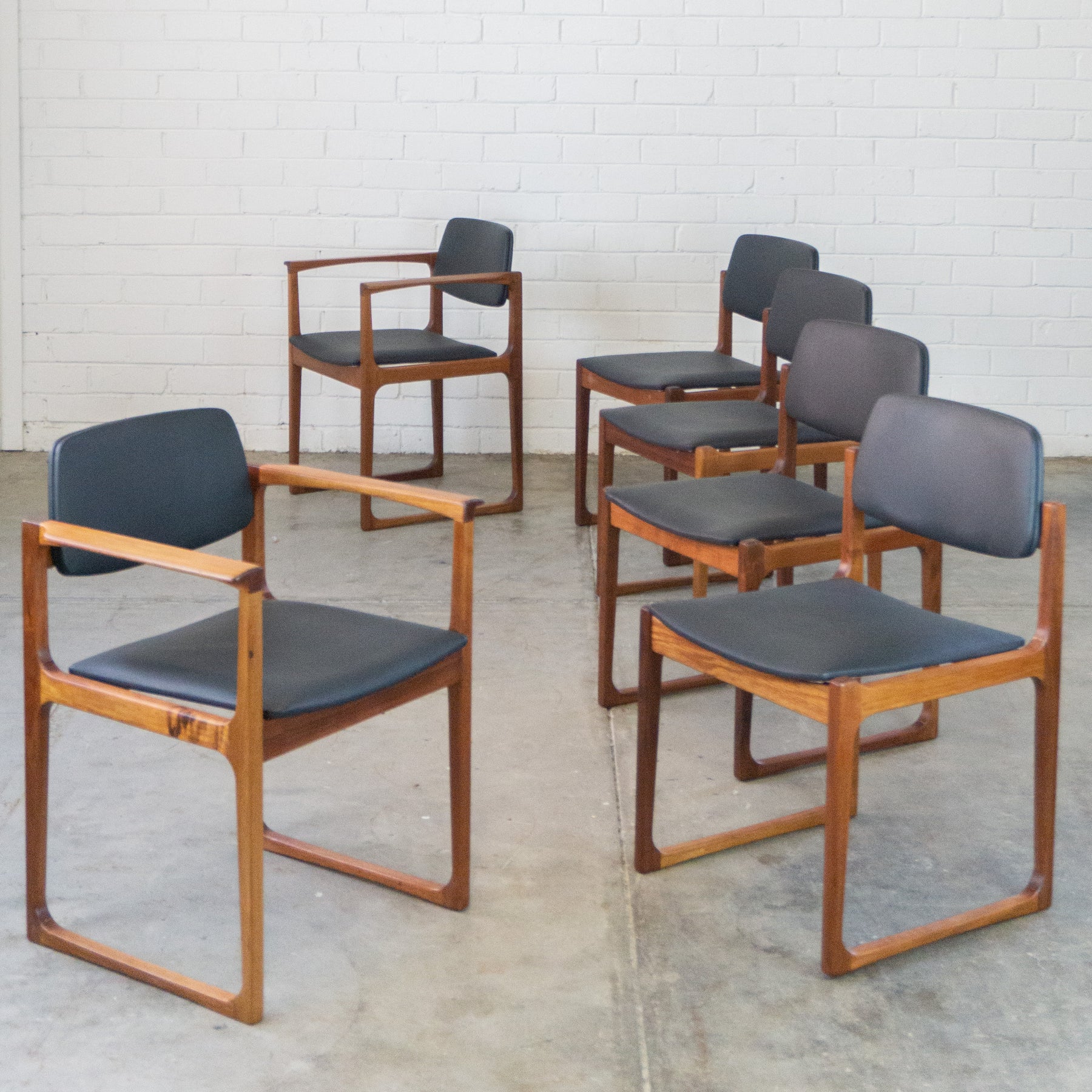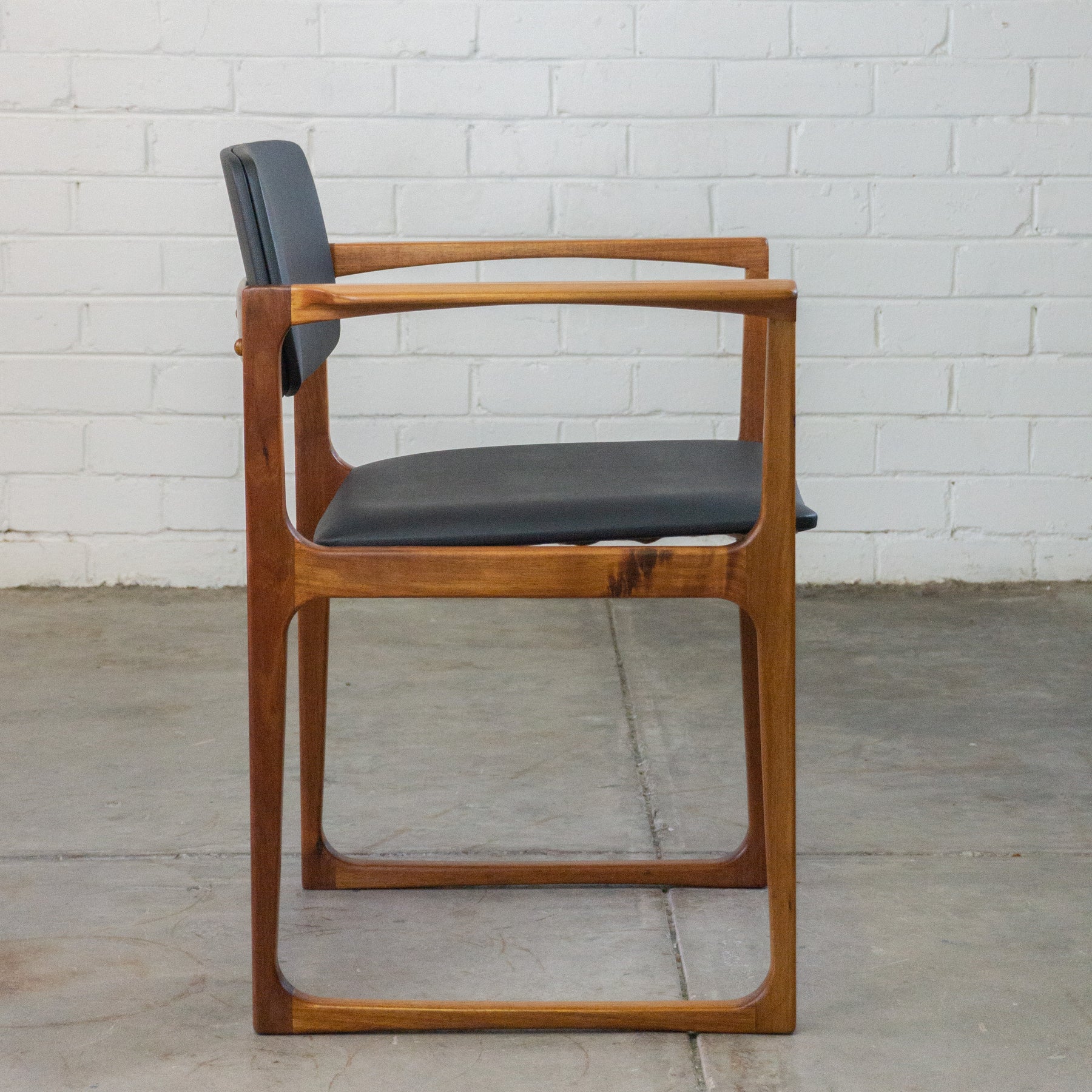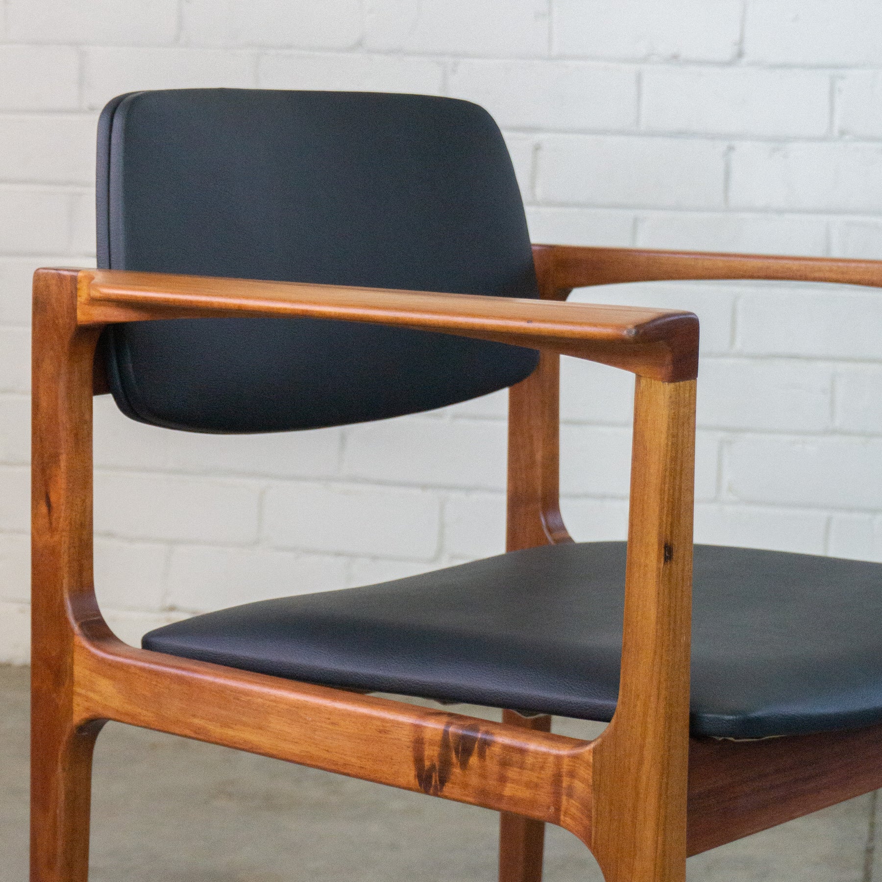 Mid-century dining chairs by award-winning designer Gerald Easden, This set features two carver chairs & 4 side chairs with a solid Blackwood frame & cushioned vinyl seat.