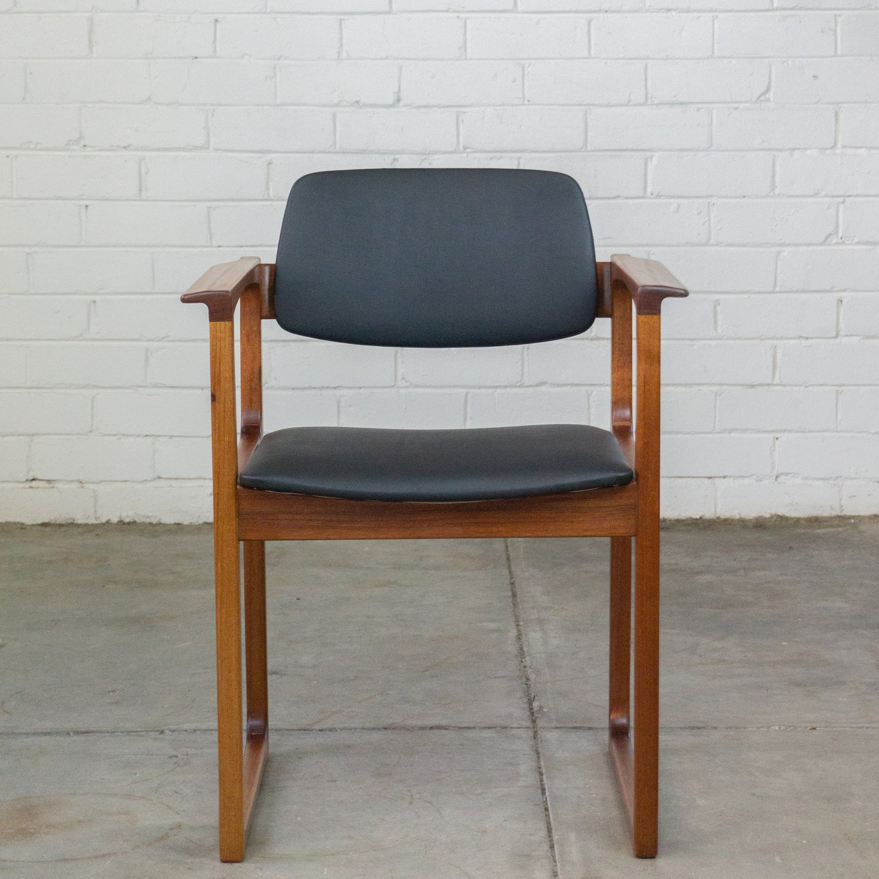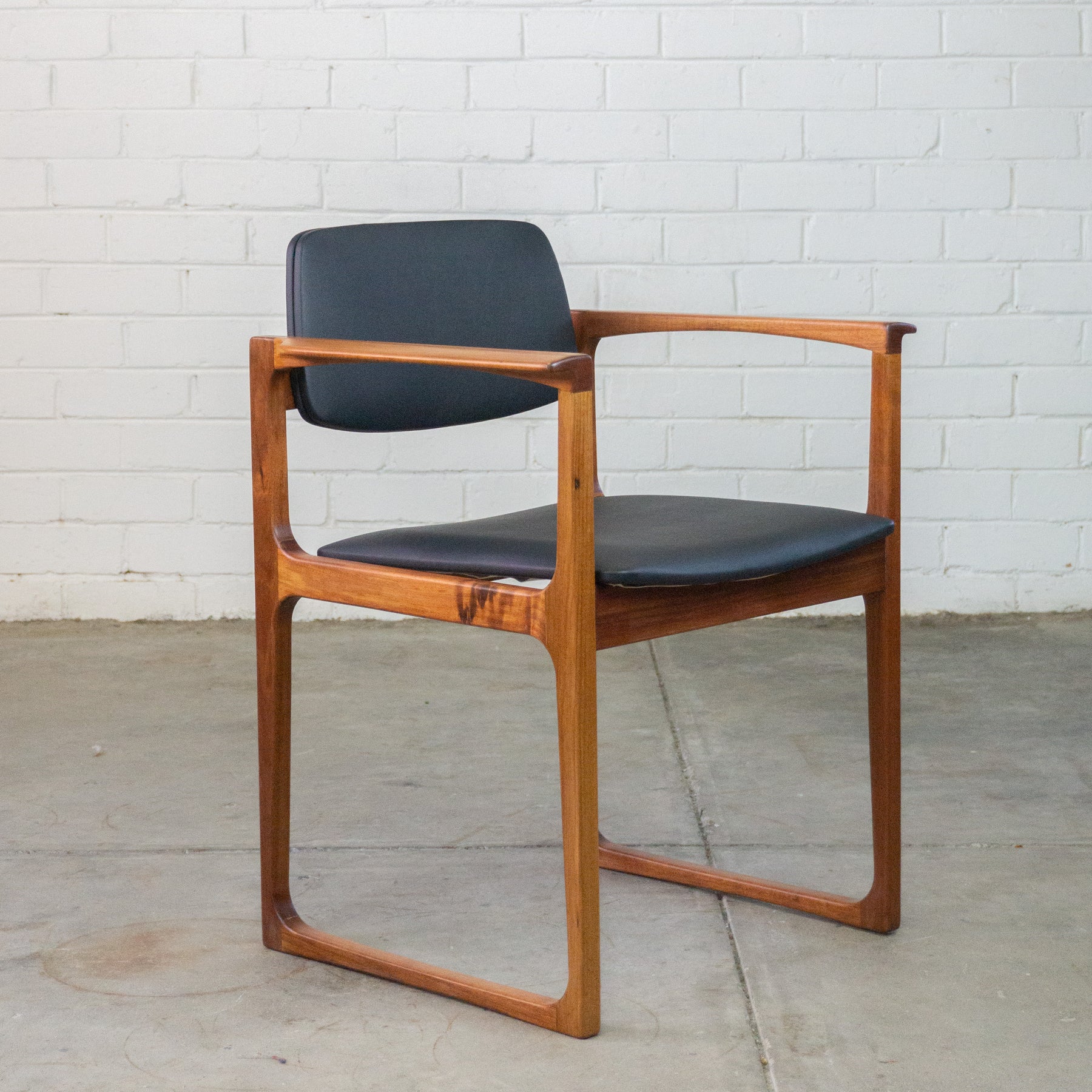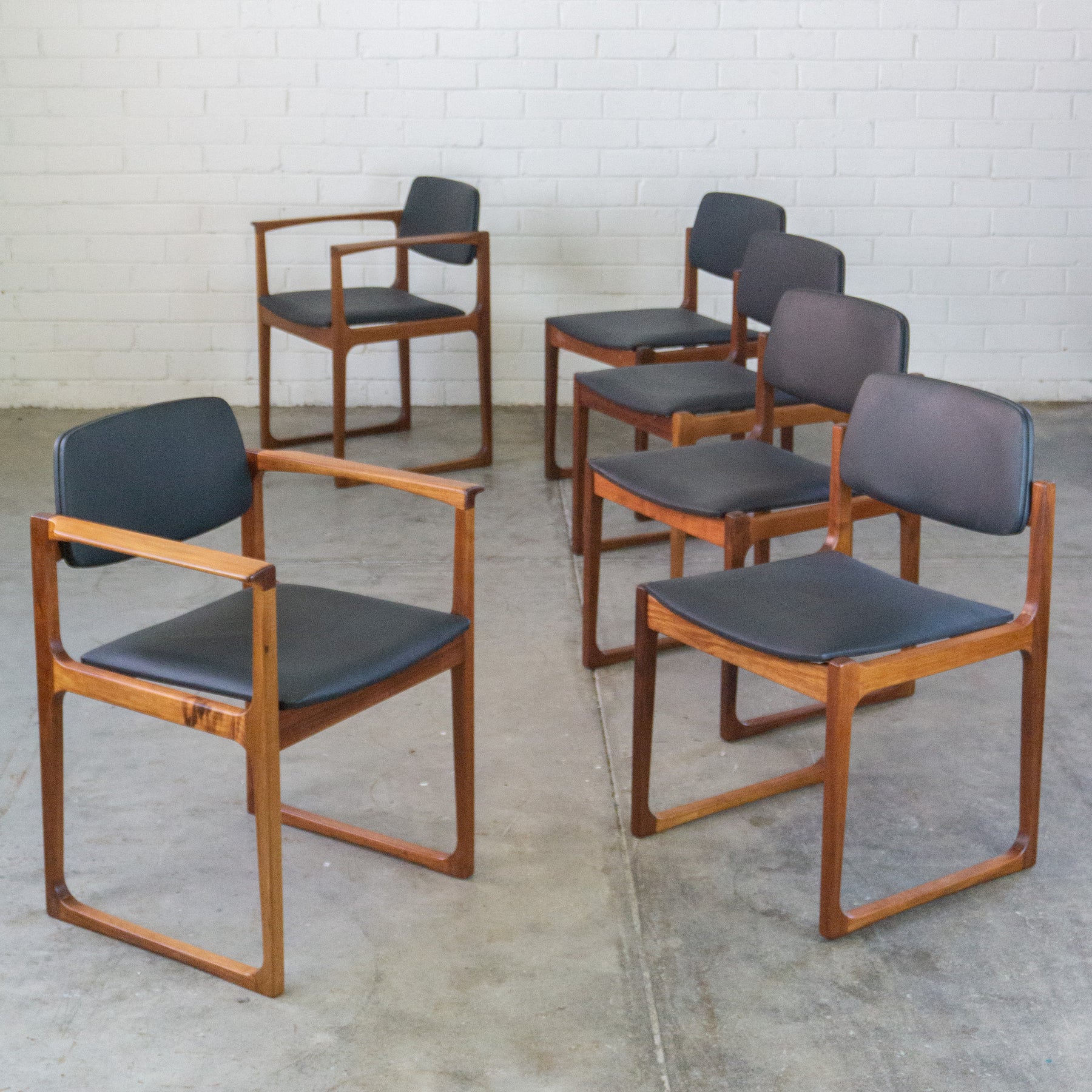 Mid-century dining chairs by award-winning designer Gerald Easden, This set features two carver chairs & 4 side chairs with a solid Blackwood frame & cushioned vinyl seat.