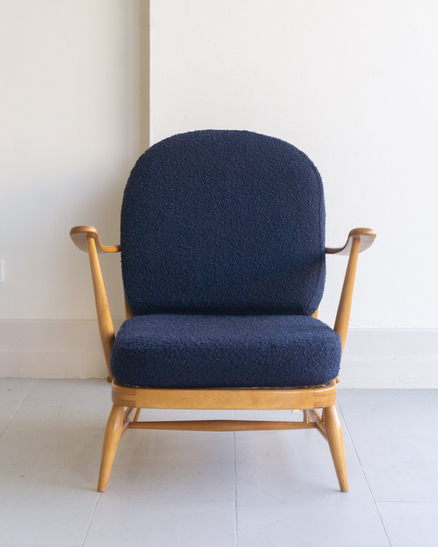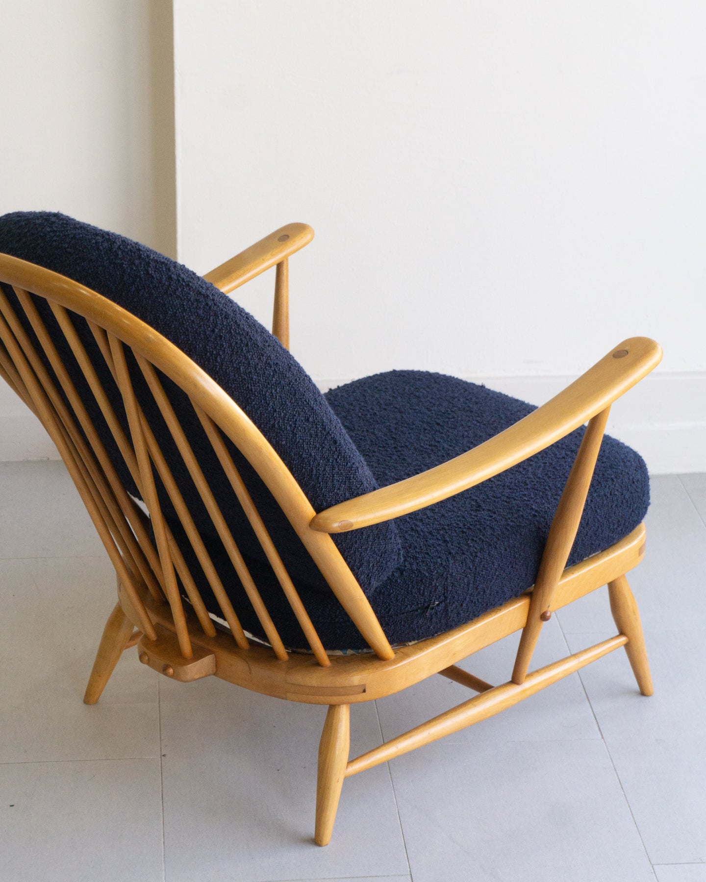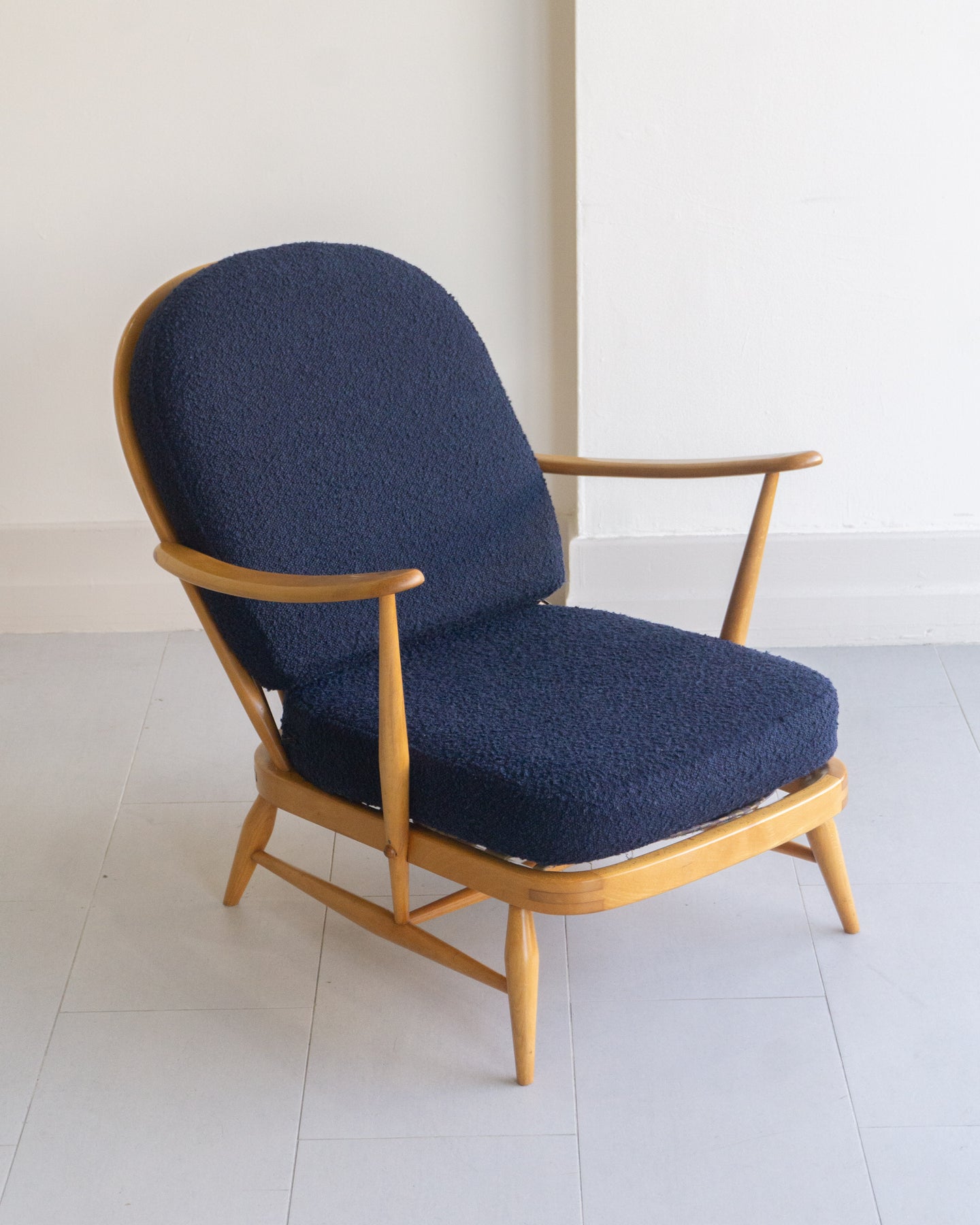Vintage armchair designed by Lucian Ercolani for Ercol, featuring a blonde Beech wood frame with traditional spindle details and curved armrest. The cushions were reupholstered a few years ago in a blue boucle.