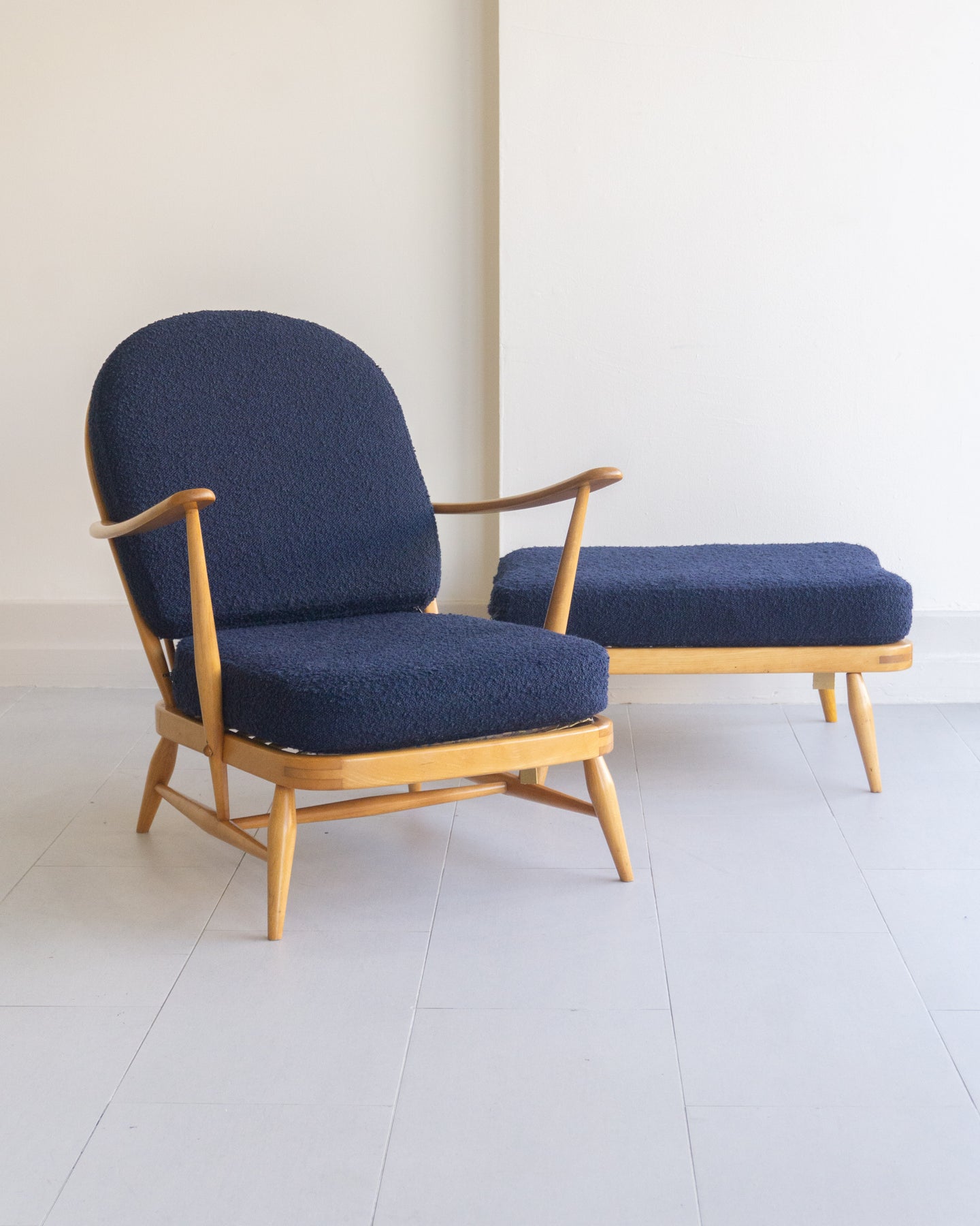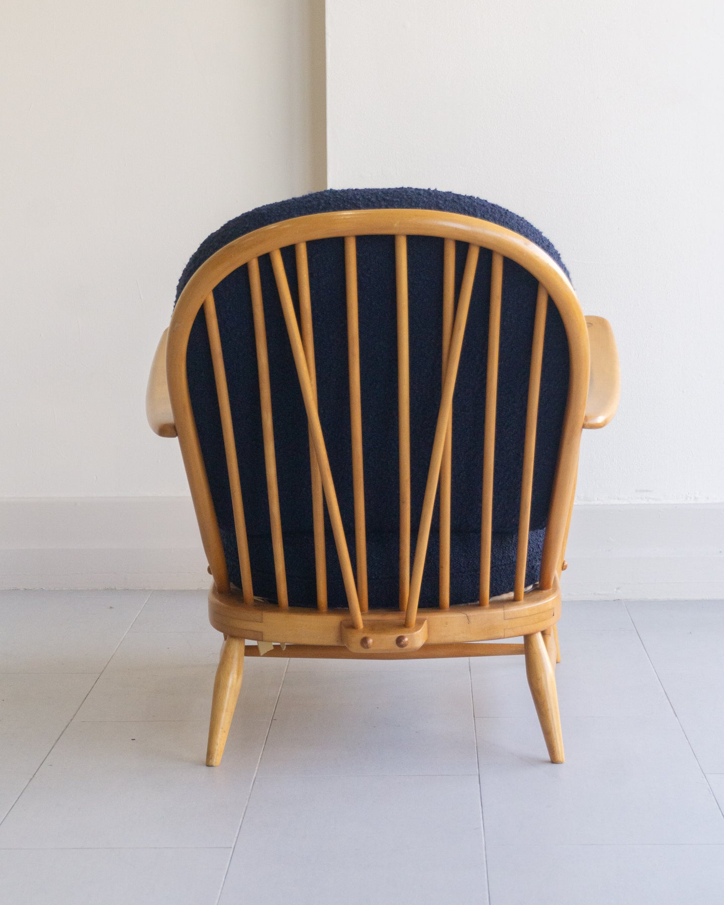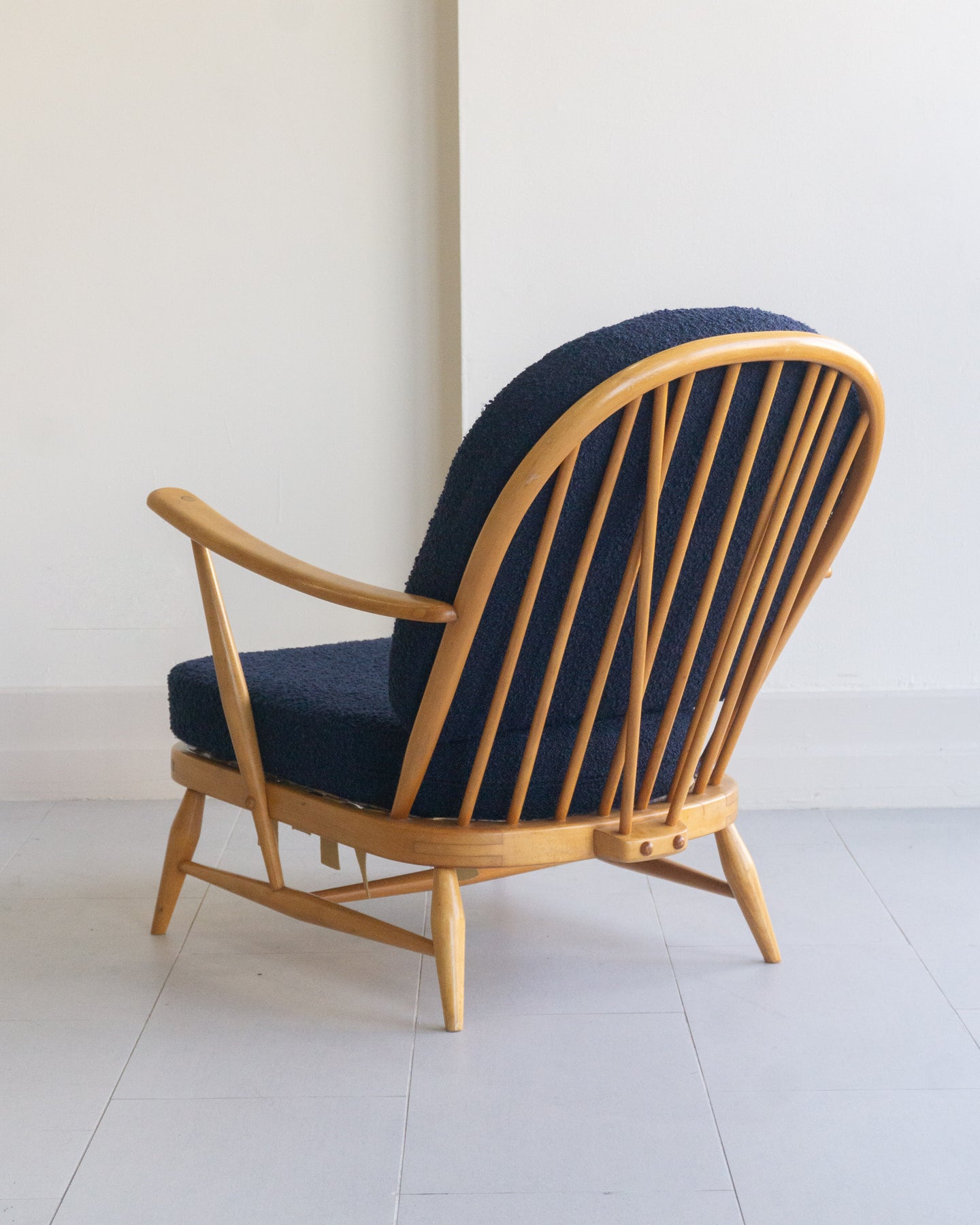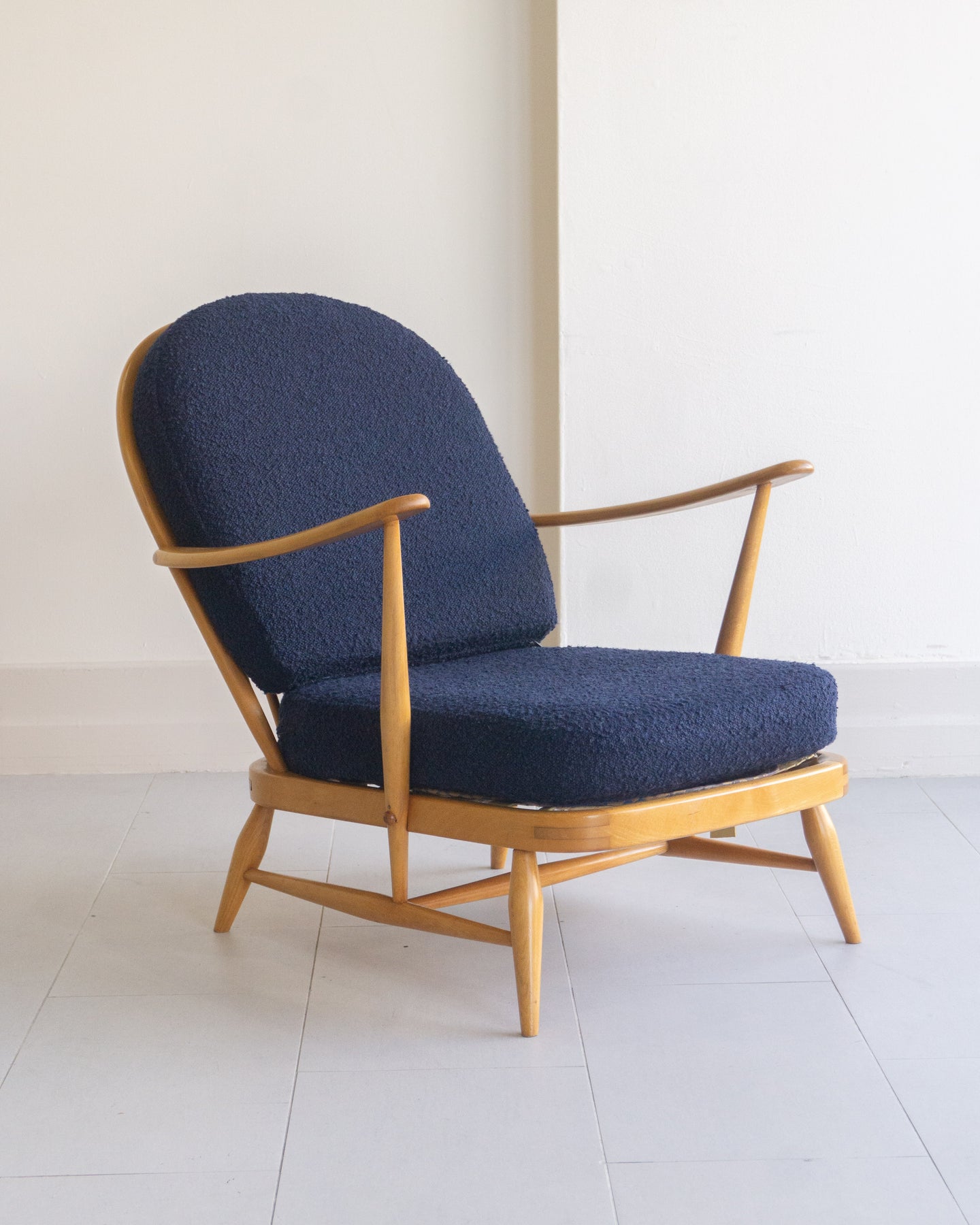 Vintage armchair designed by Lucian Ercolani for Ercol, featuring a blonde Beech wood frame with traditional spindle details and curved armrest. The cushions were reupholstered a few years ago in a blue boucle.