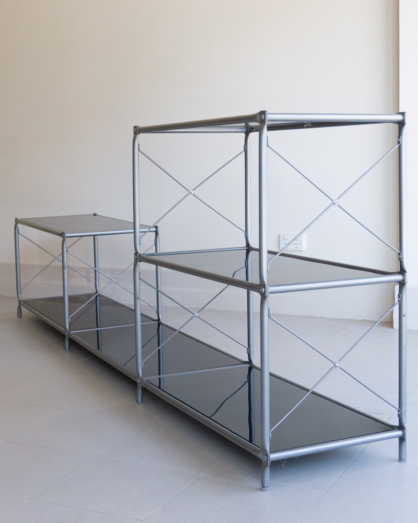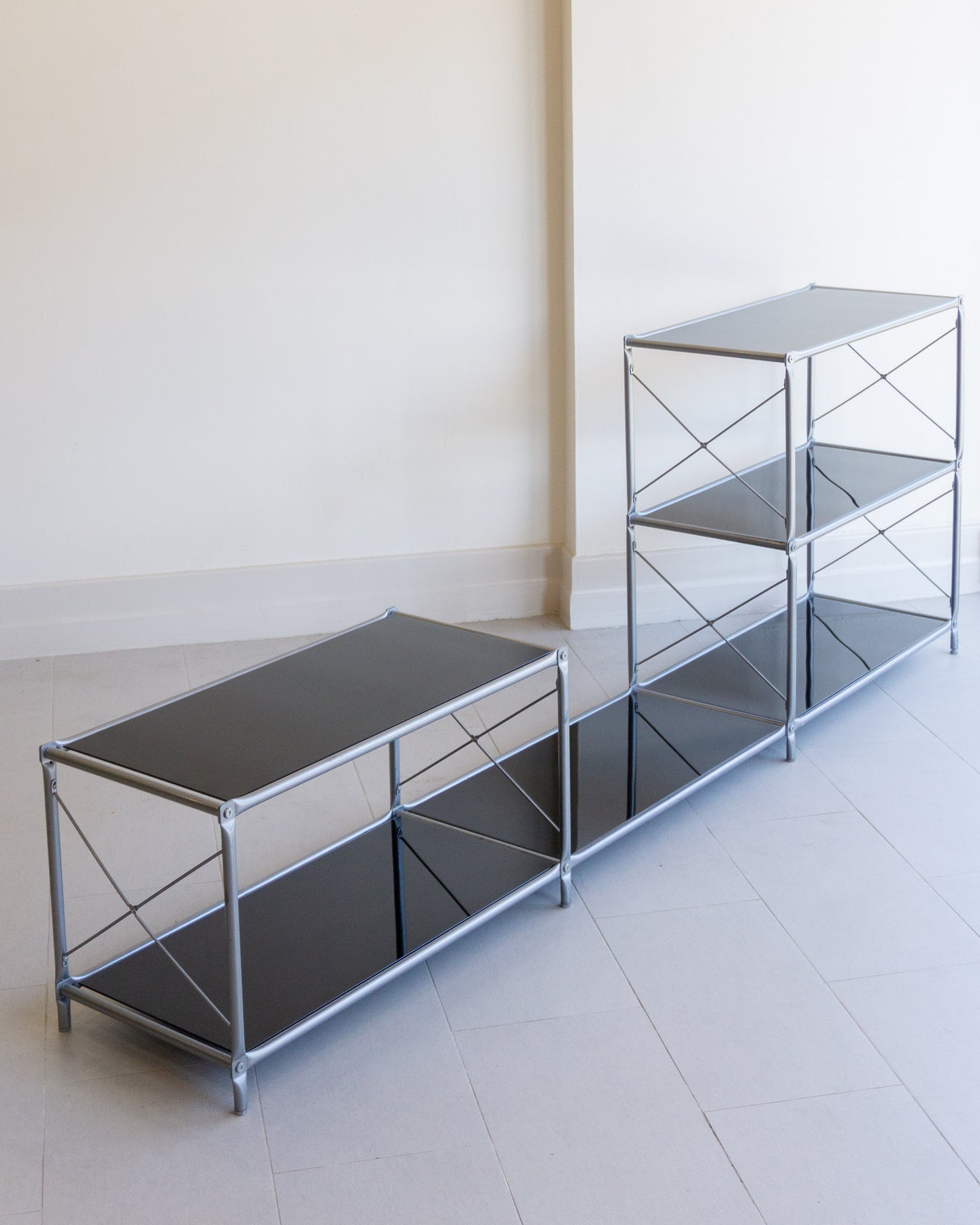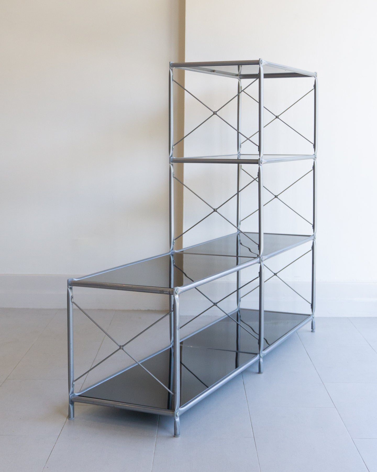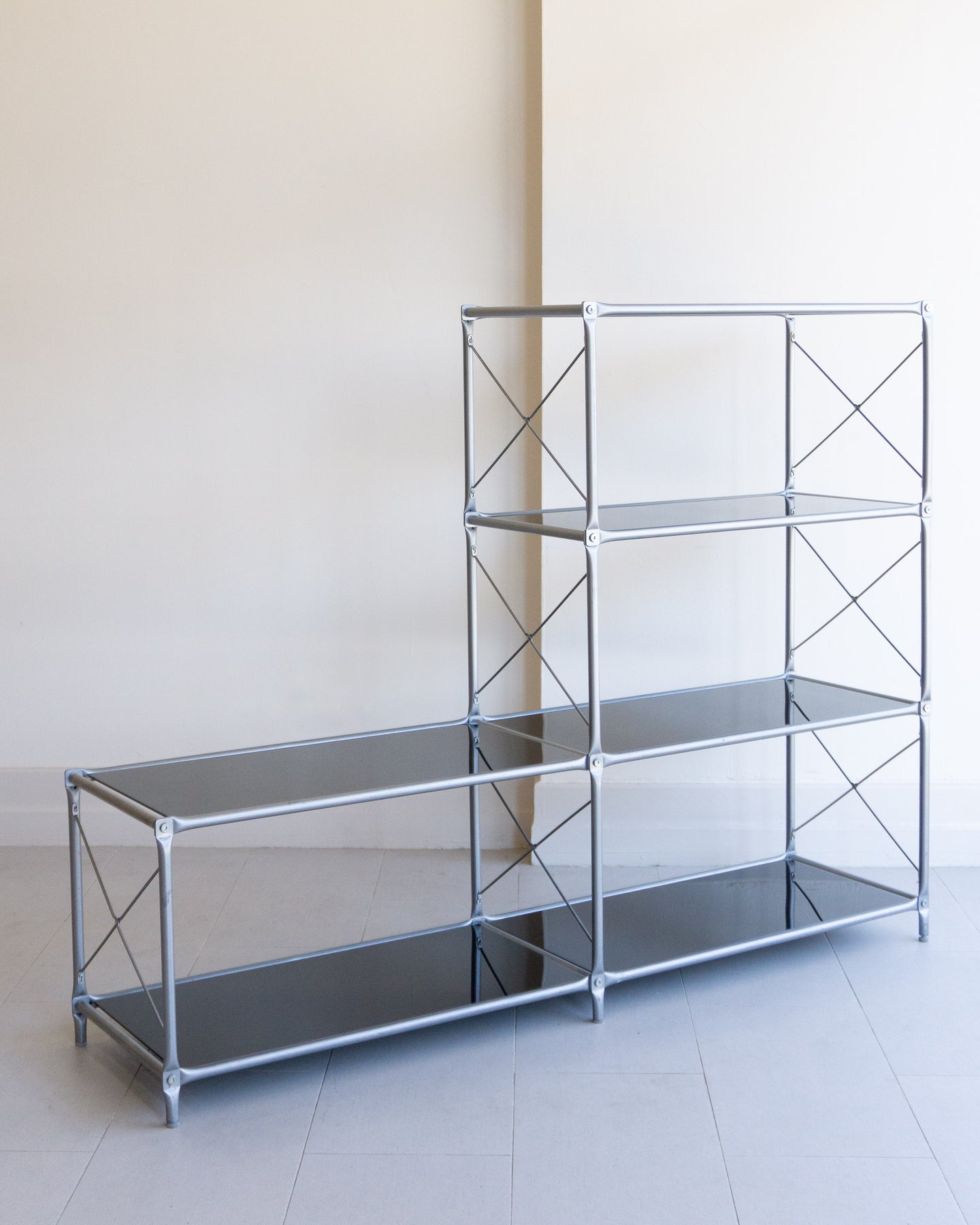 The Laxvik Modular shelving unit, designed by John Karlsson for Ikea (2008), features six tempered glass shelves supported by steel brackets. It can be configured in various ways: high, low, or wide. The unit can be easily separated or expanded and disassembled flat for convenient transport.
