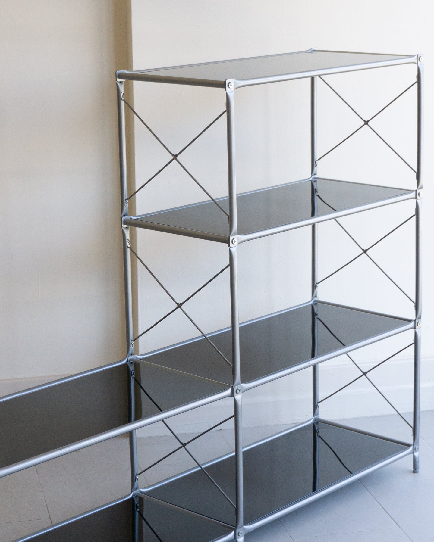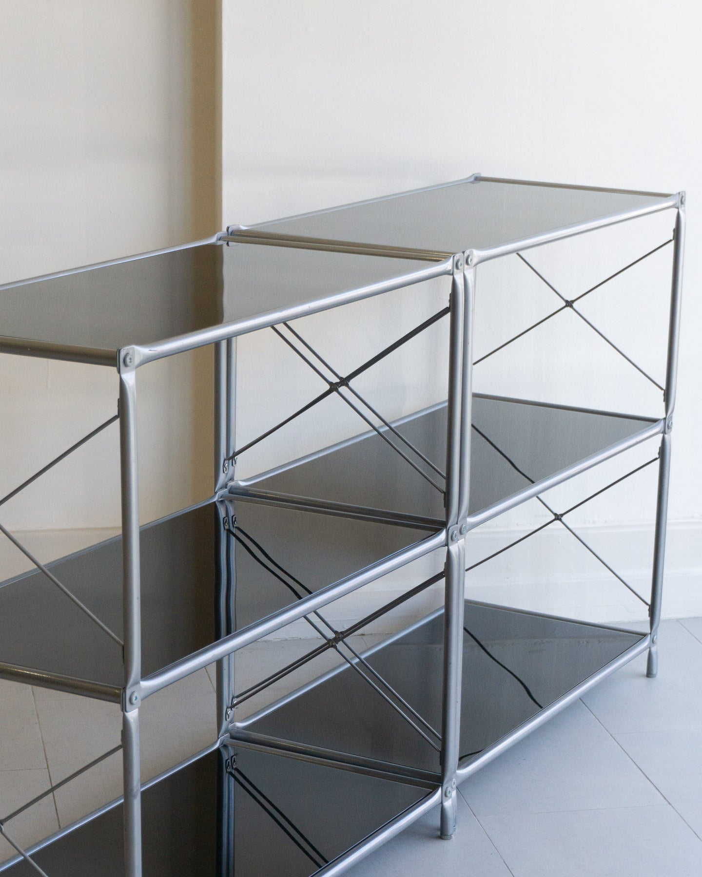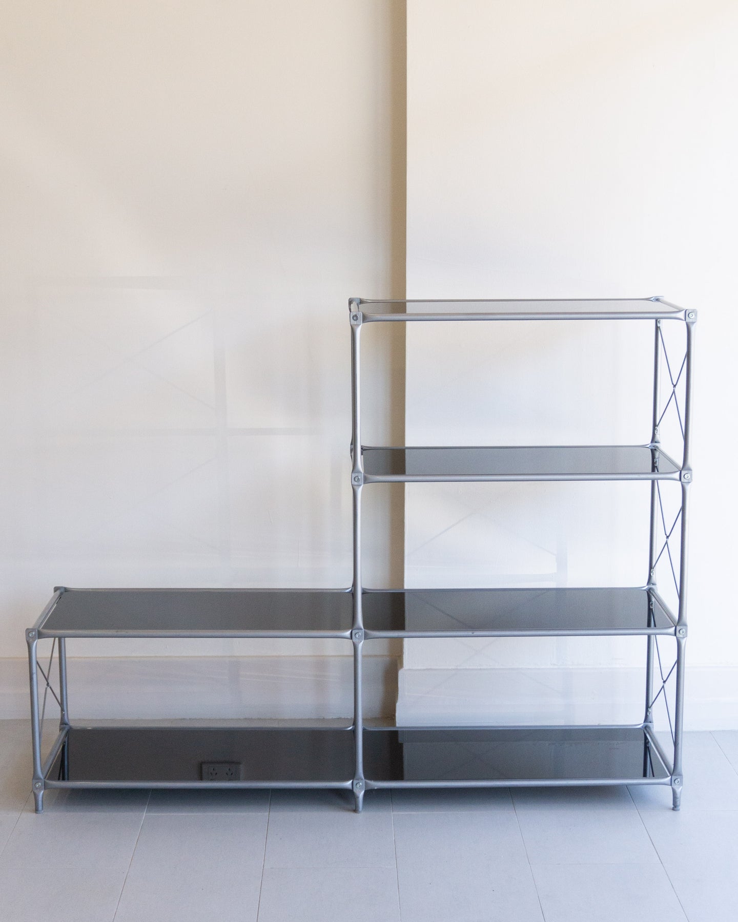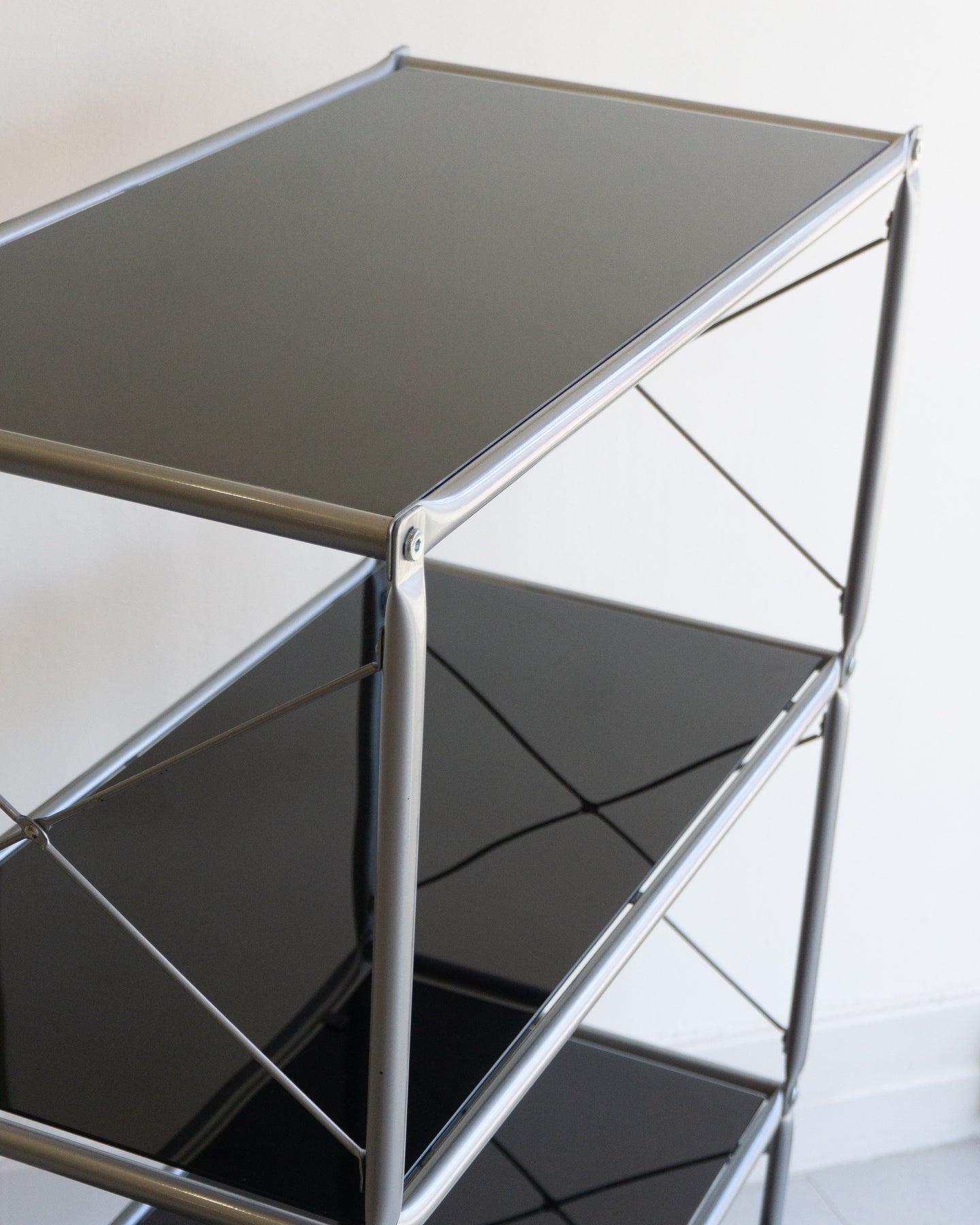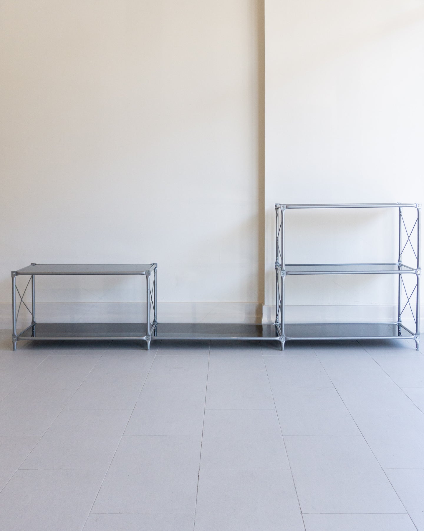 The Laxvik Modular shelving unit, designed by John Karlsson for Ikea (2008), features six tempered glass shelves supported by steel brackets. It can be configured in various ways: high, low, or wide. The unit can be easily separated or expanded and disassembled flat for convenient transport.