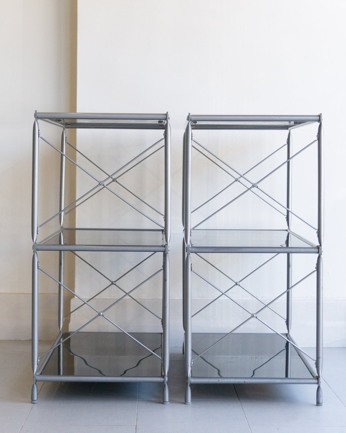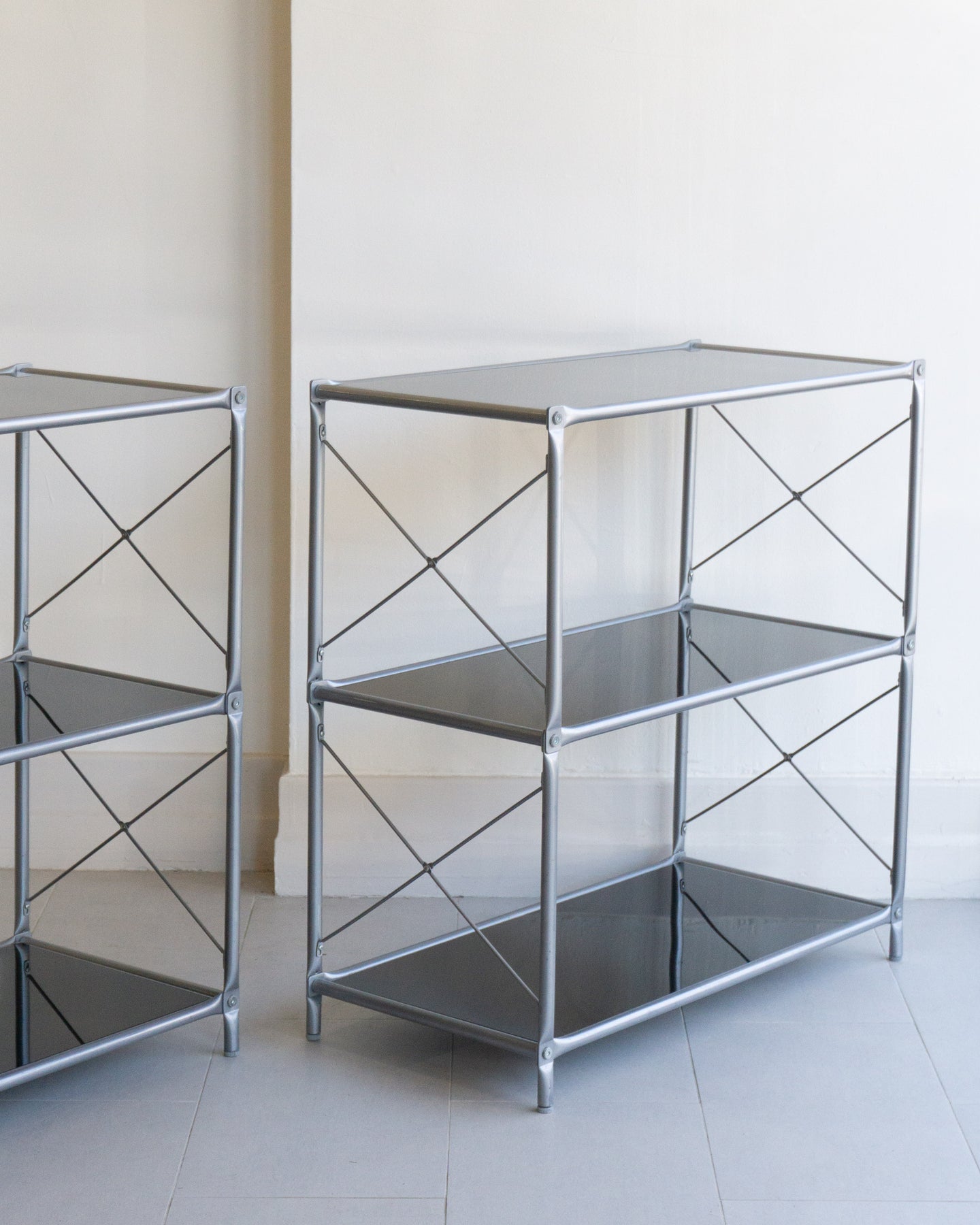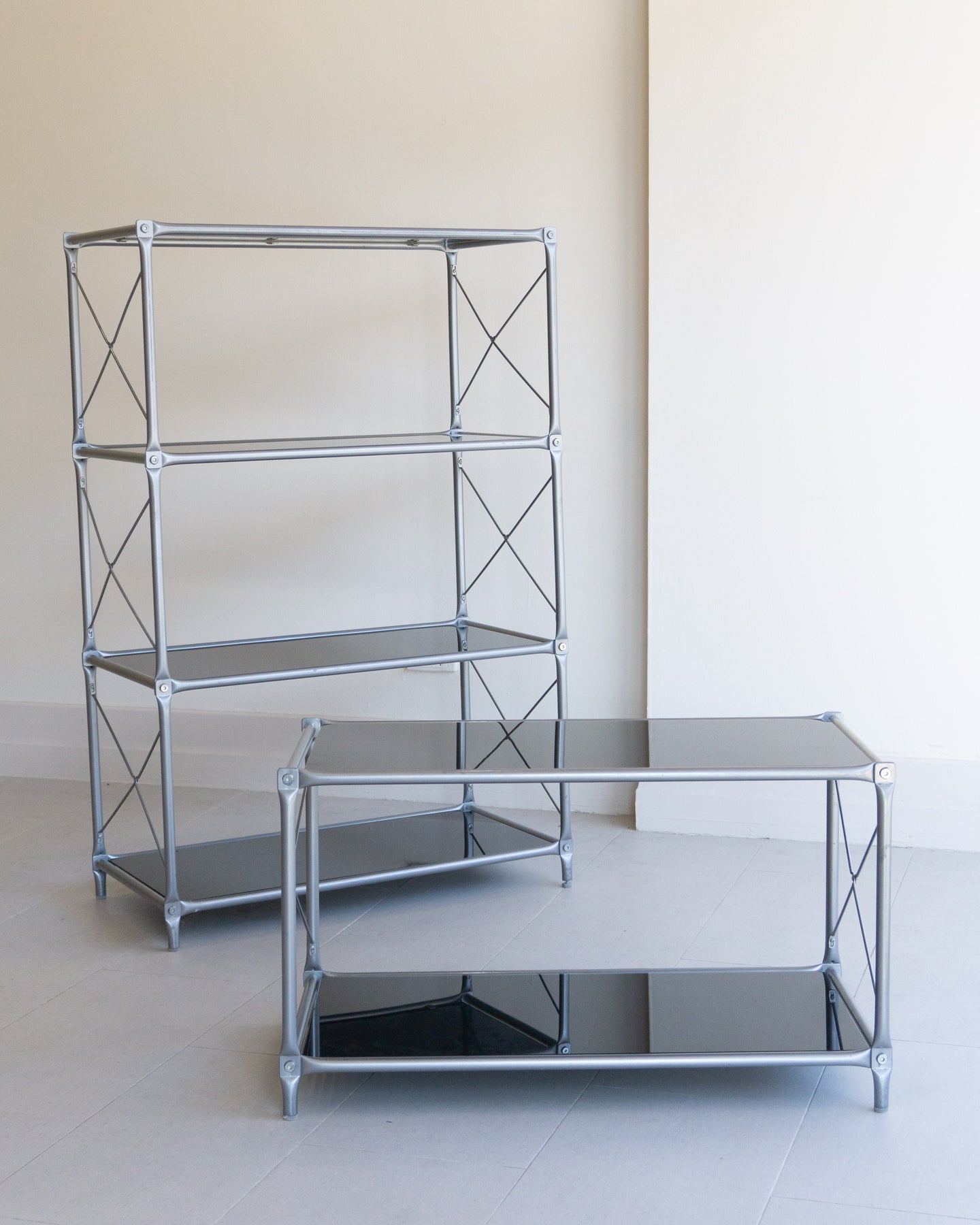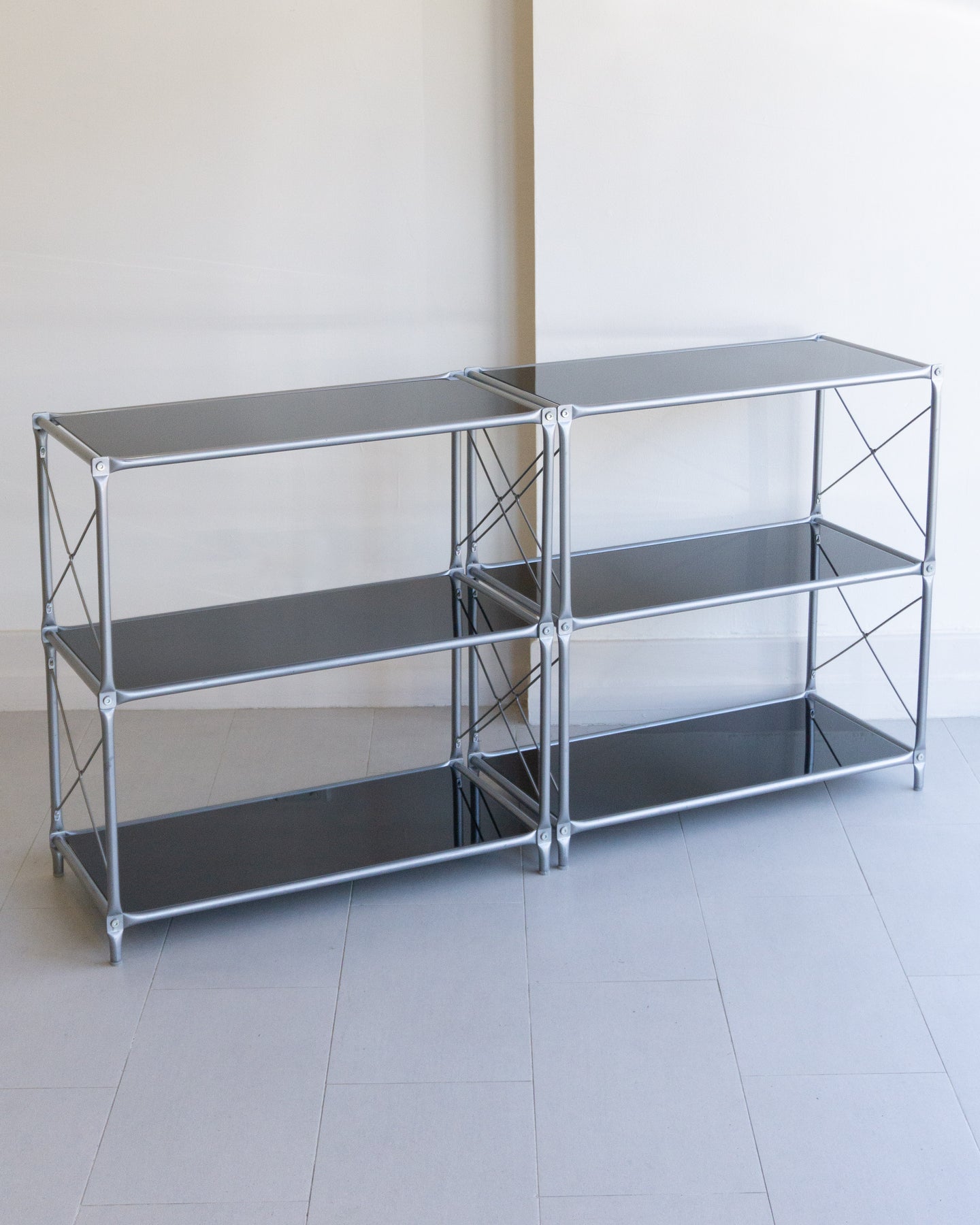 The Laxvik Modular shelving unit, designed by John Karlsson for Ikea (2008), features six tempered glass shelves supported by steel brackets. It can be configured in various ways: high, low, or wide. The unit can be easily separated or expanded and disassembled flat for convenient transport.