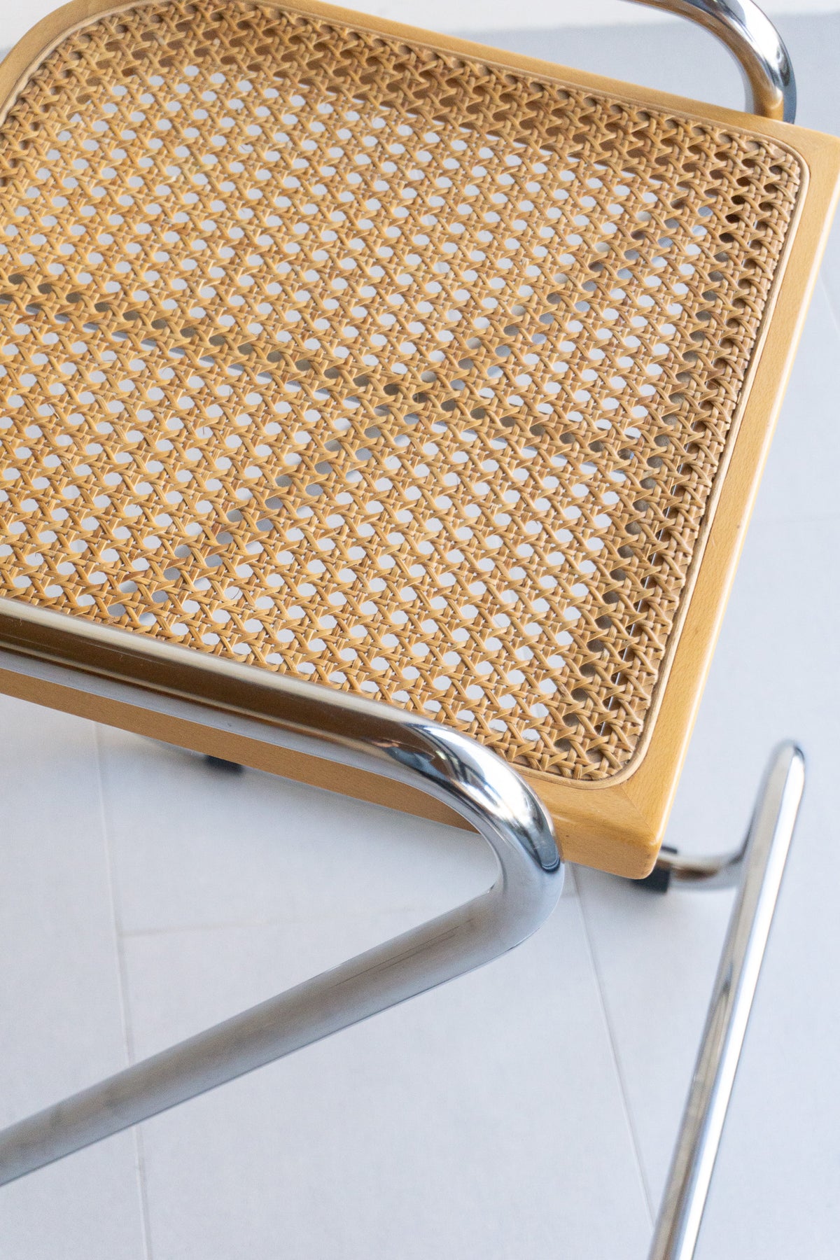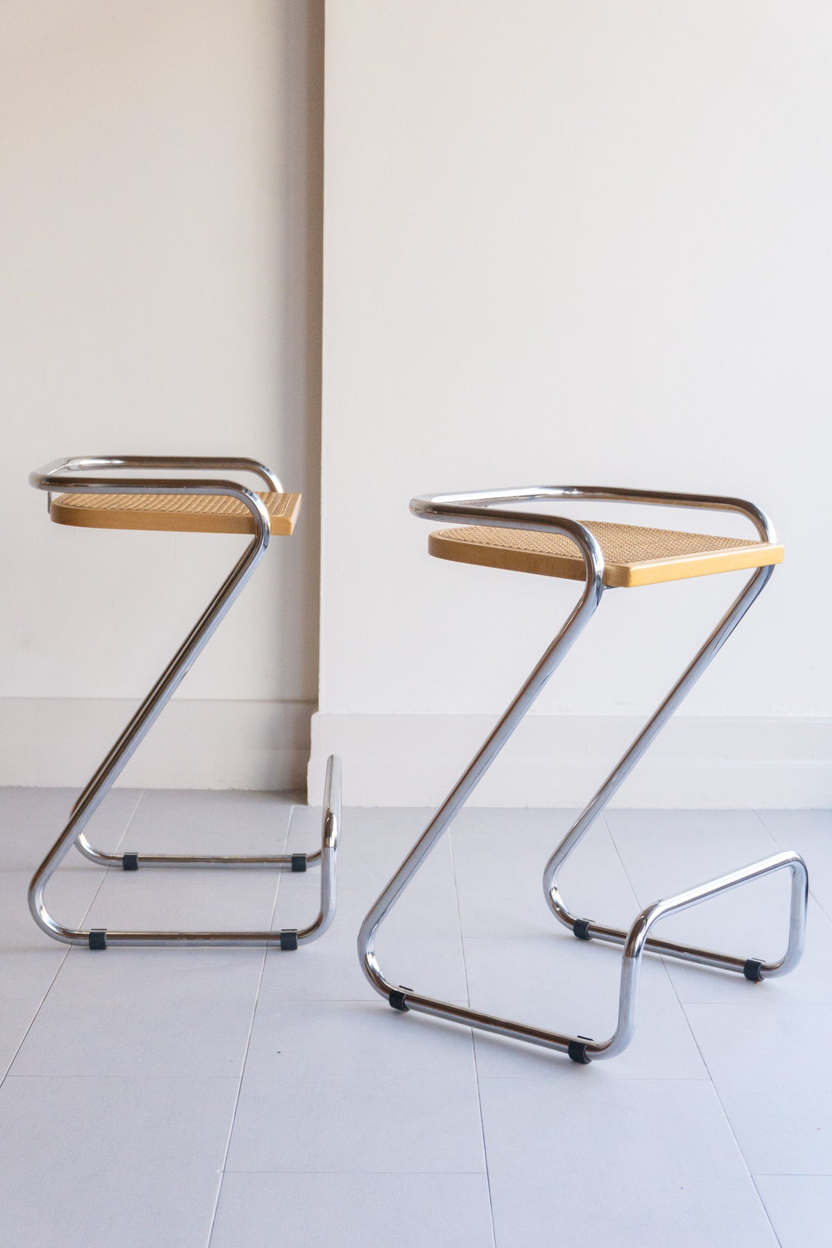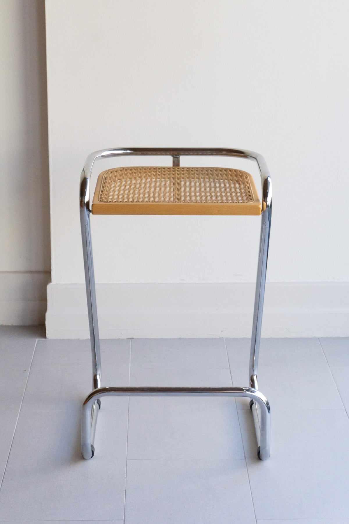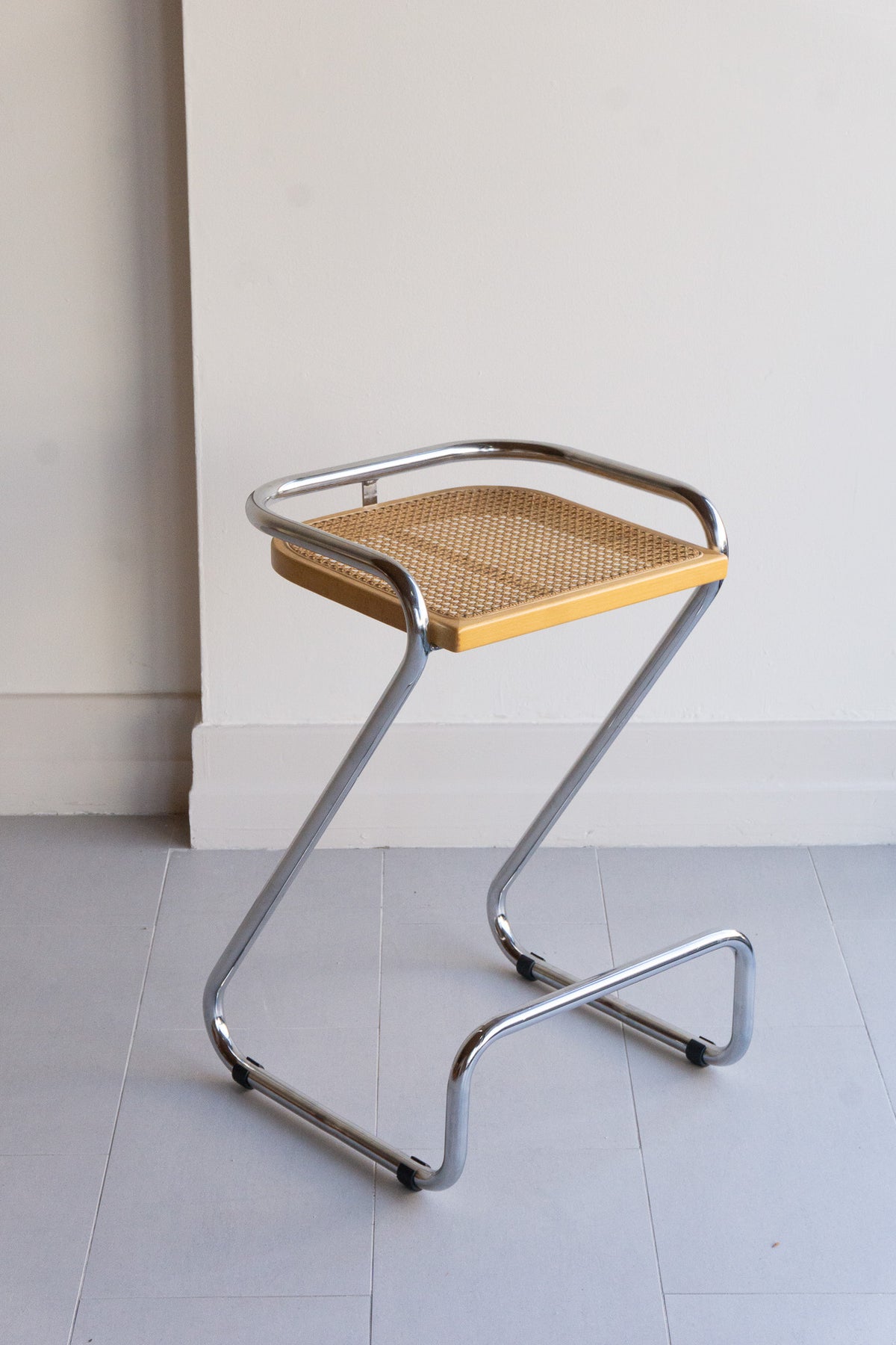 Vintage bar stools with rattan seat on a tubular chrome frame, Possibly attributed to Mariani and imported from Italy.
