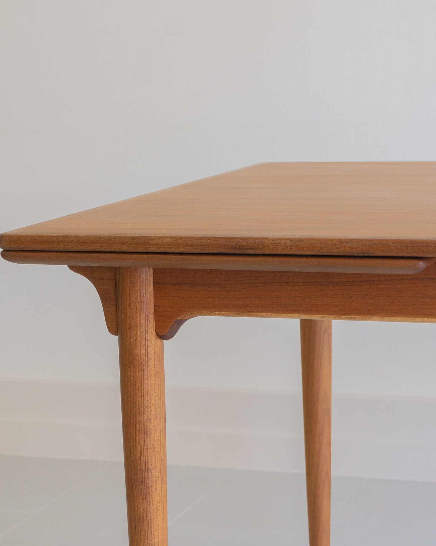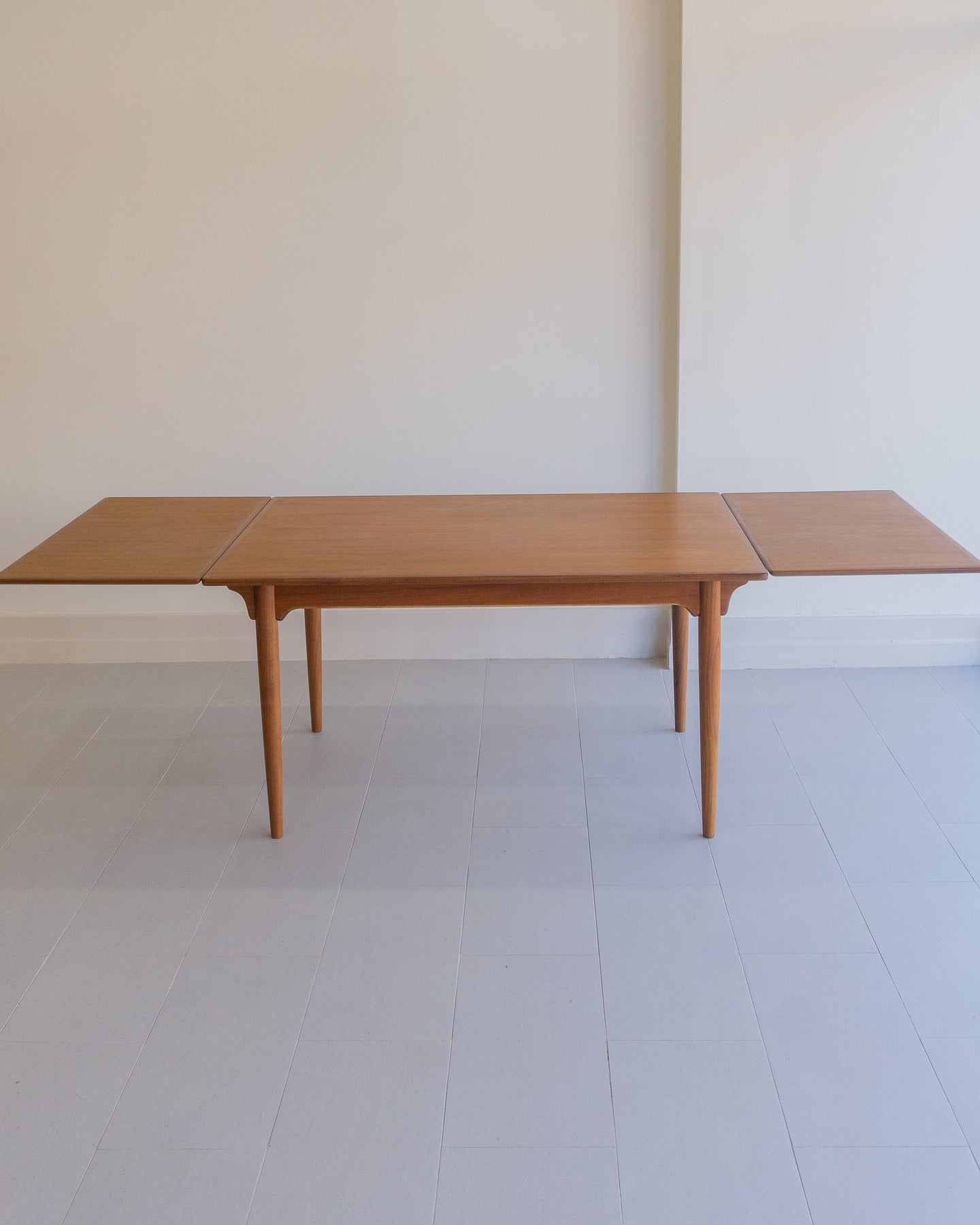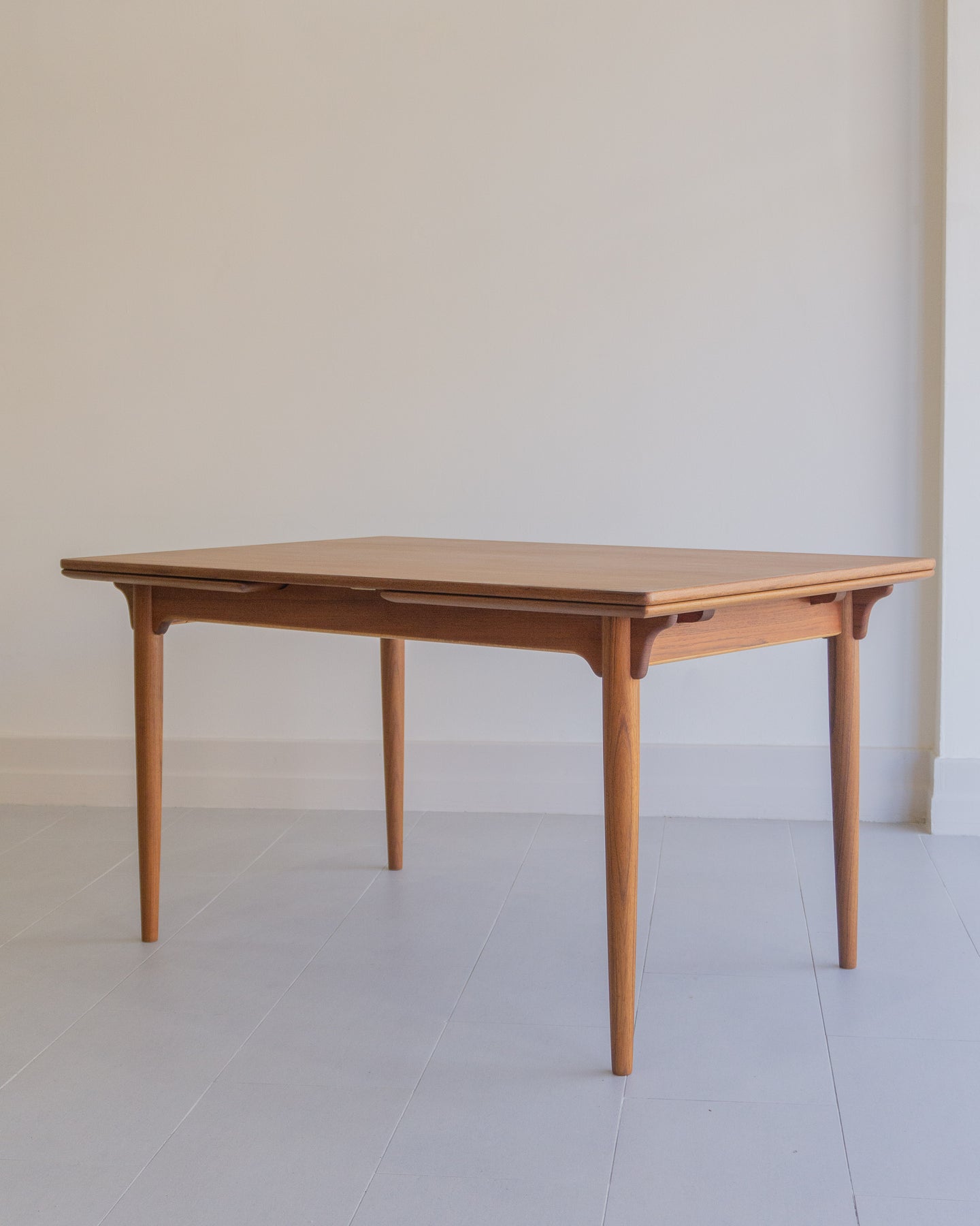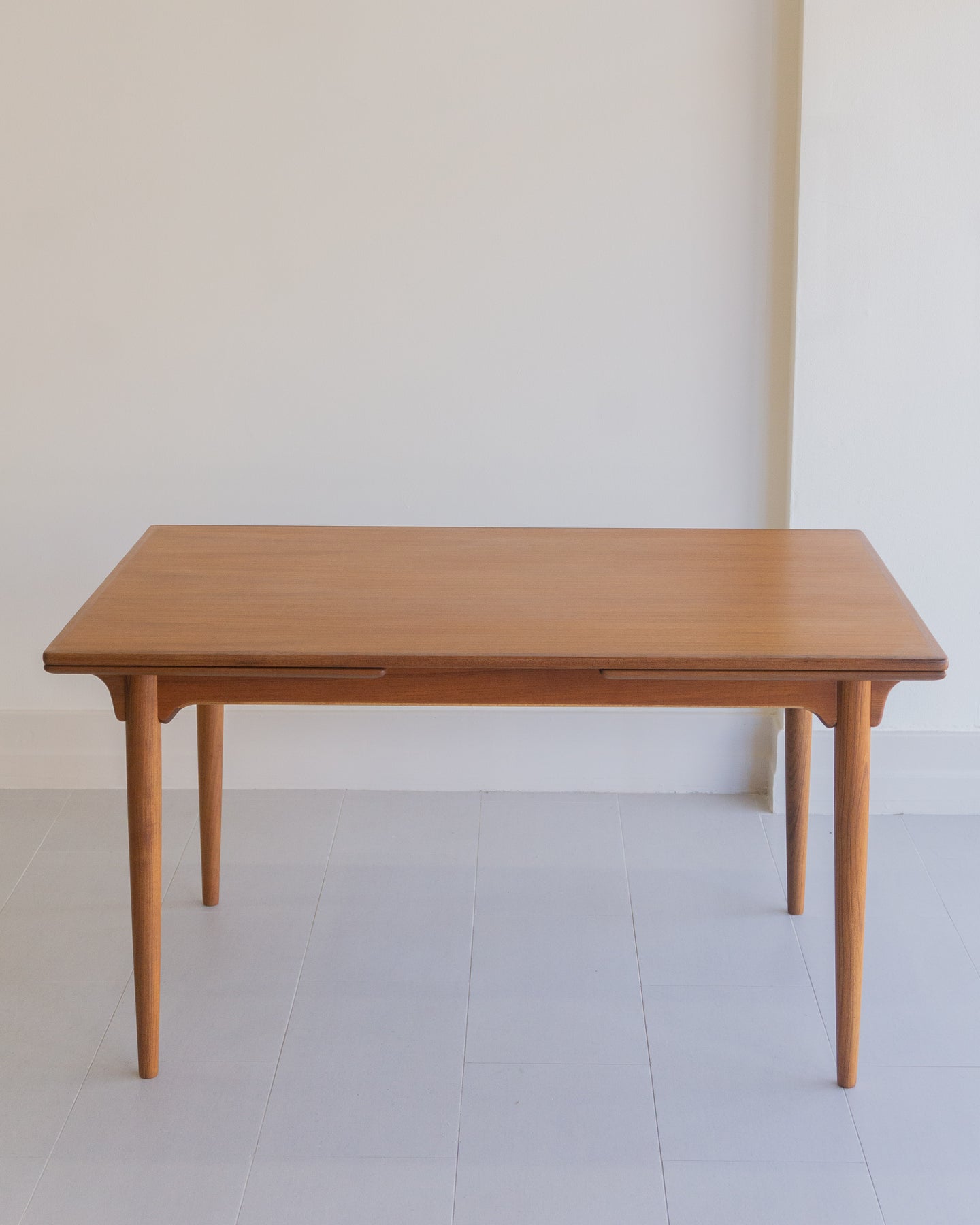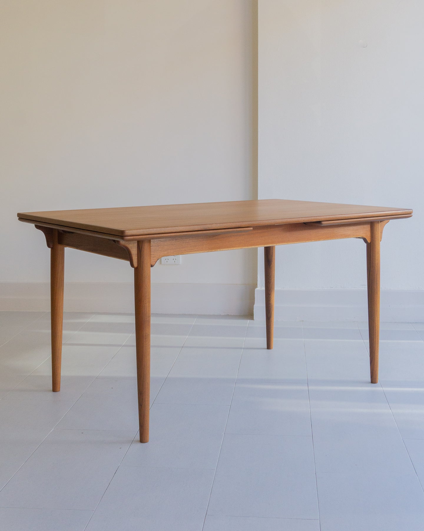 1960's Extendable dining table by Gunni Omann Jun Møbelfabrik (Denmark). Teak cigar leg frame, top with solid timber edging, & extension leaves.