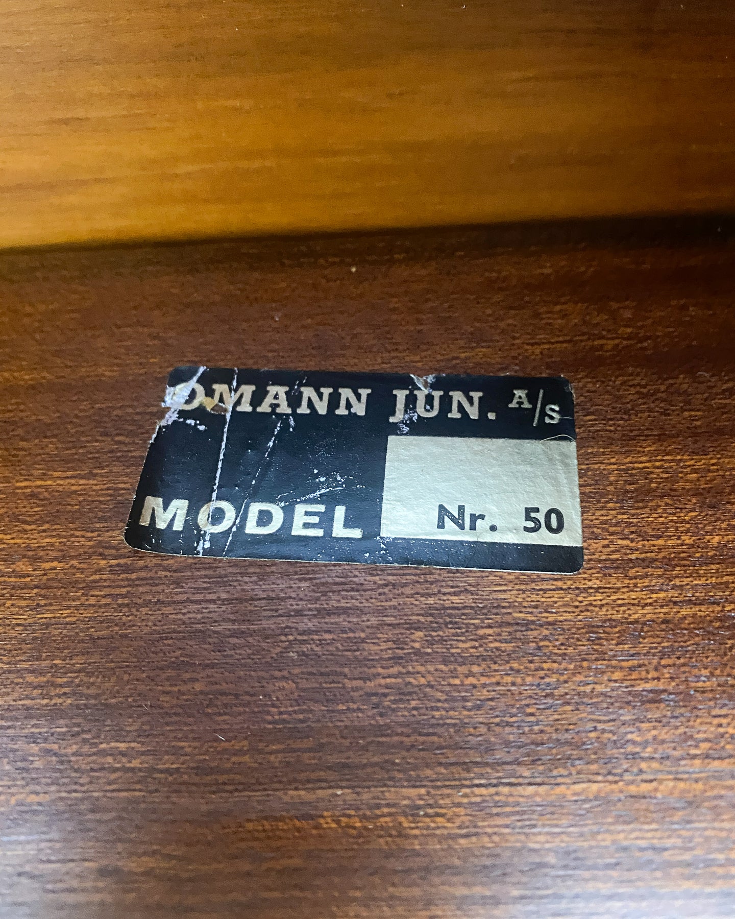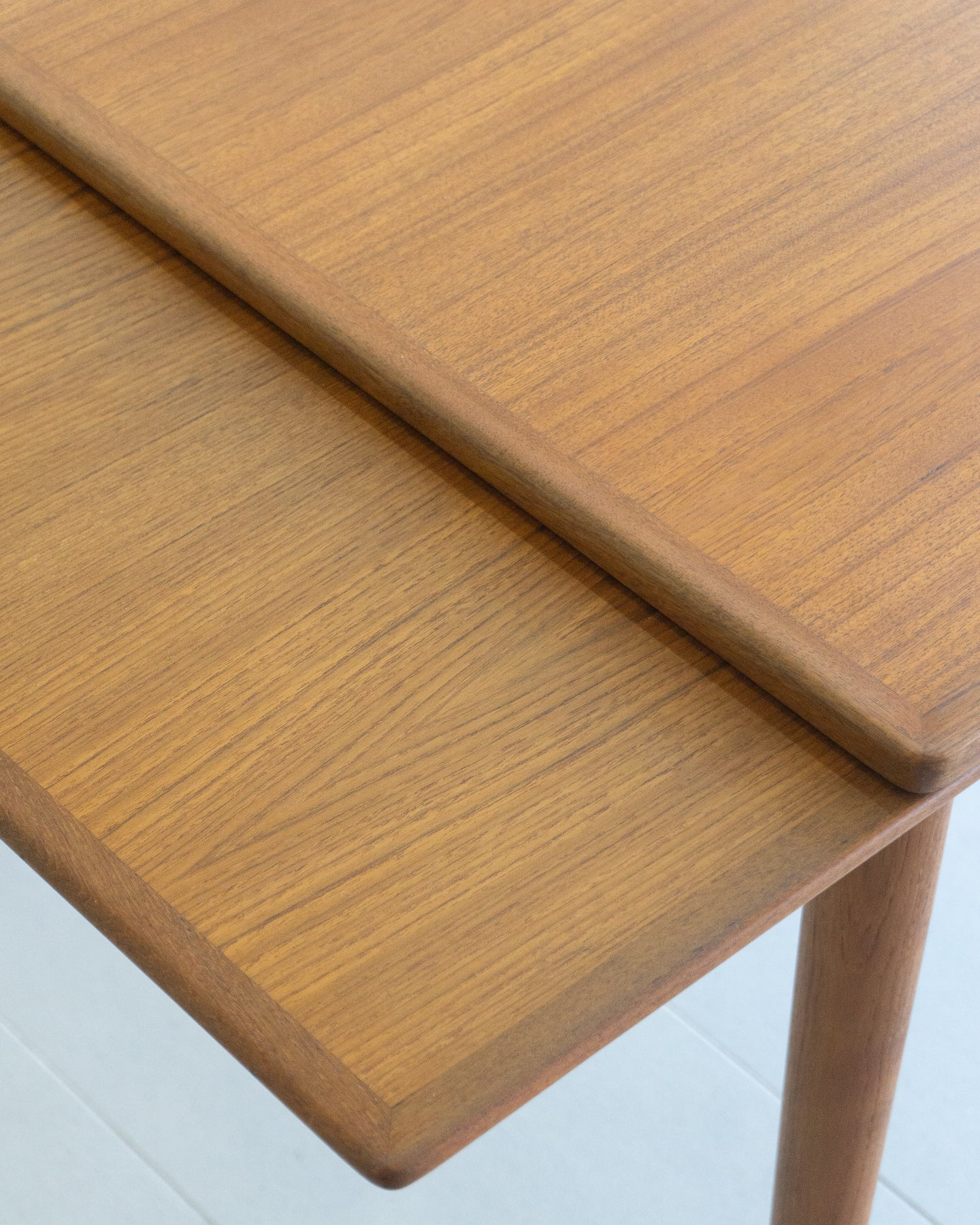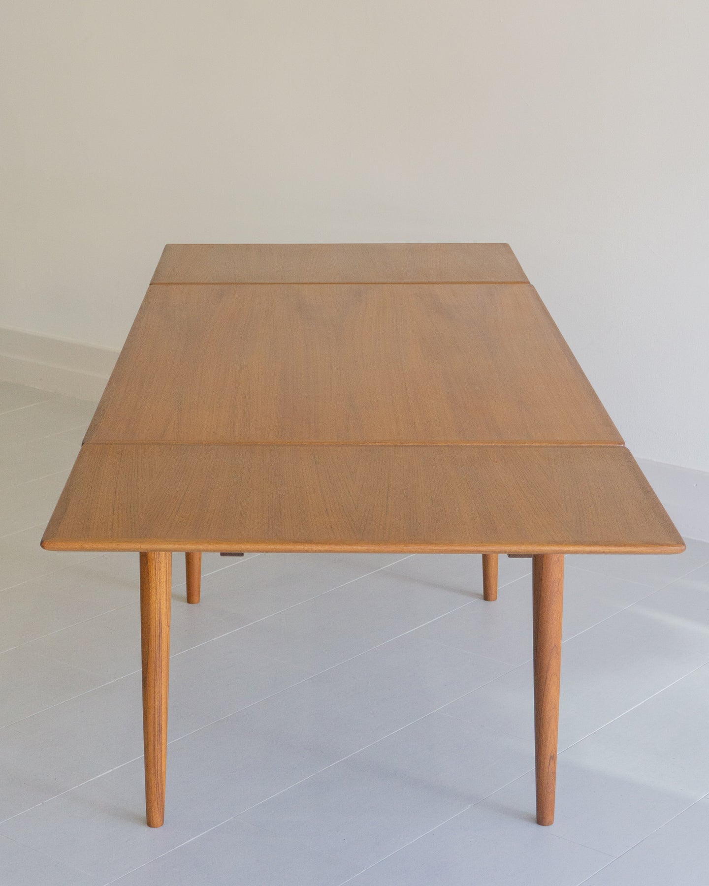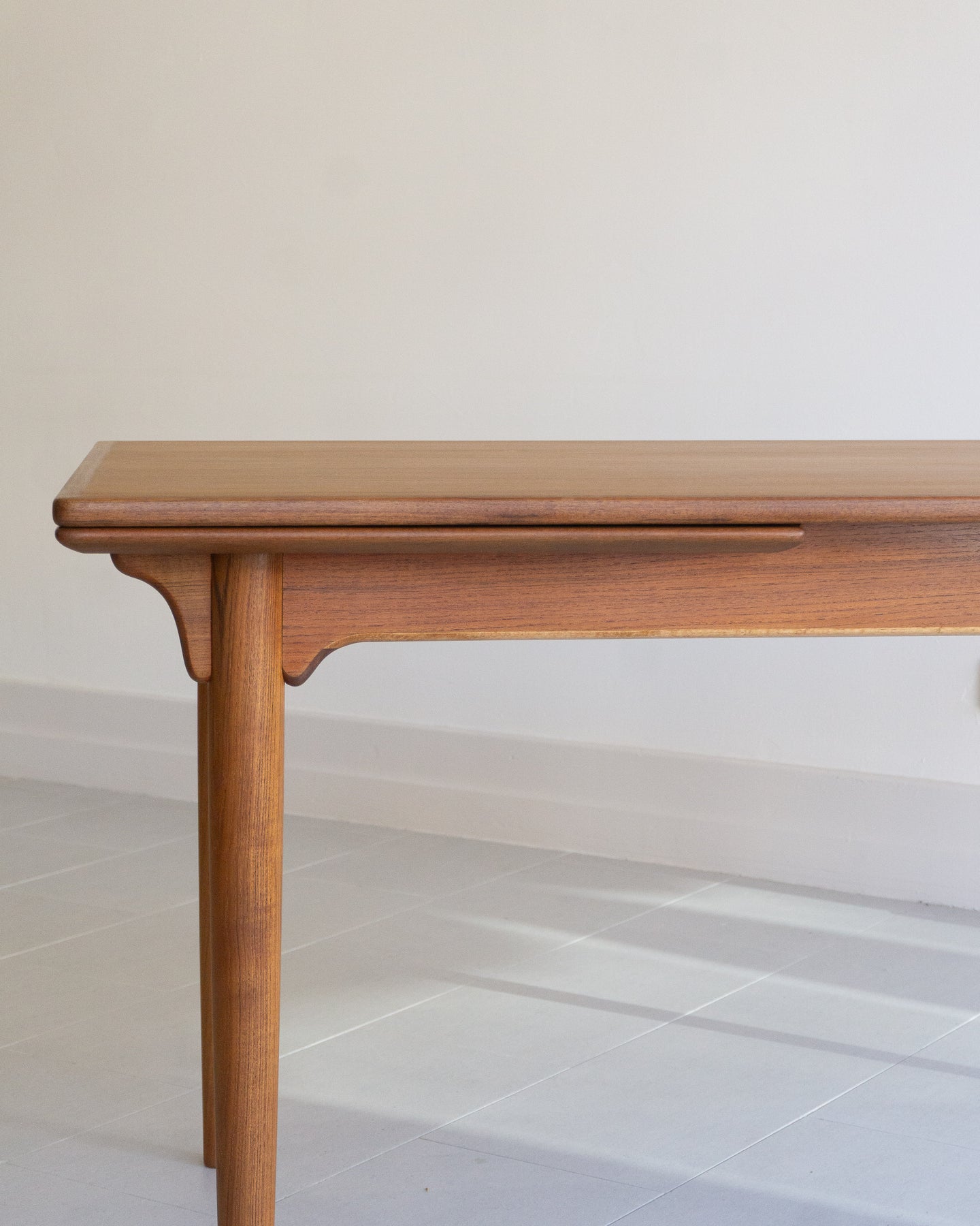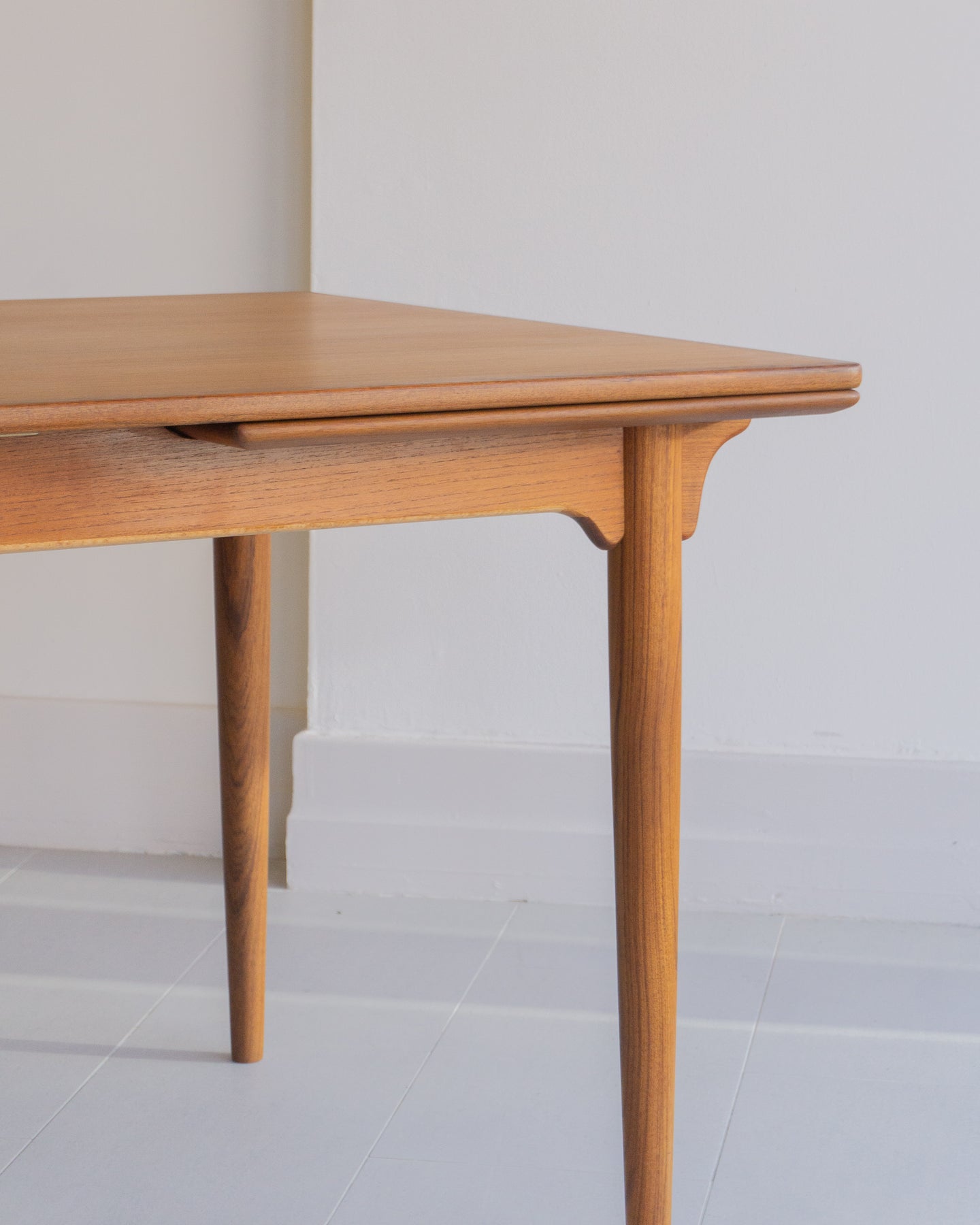 1960's Extendable dining table by Gunni Omann Jun Møbelfabrik (Denmark). Teak cigar leg frame, top with solid timber edging, & extension leaves.