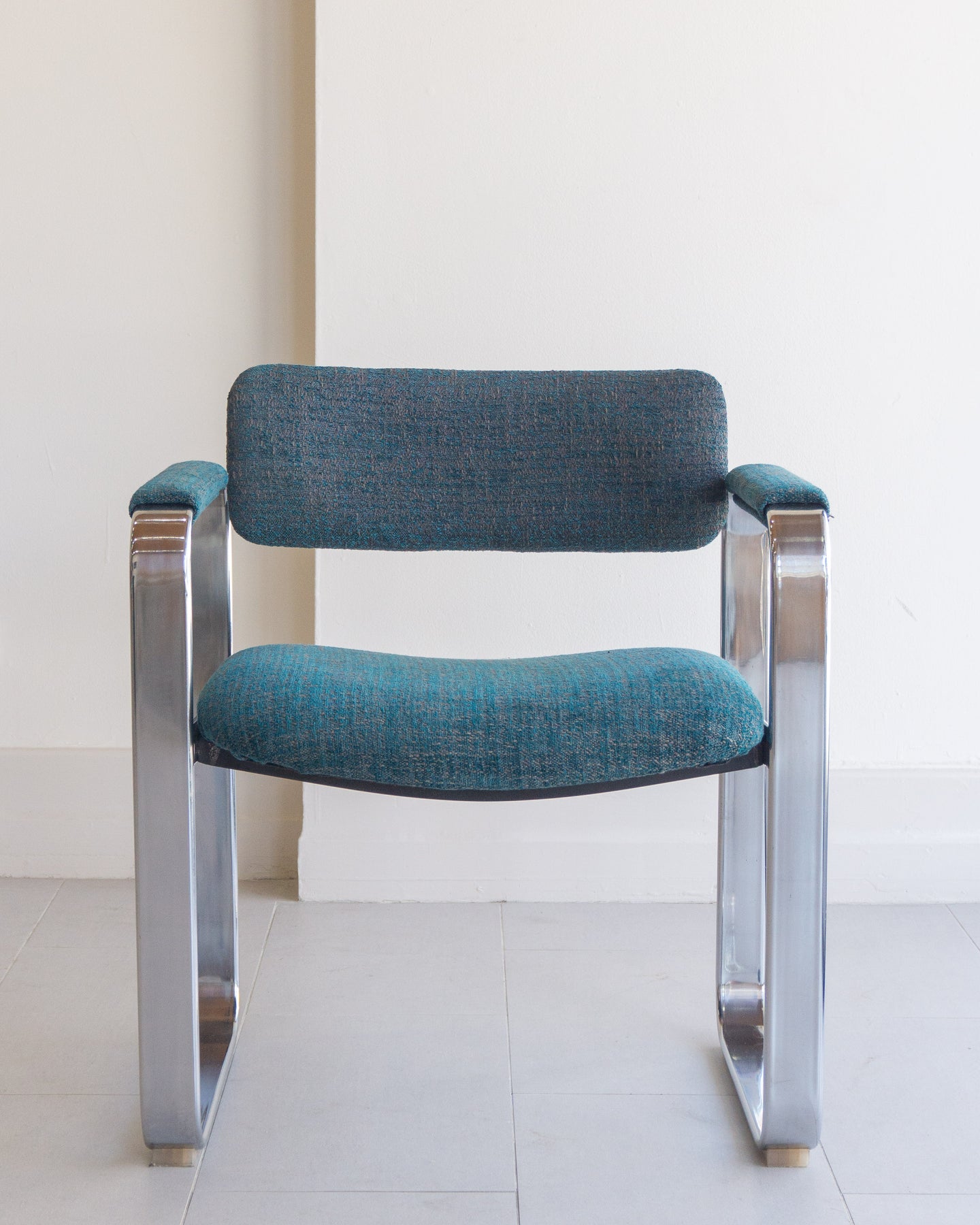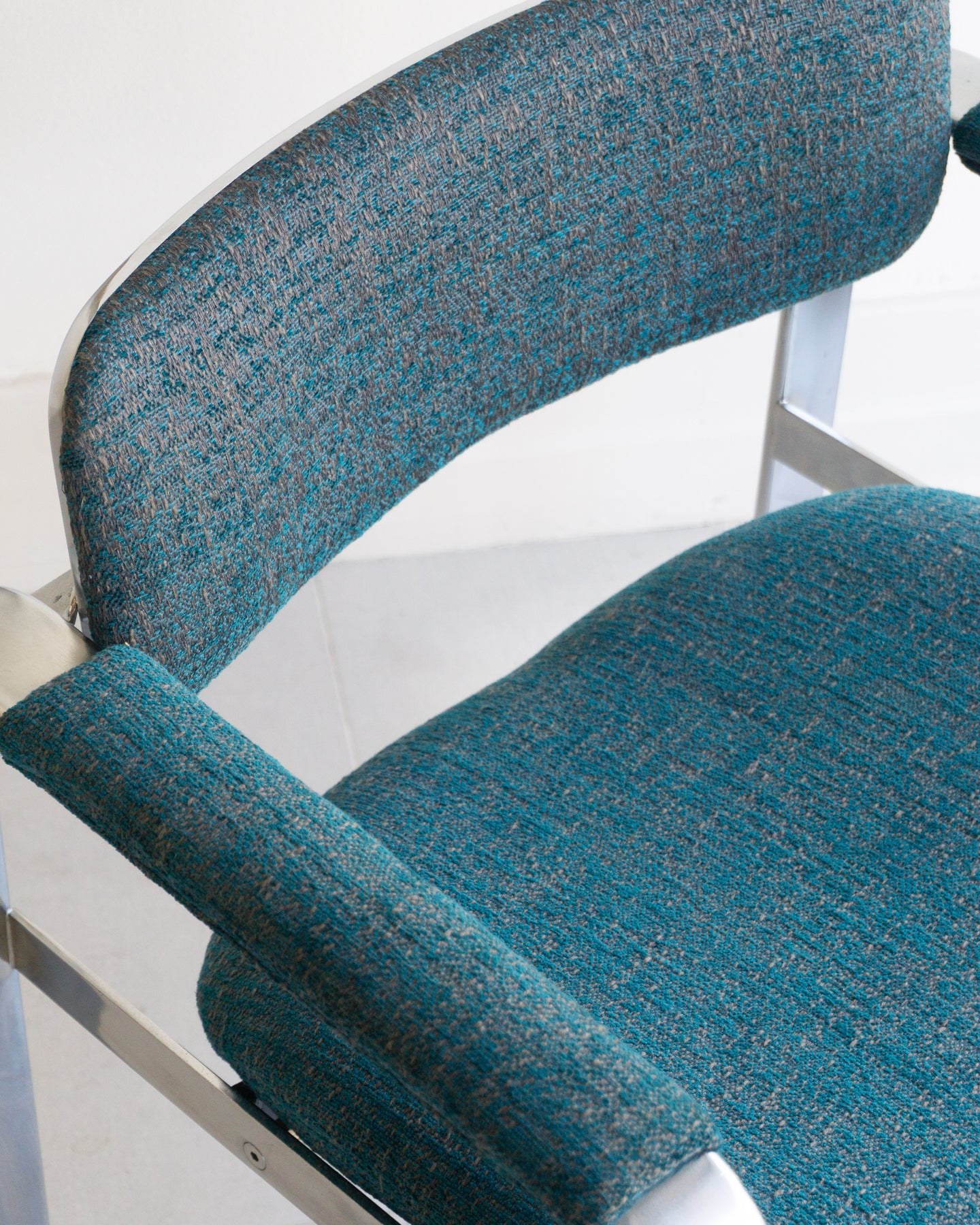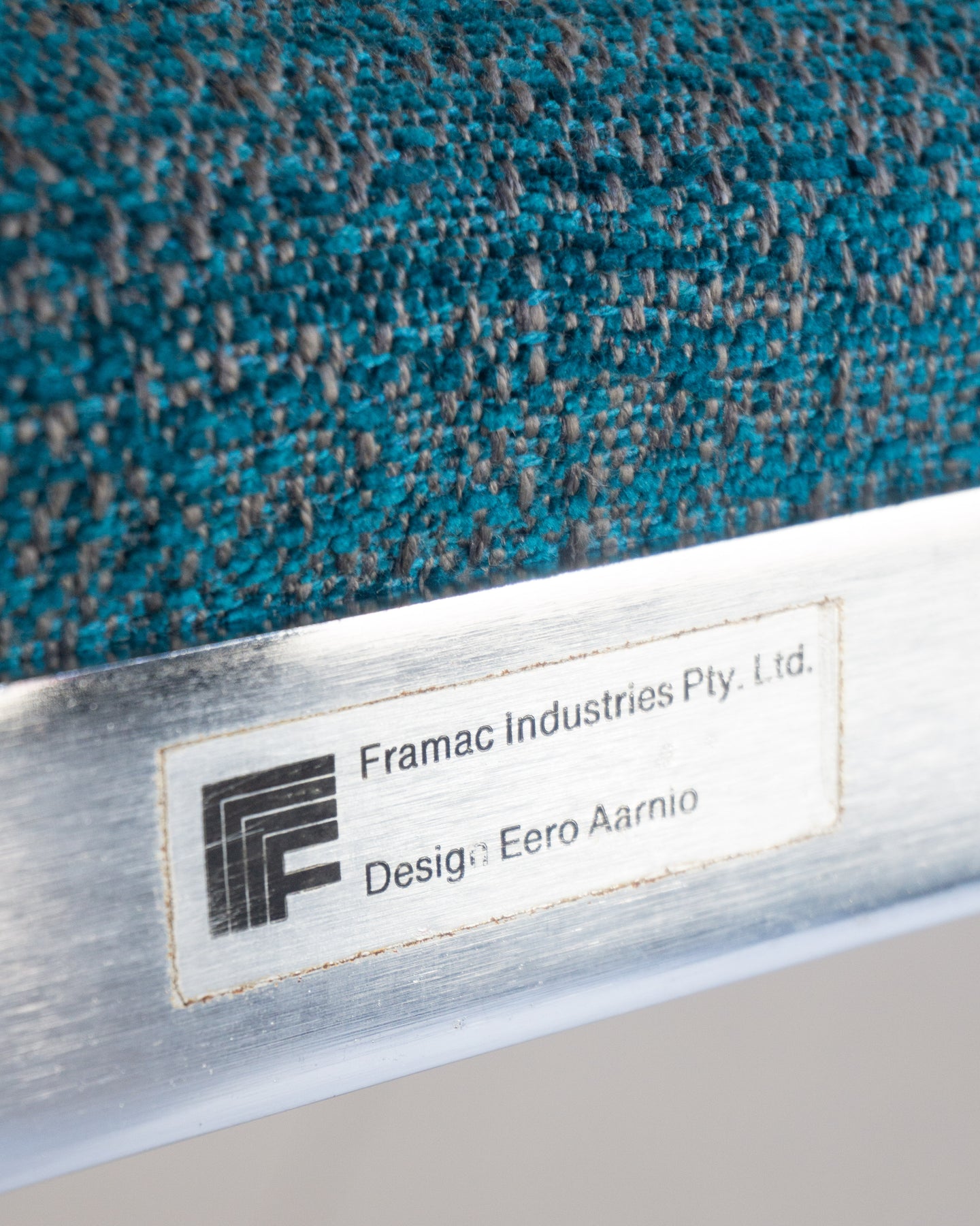 The Silver executive chair was designed by Eero Aarnio in 1968 for Mobel Italia and later produced by Framac Industries c.1980. The chair features solid steel chrome frame and cushioned seat upholstered in dark teal/beige Jacquard Chenille fabric.