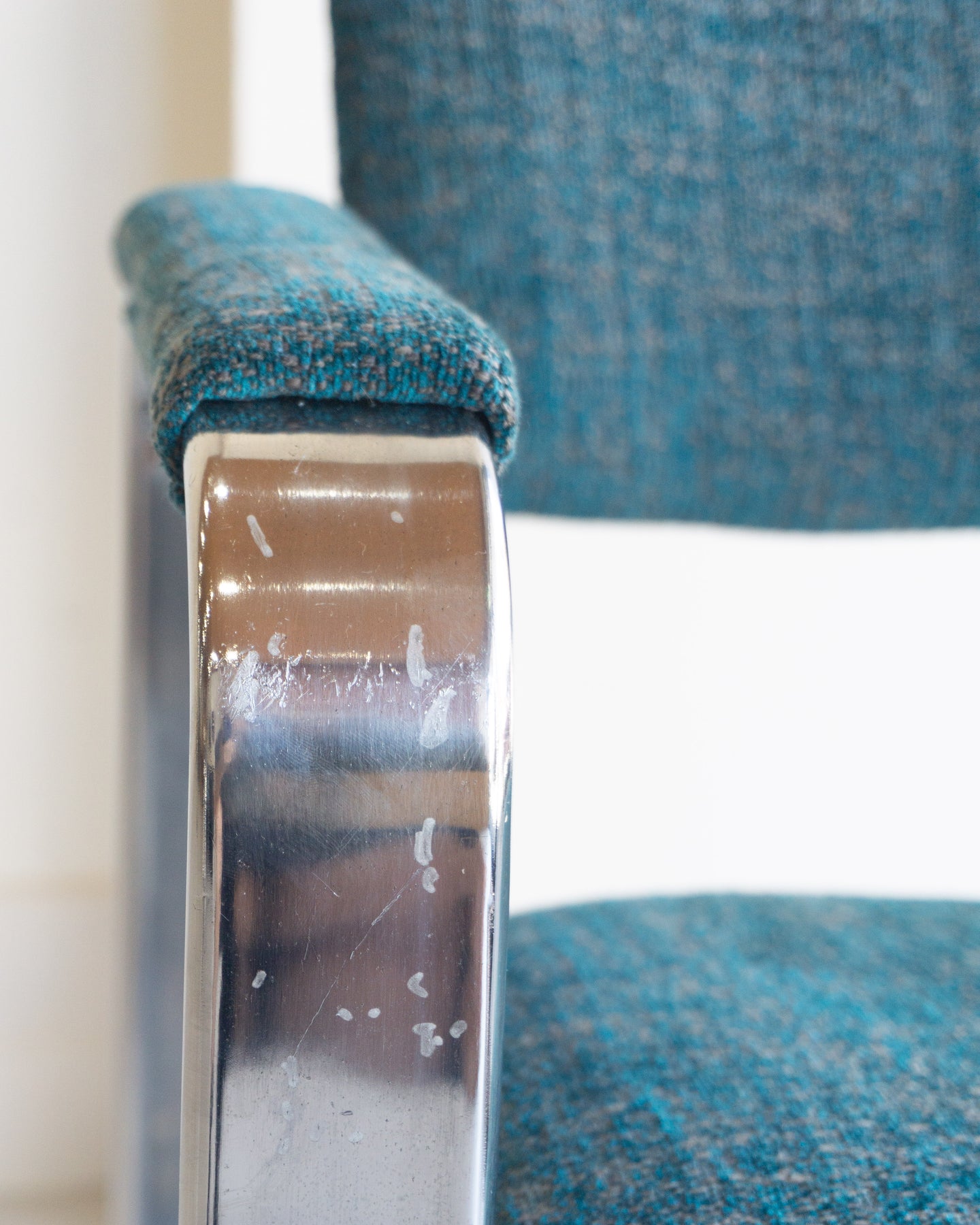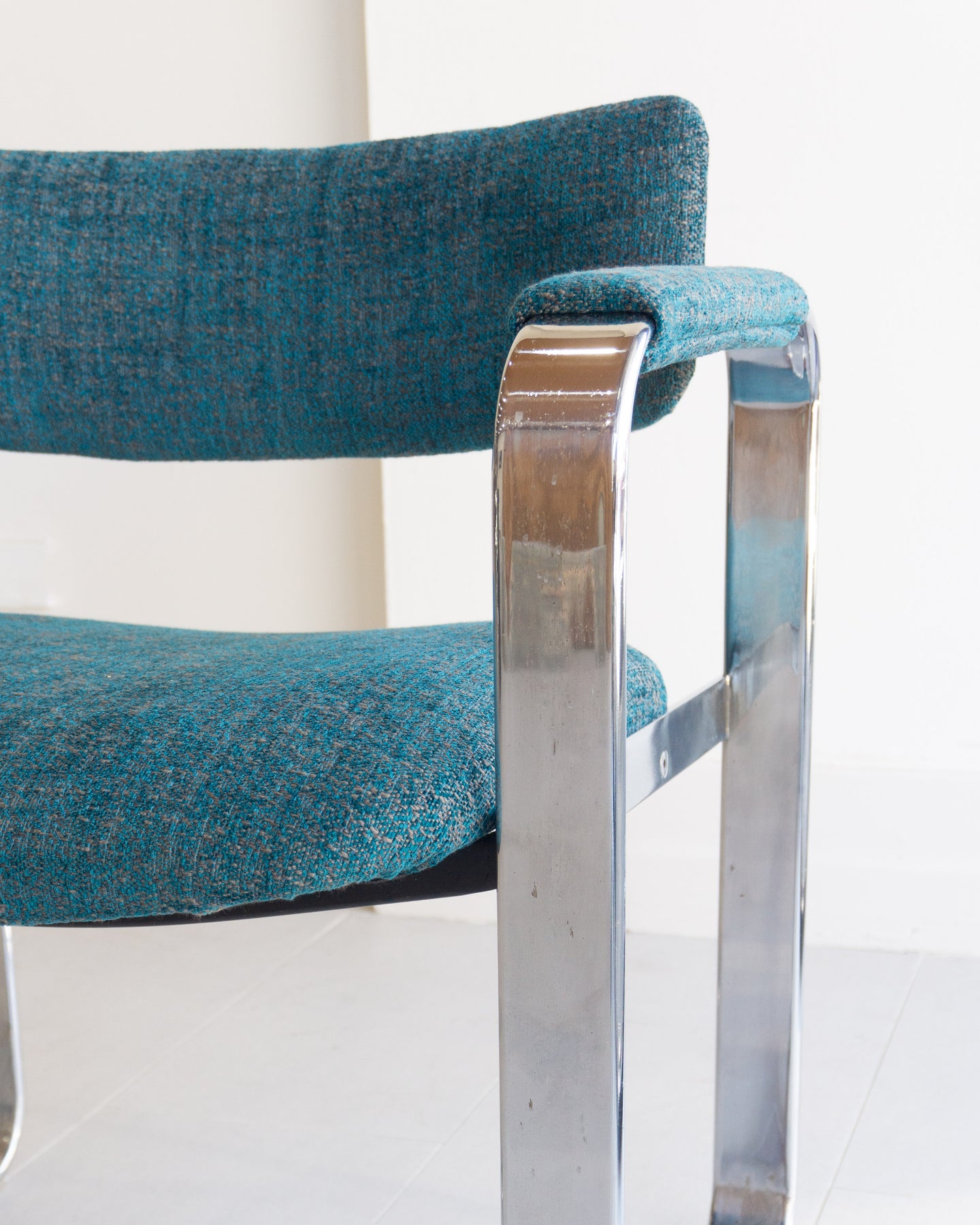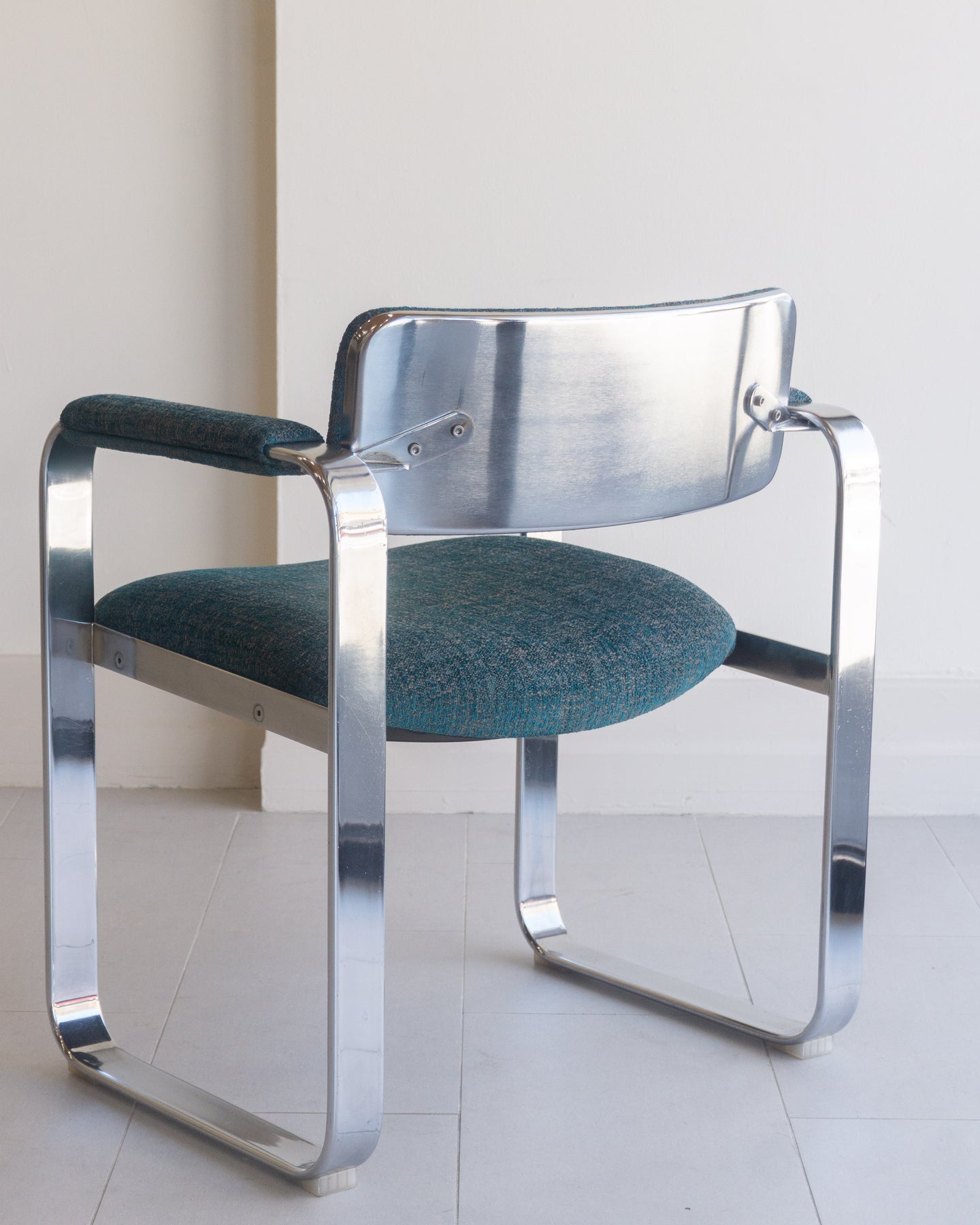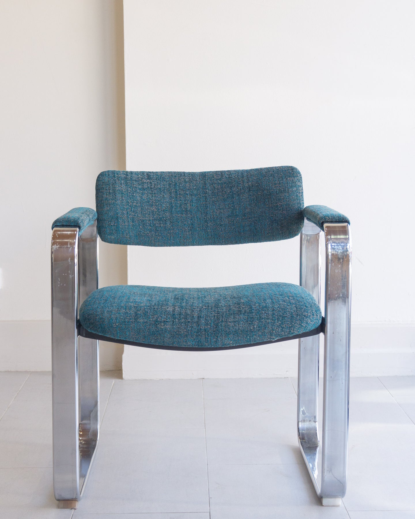 The Silver executive chair was designed by Eero Aarnio in 1968 for Mobel Italia and later produced by Framac Industries c.1980. The chair features solid steel chrome frame and cushioned seat upholstered in dark teal/beige Jacquard Chenille fabric.