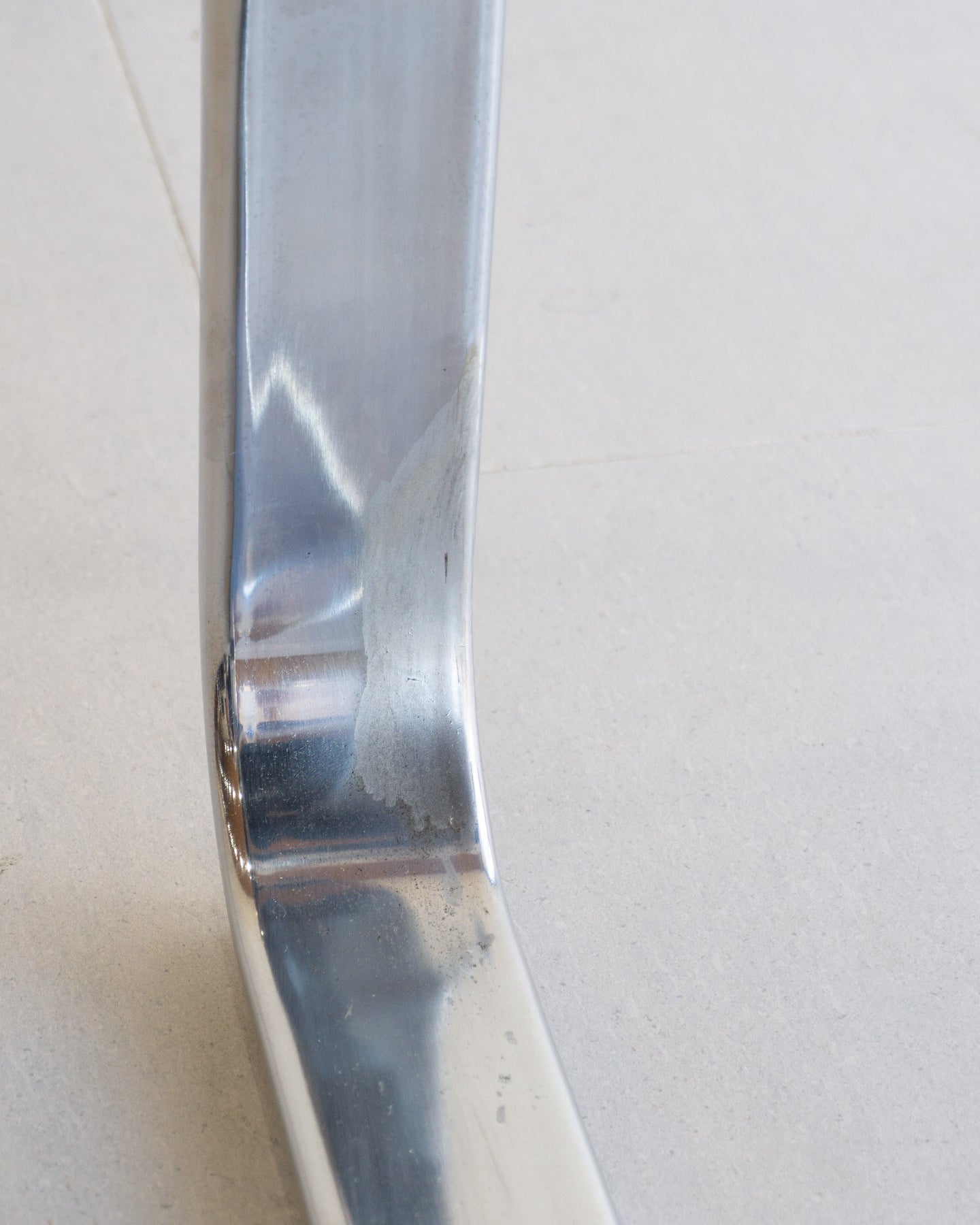 Condition: Fair. Recently reupholstered, so the fabric is in excellent condition. There are some scratches to the frame and an area touched up with an average paint repair (Pictured)