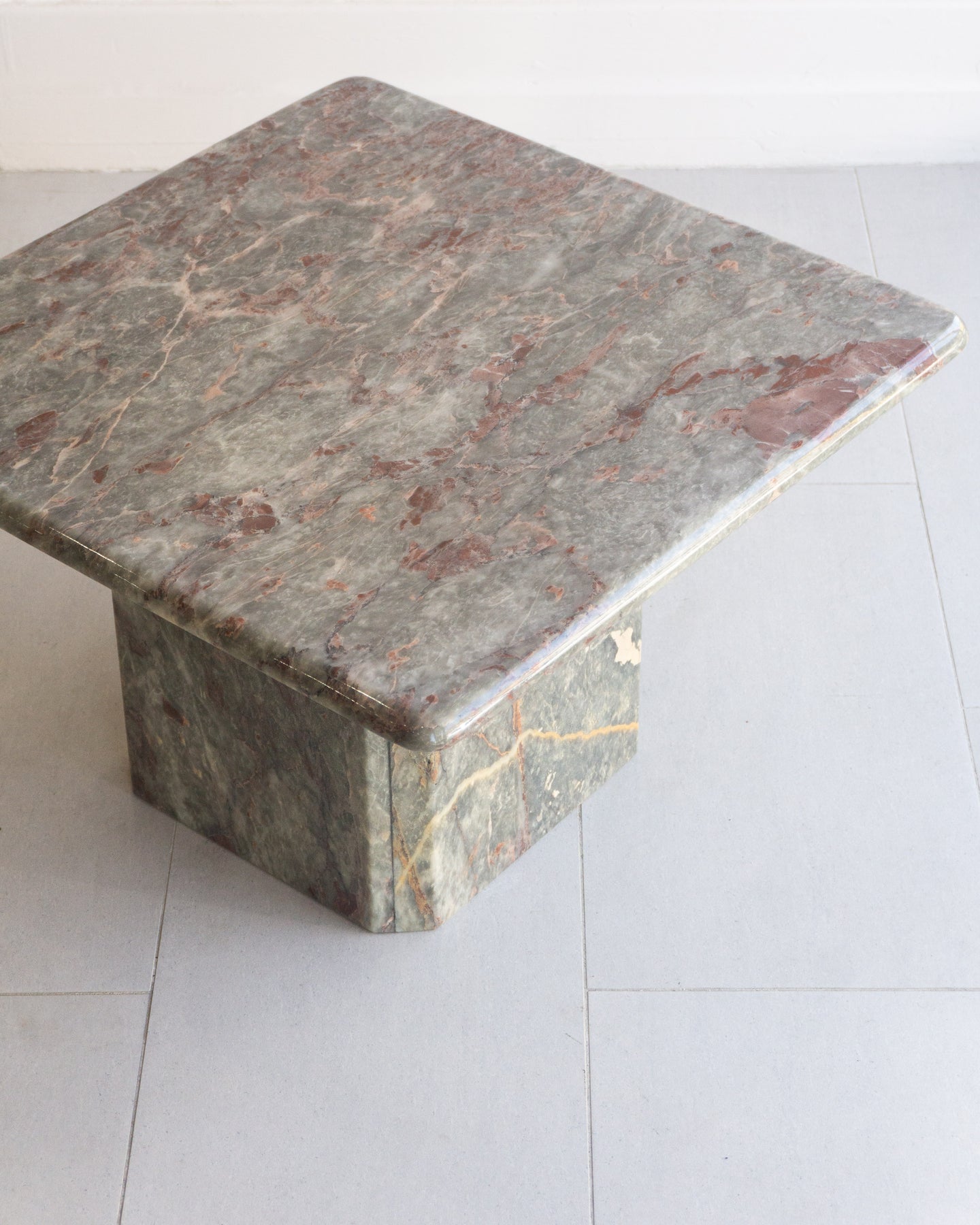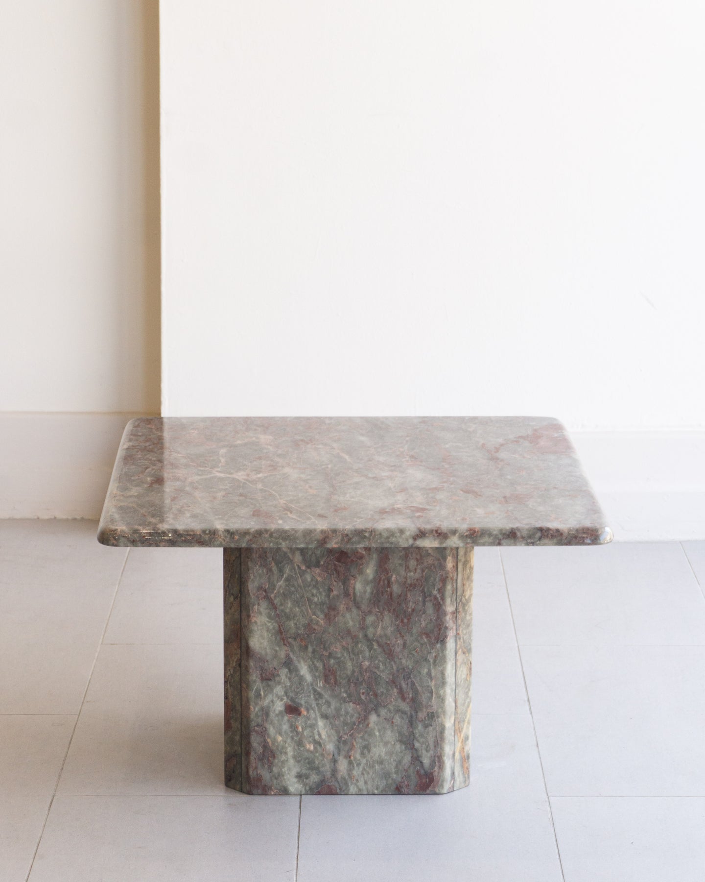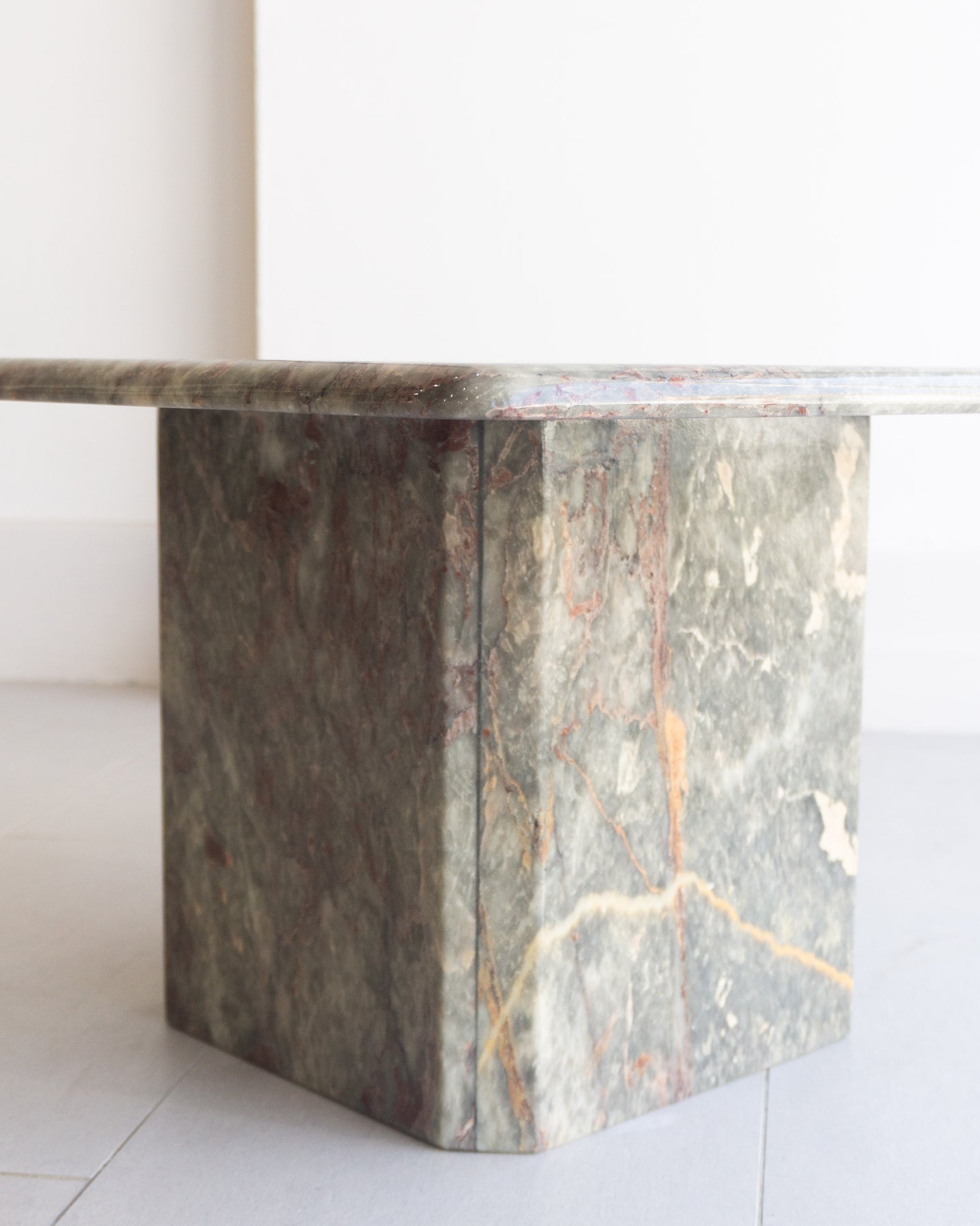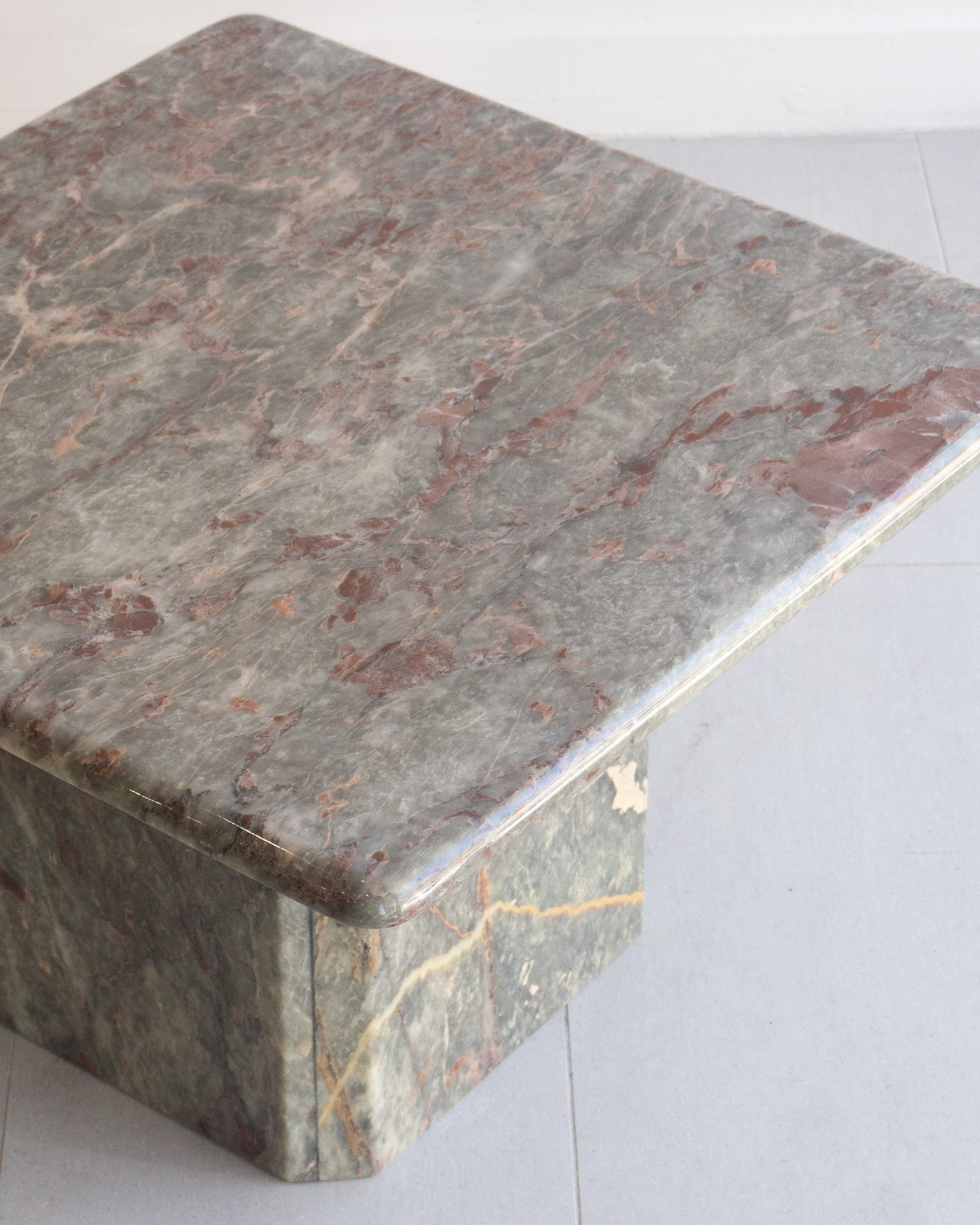 Vintage Coffee table made from Salome marble from the North-West region of Turkey. This natural stone can be found throughout Turkish historical buildings. The Marble has a cloudy grey base colour that I think presents as a muted light green, with burgundy, beige, and white veins and speckles. The table features a rounded-edge top and a base with Beveled corners.