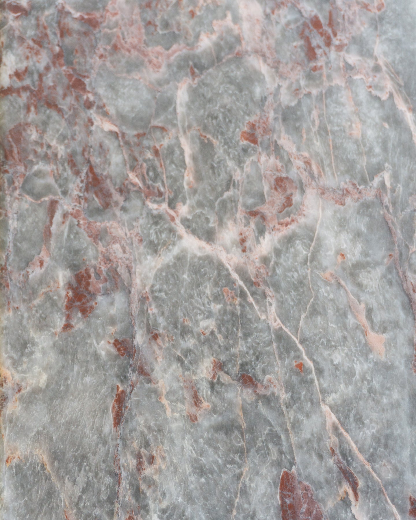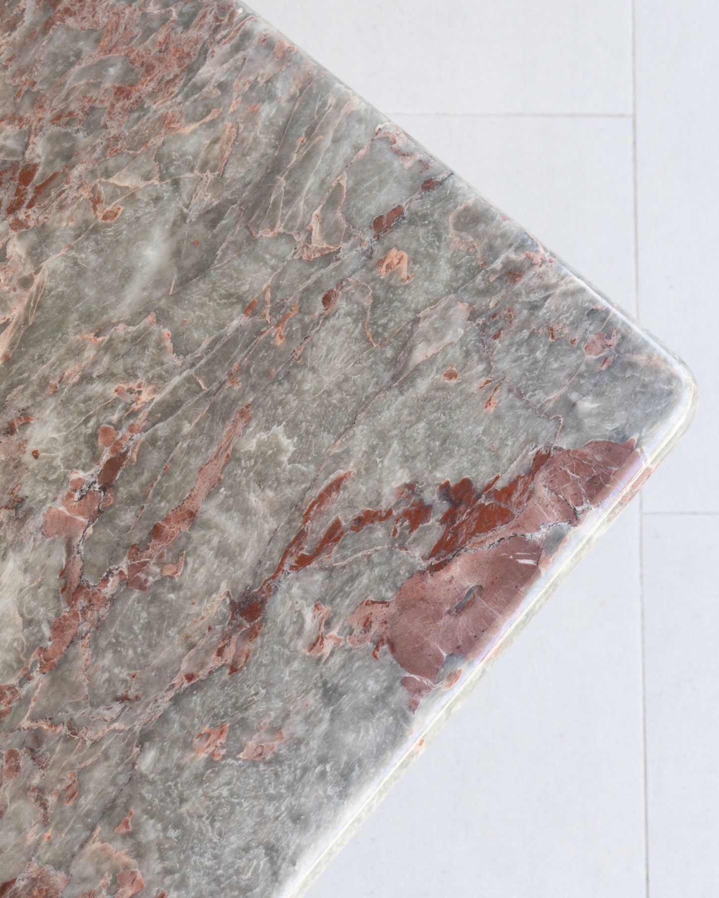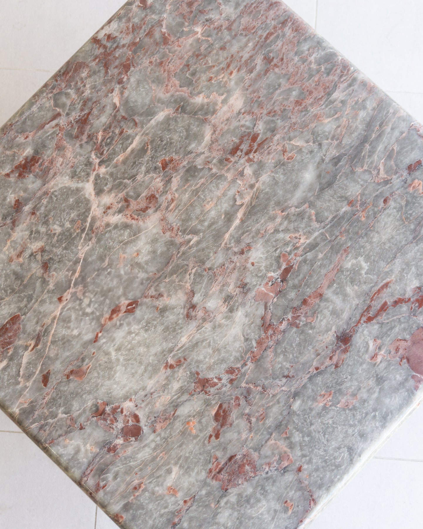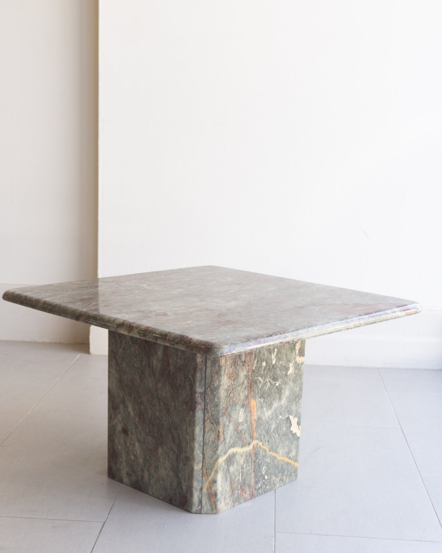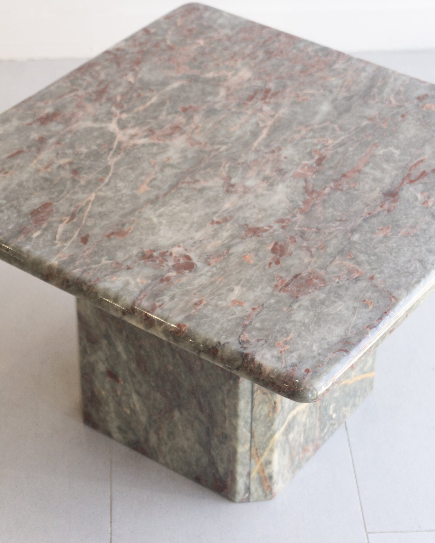 Vintage Coffee table made from Salome marble from the North-West region of Turkey. This natural stone can be found throughout Turkish historical buildings. The Marble has a cloudy grey base colour that I think presents as a muted light green, with burgundy, beige, and white veins and speckles. The table features a rounded-edge top and a base with Beveled corners.