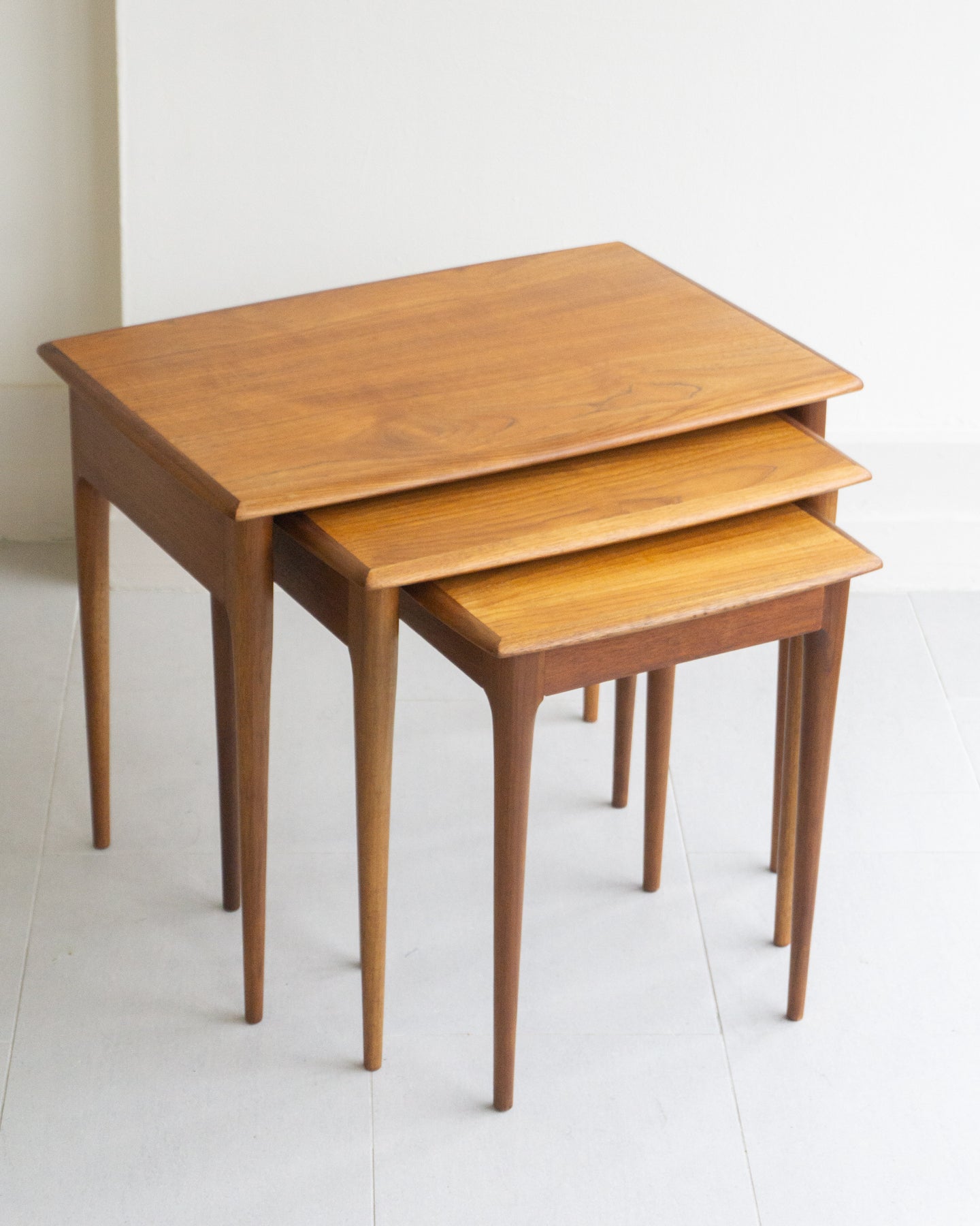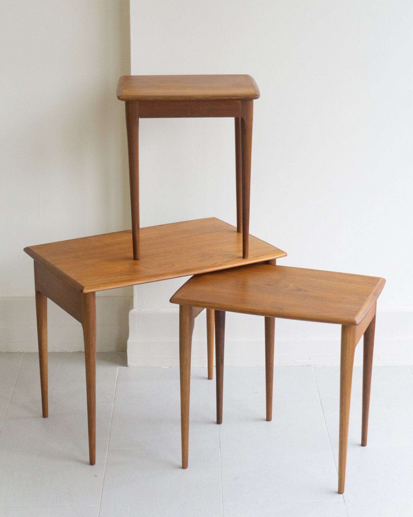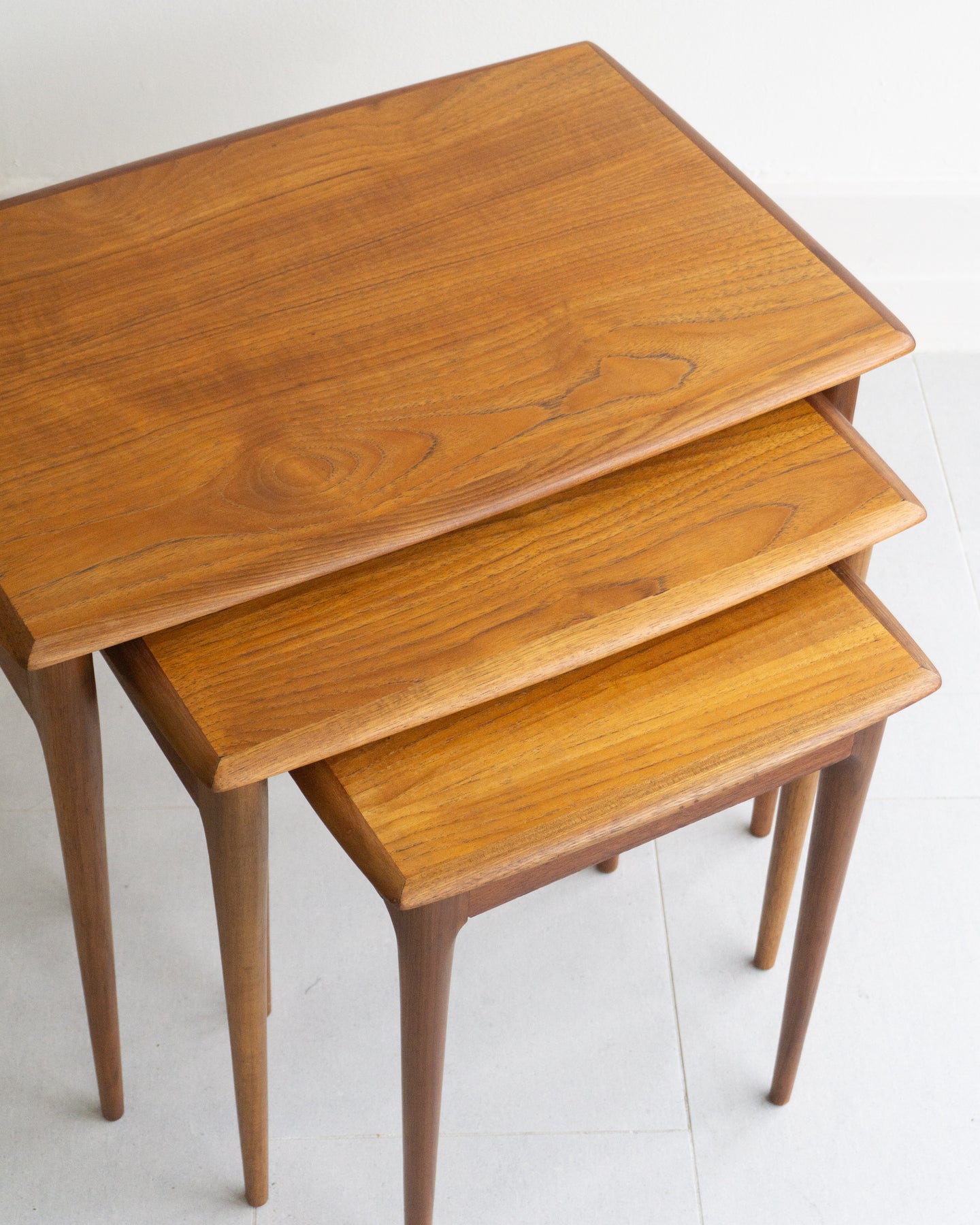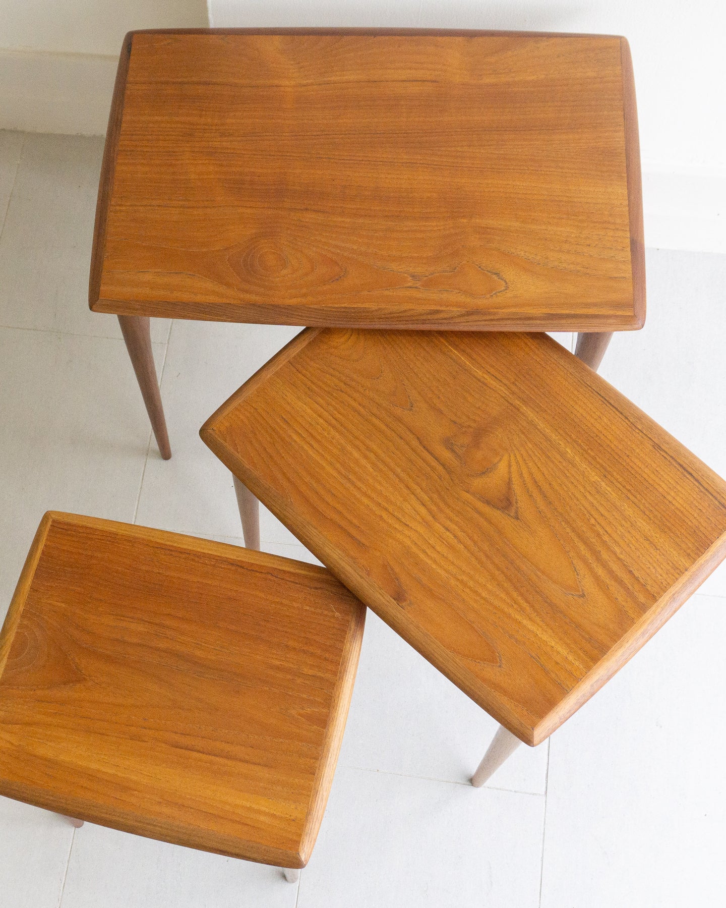 Vintage teak nesting tables by Alpa Furniture, a set of three tables with toothpick legs and contoured timber edges.