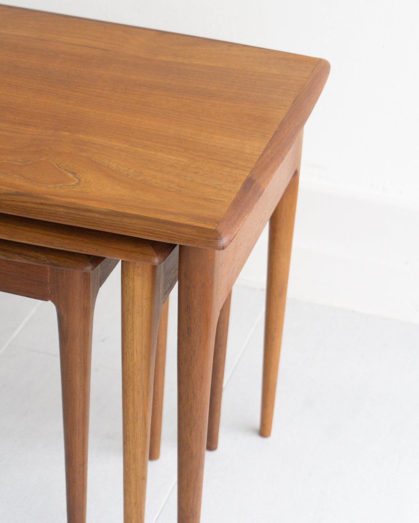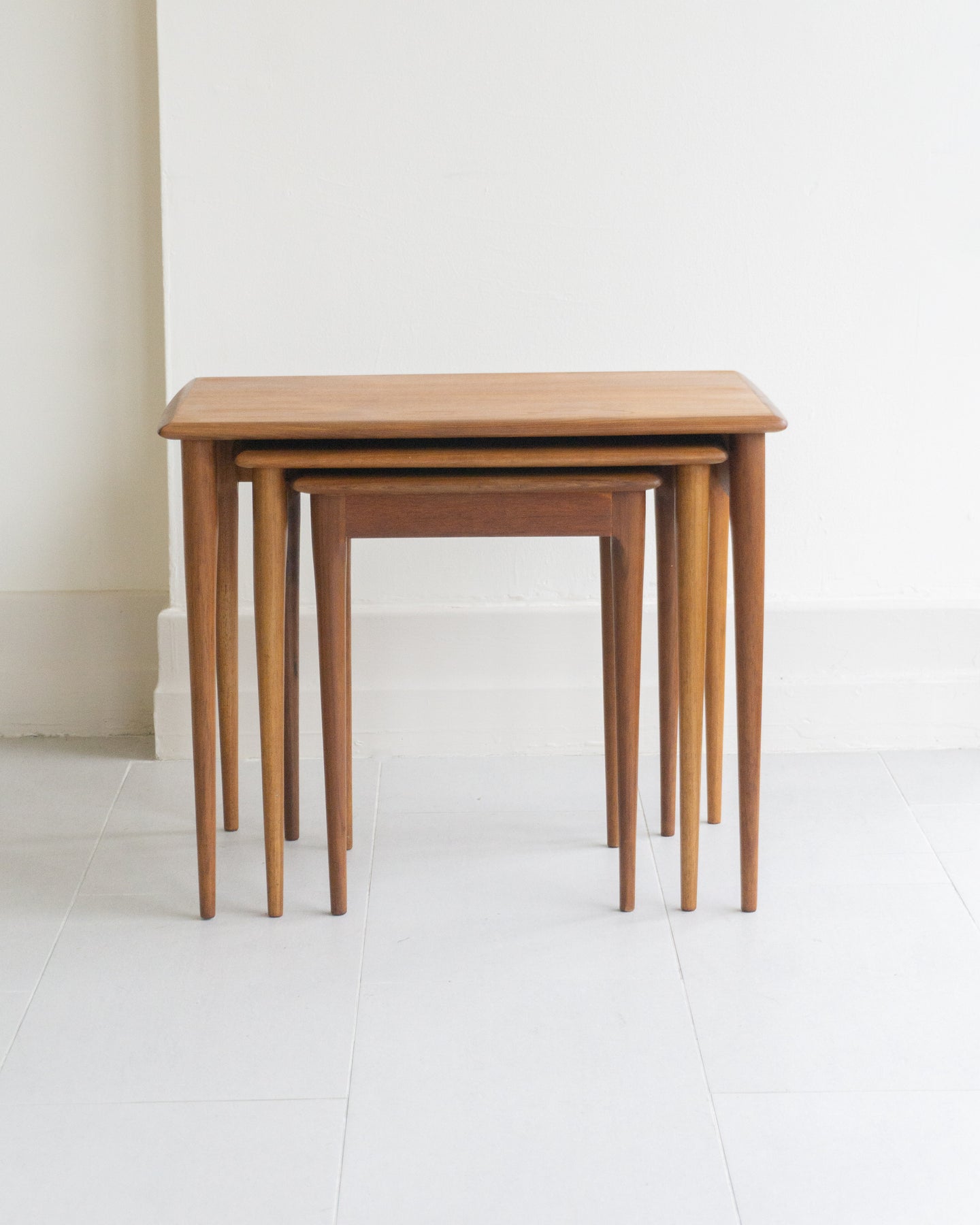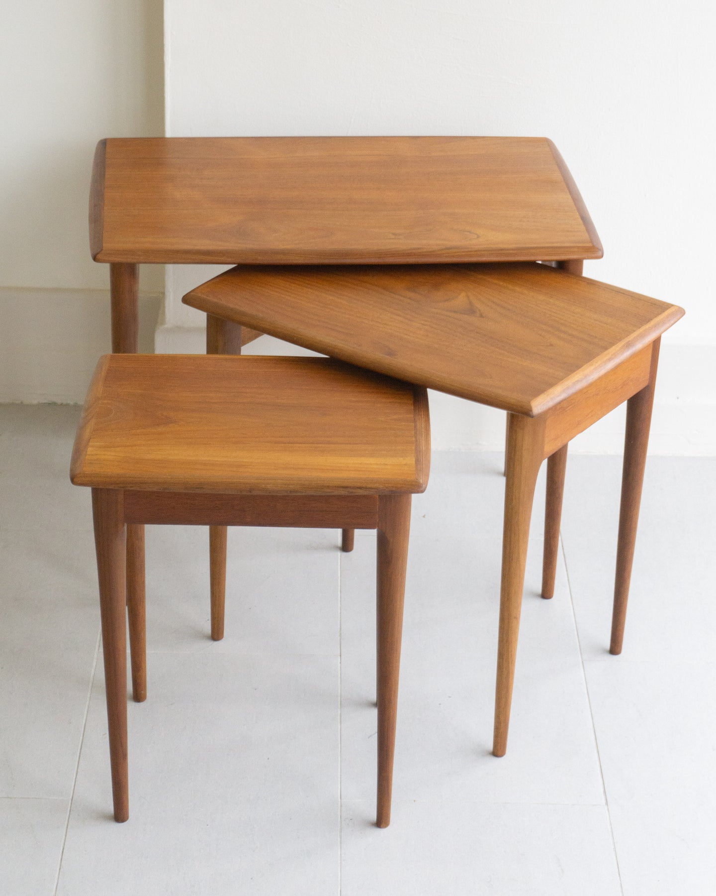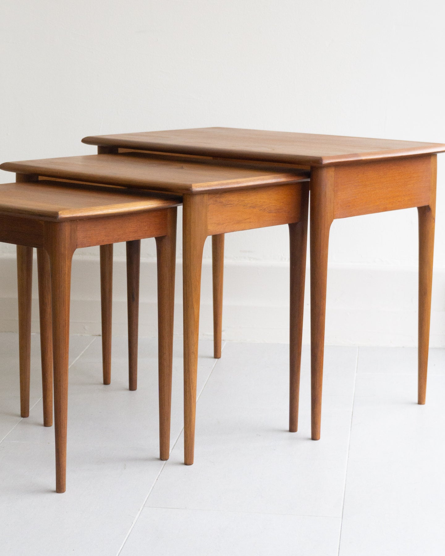 Vintage teak nesting tables by Alpa Furniture, a set of three tables with toothpick legs and contoured timber edges.