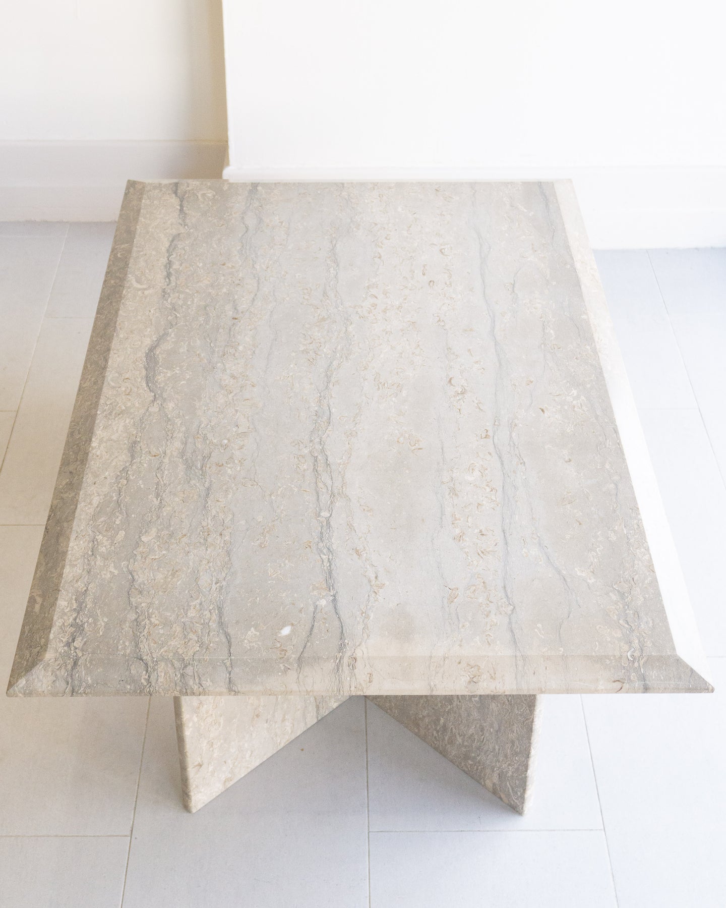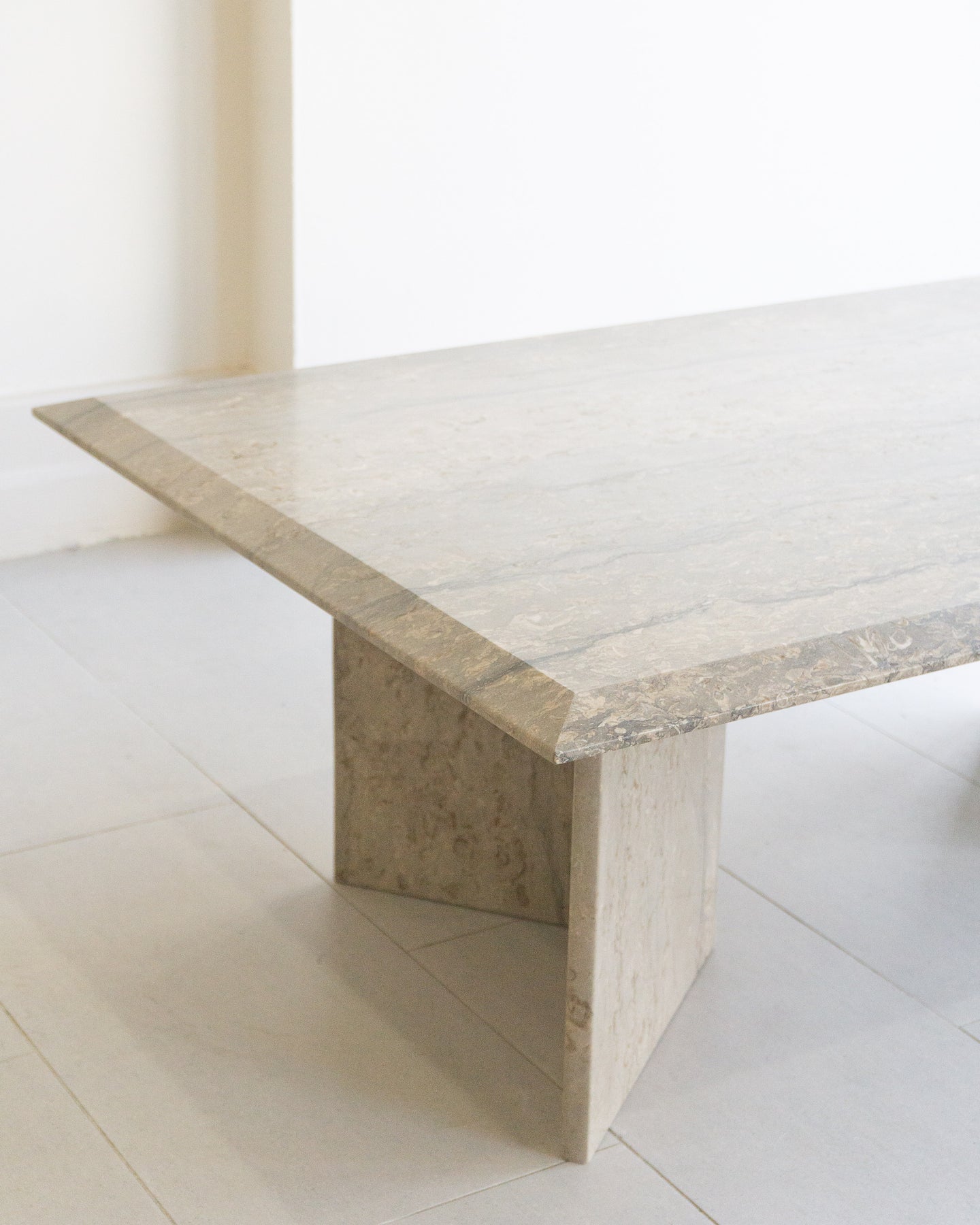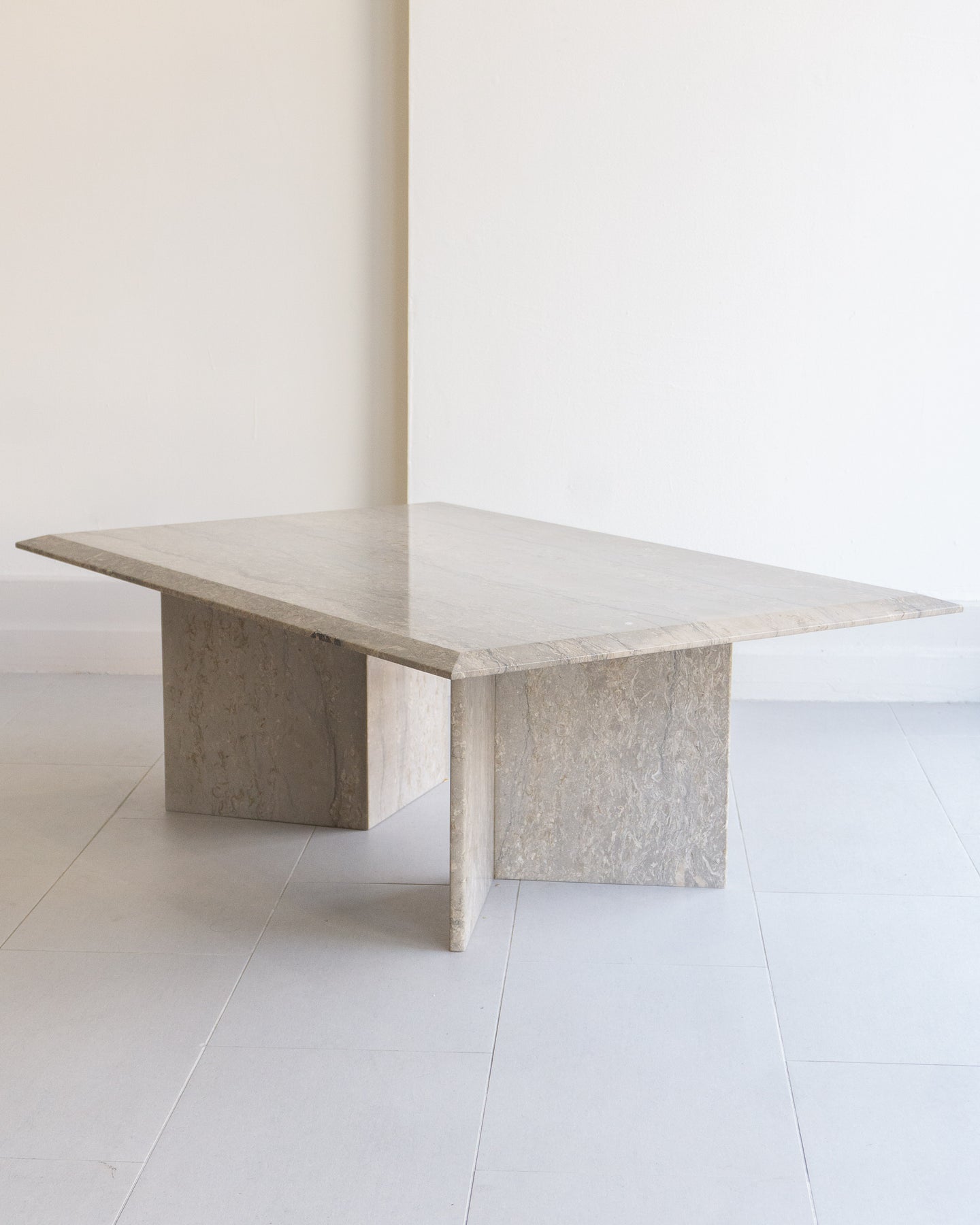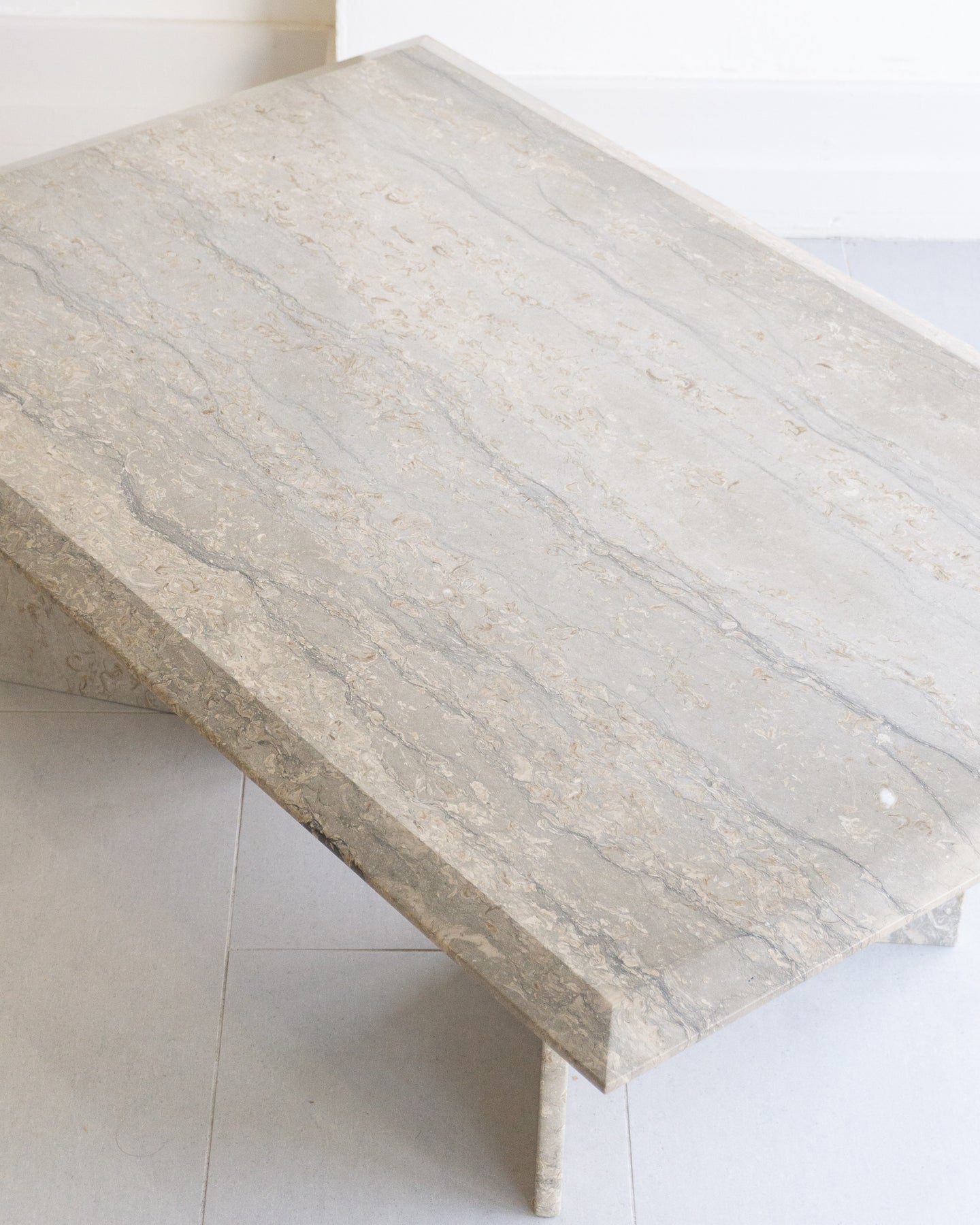 Large vintage coffee table made with Italian silver travertine, light grey base tone with grey veining and beige/ white stone. chamfered edge top on a V-shaped base.