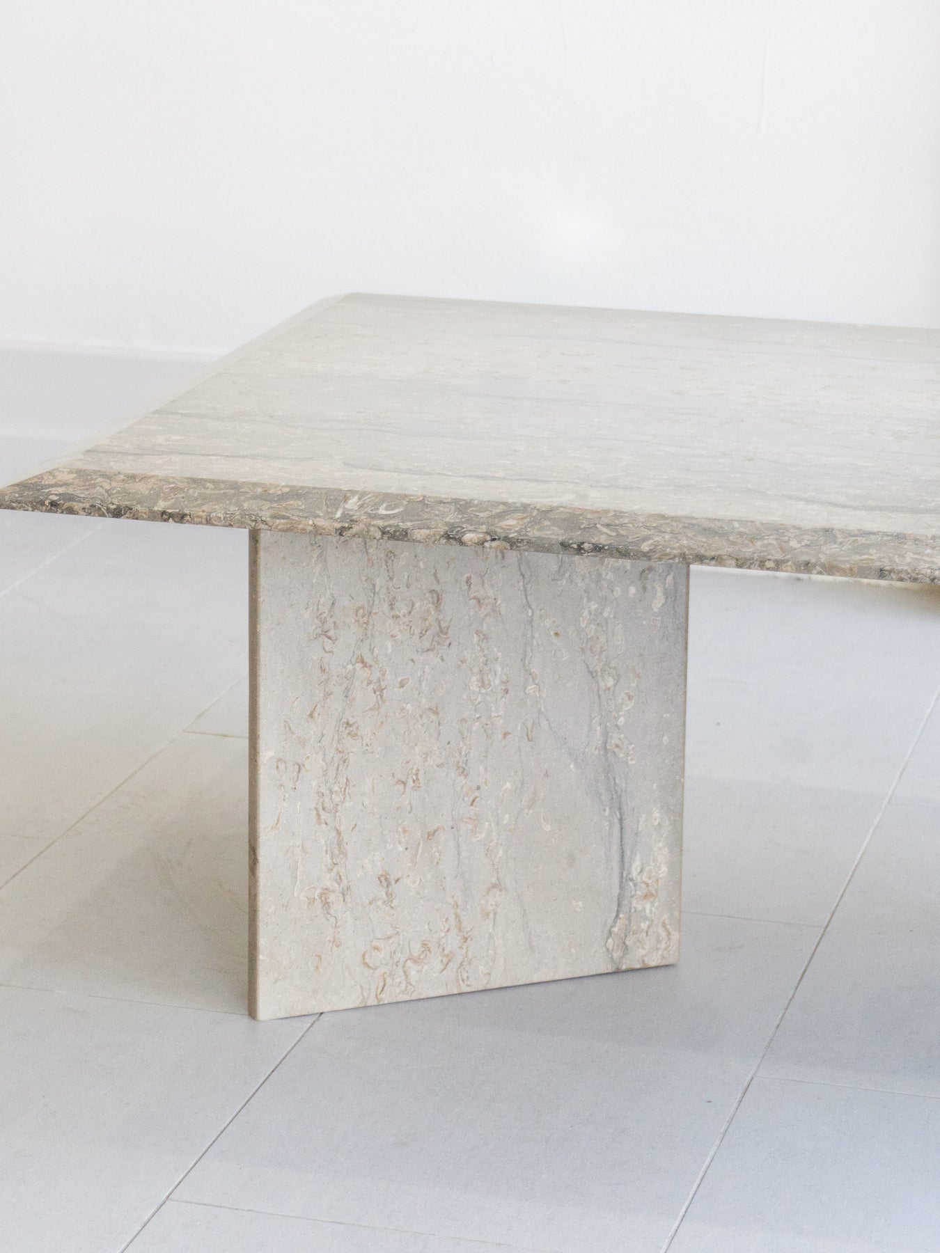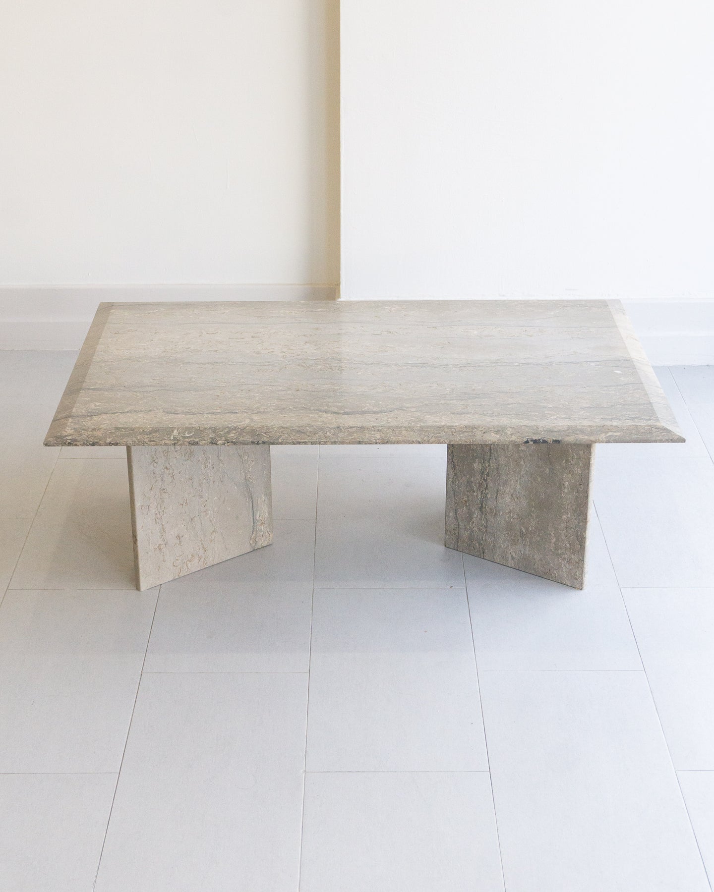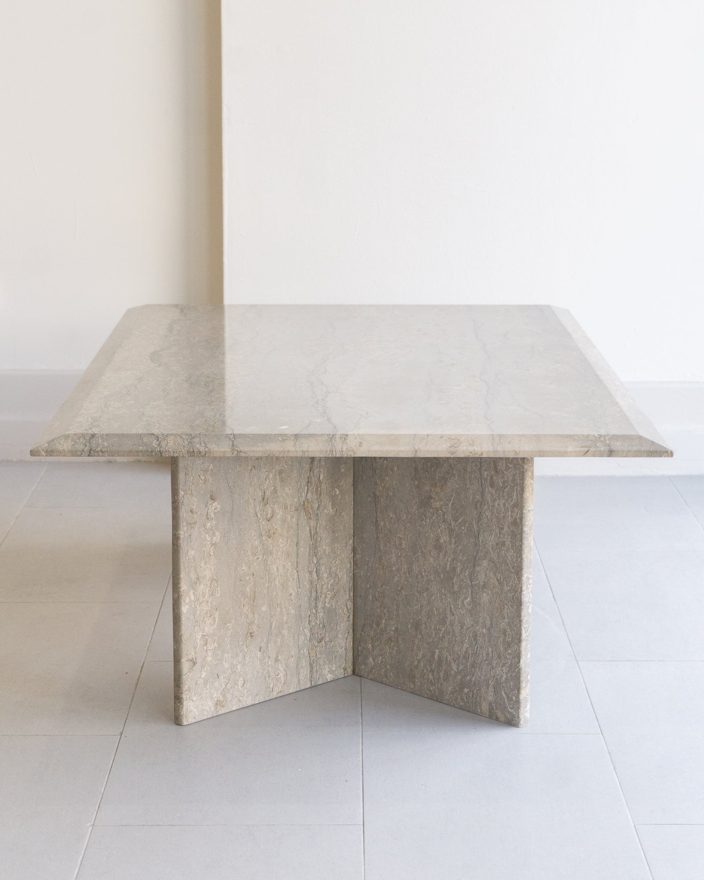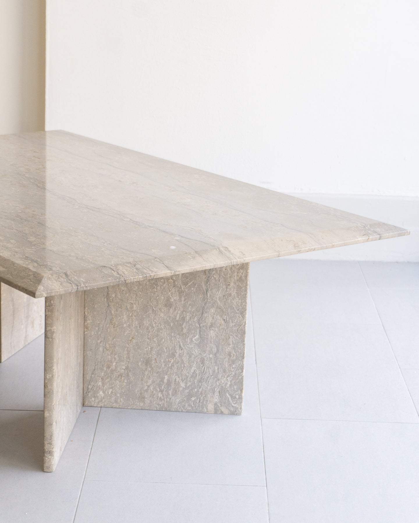 Large vintage coffee table made with Italian silver travertine, light grey base tone with grey veining and beige/ white stone. chamfered edge top on a V-shaped base.