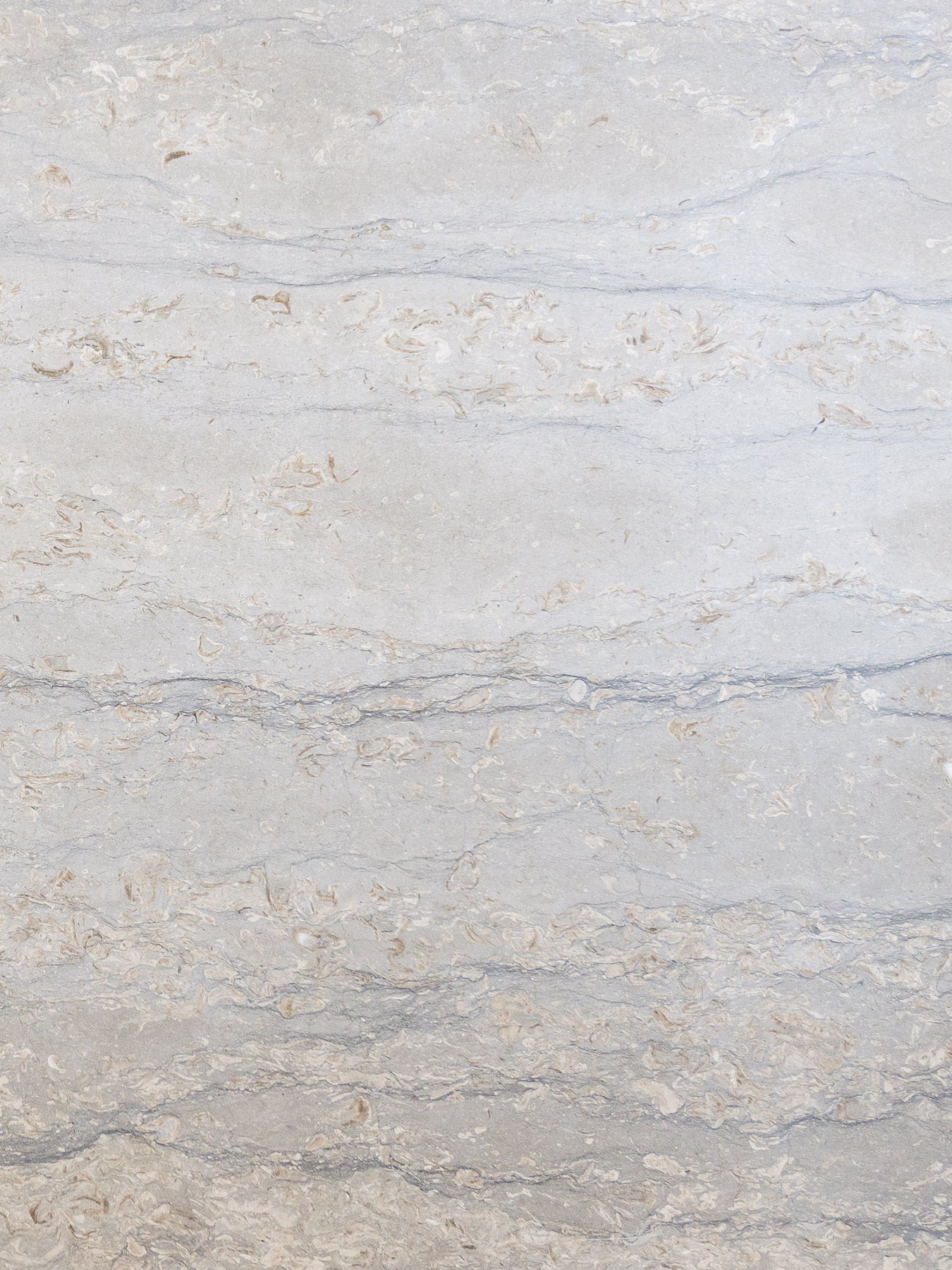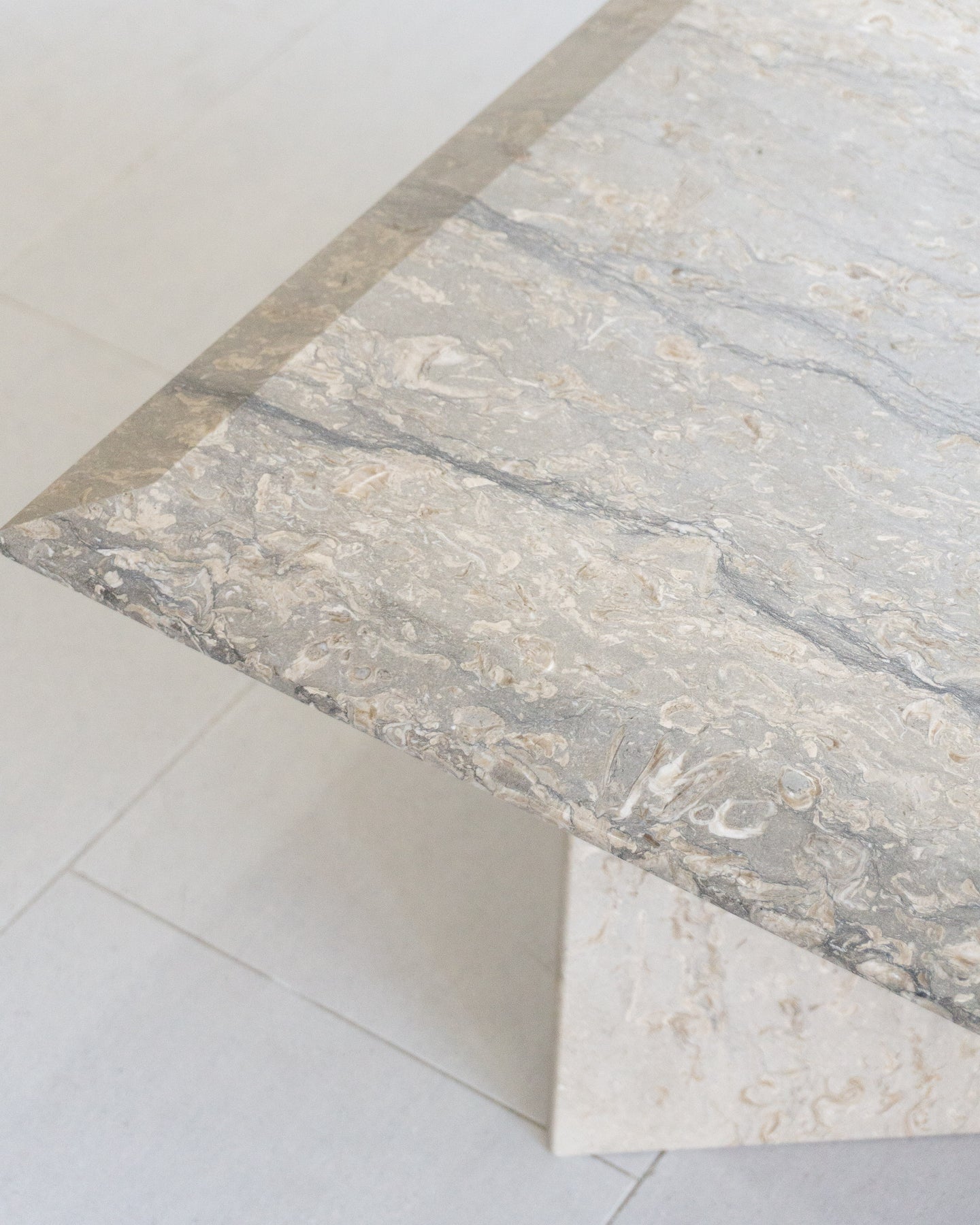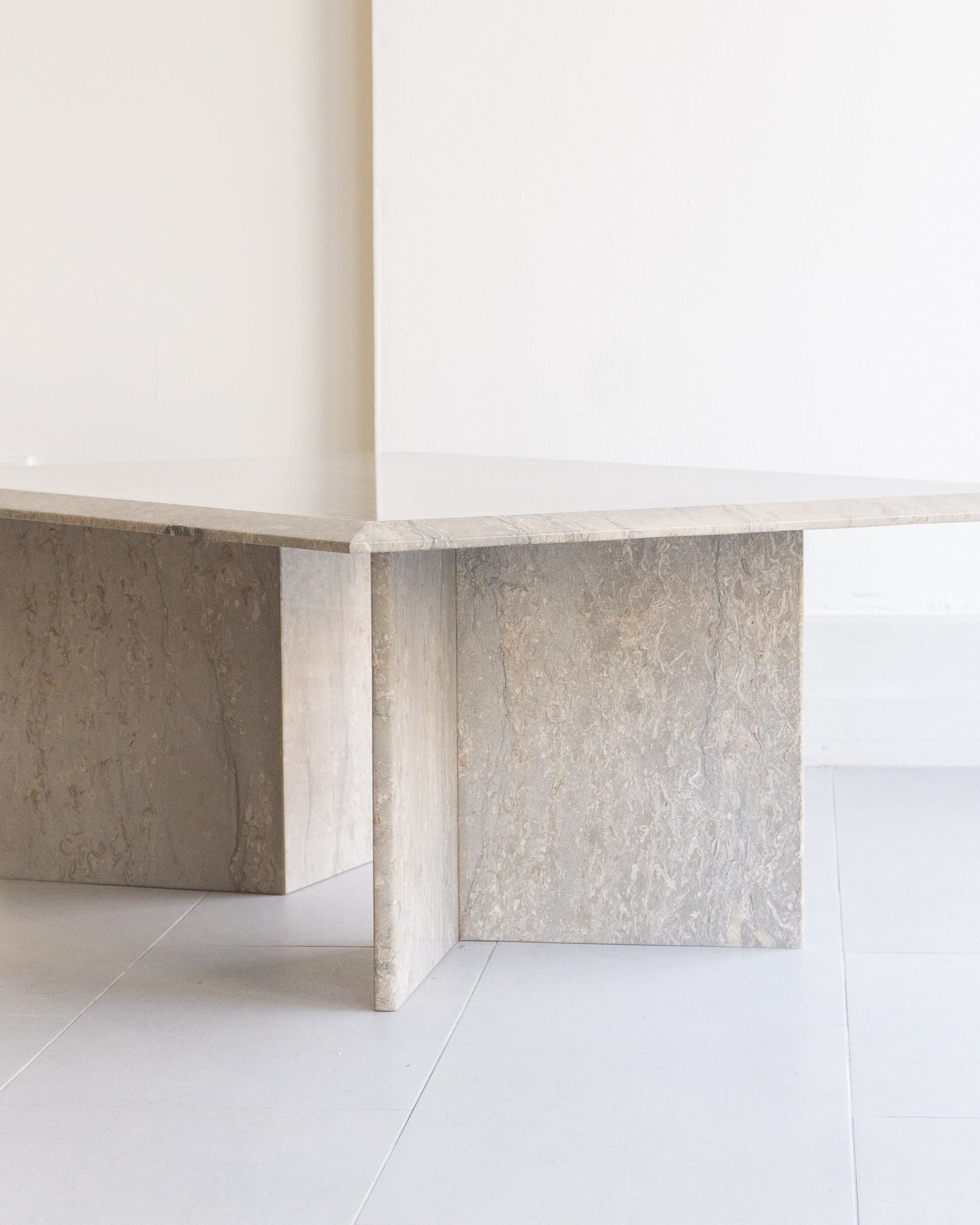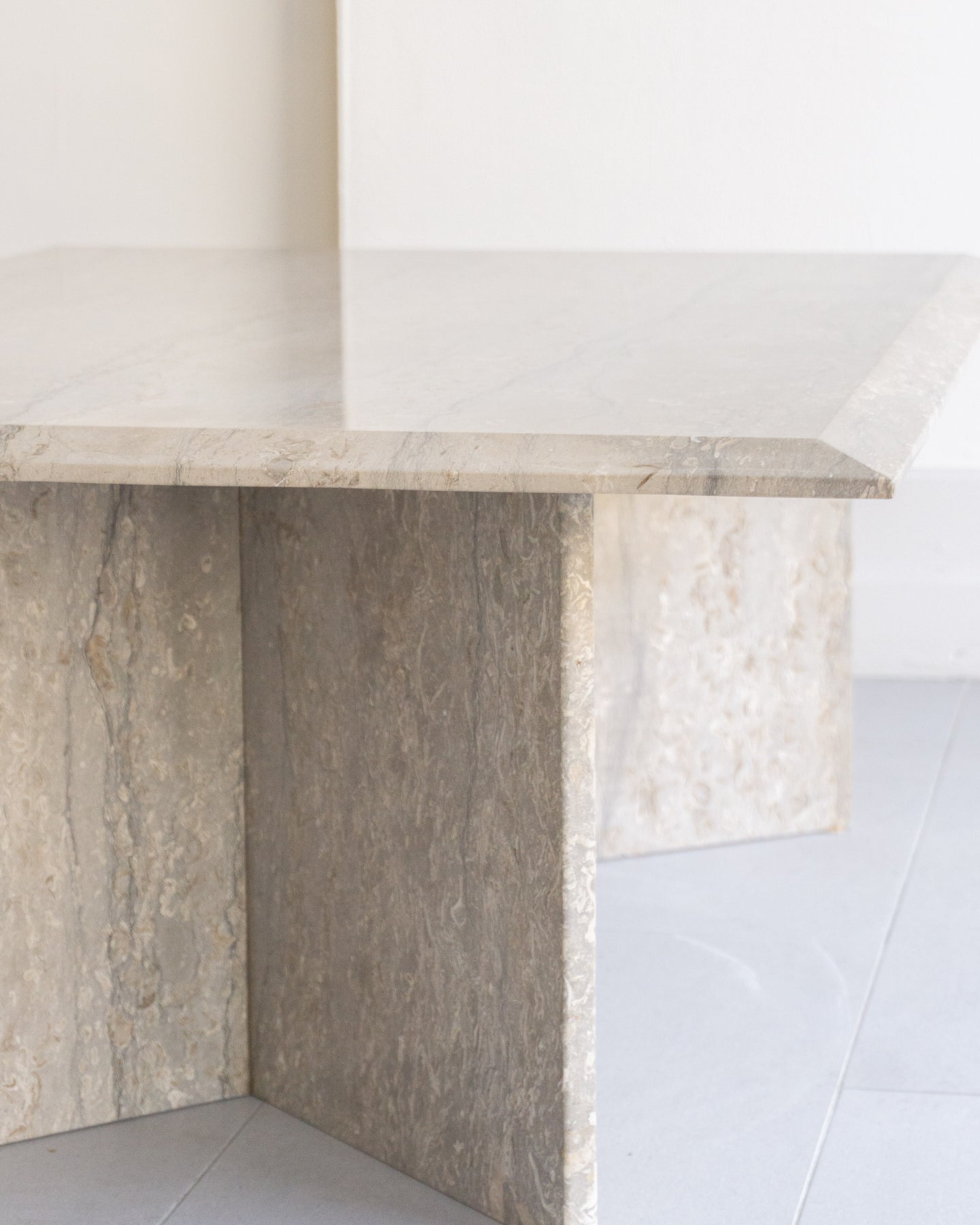 Large vintage coffee table made with Italian silver travertine, light grey base tone with grey veining and beige/ white stone. chamfered edge top on a V-shaped base.